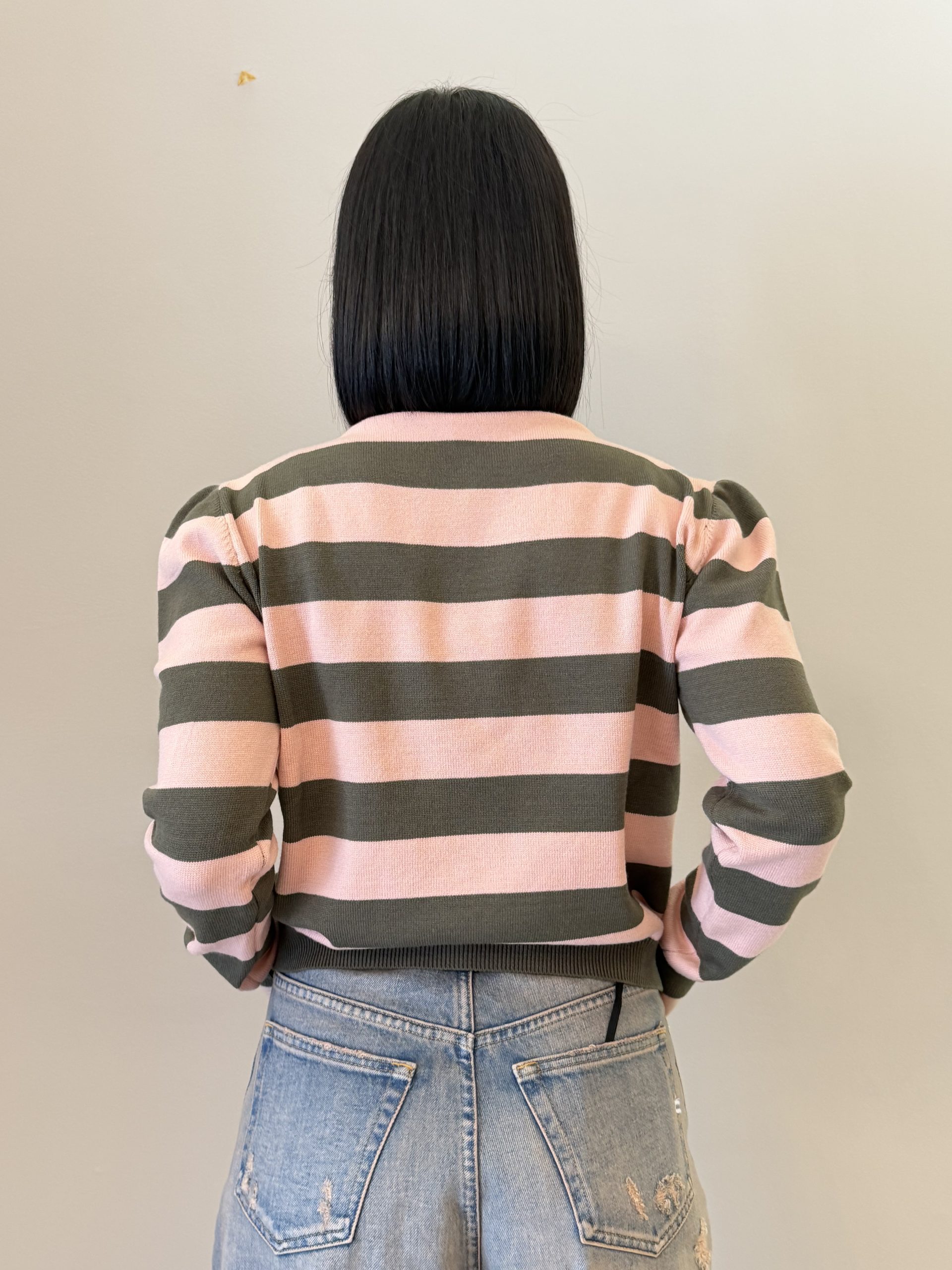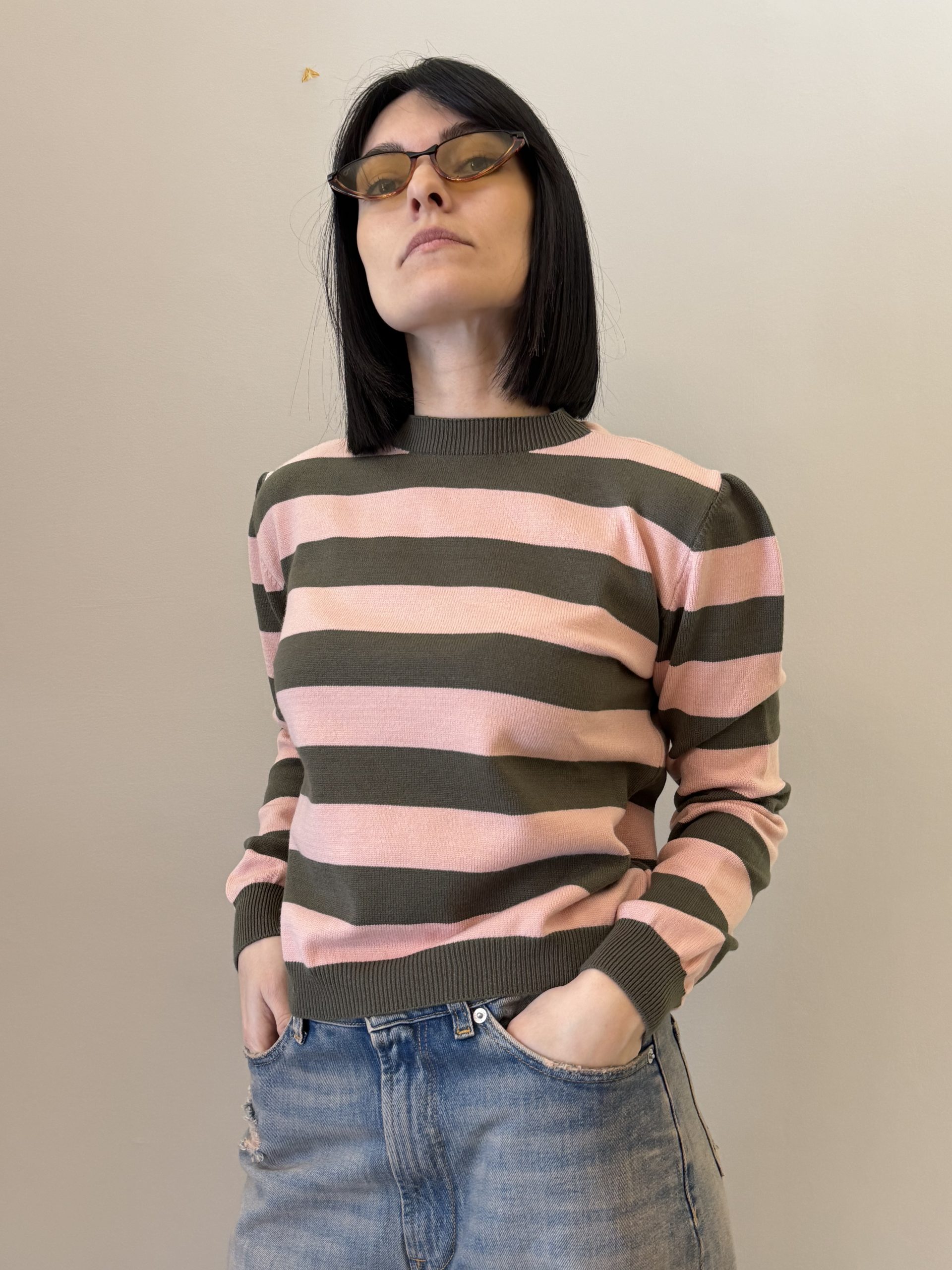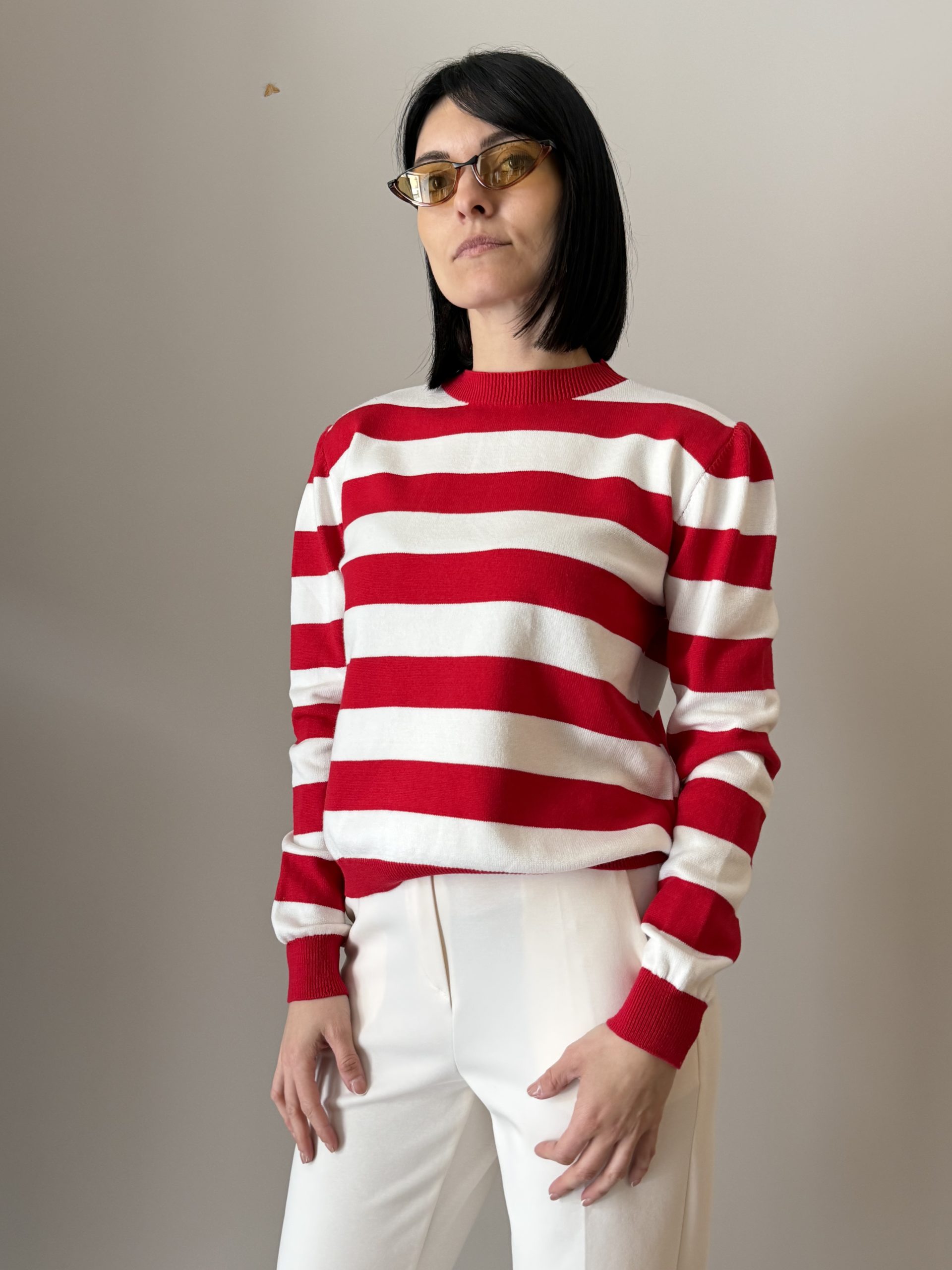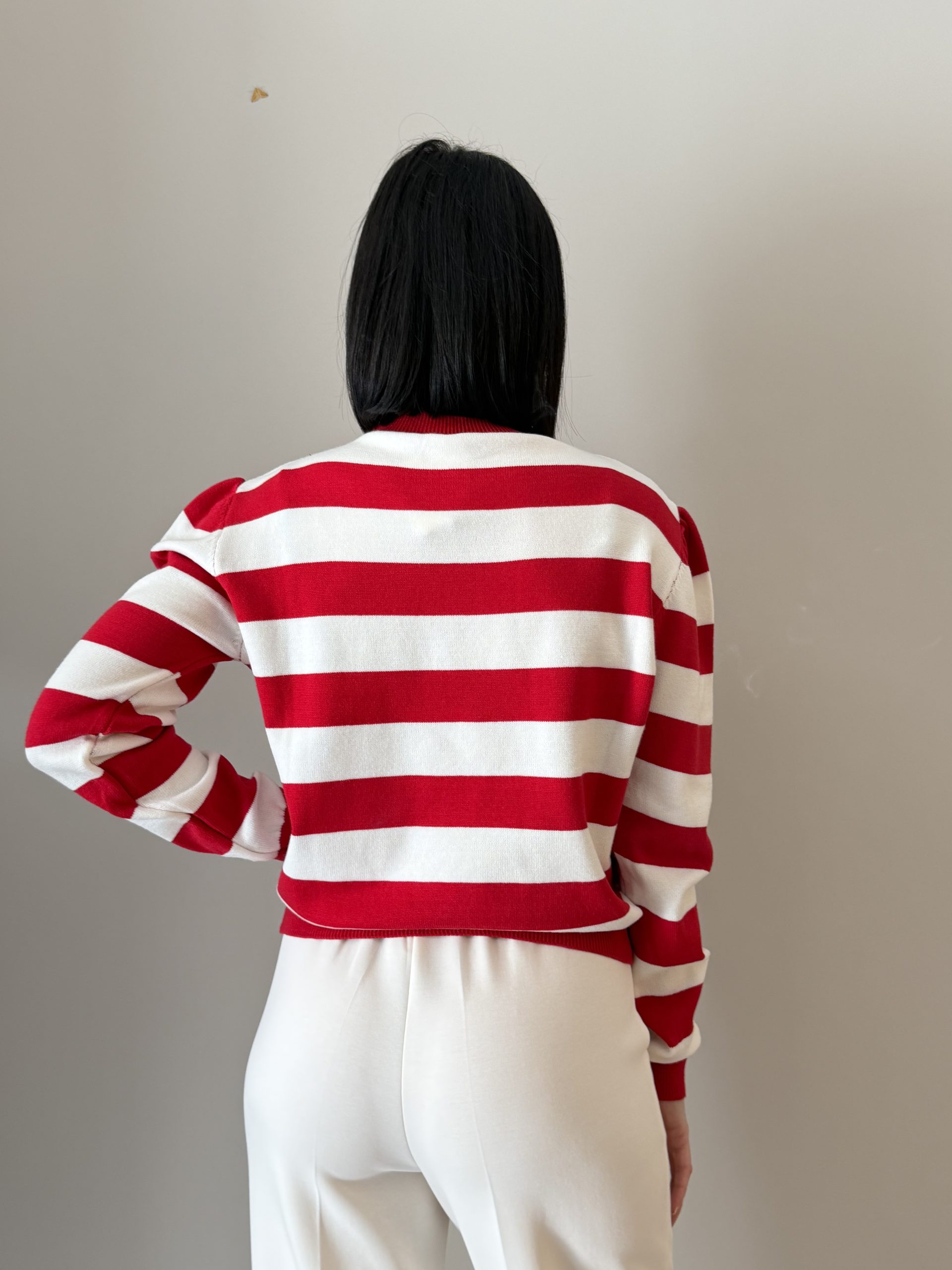 Dettagli: Collo paricollo; motivo a righe; maniche lunghe; polsini a costine; fondo a costine; lavorazione in maglia; linea morbida.