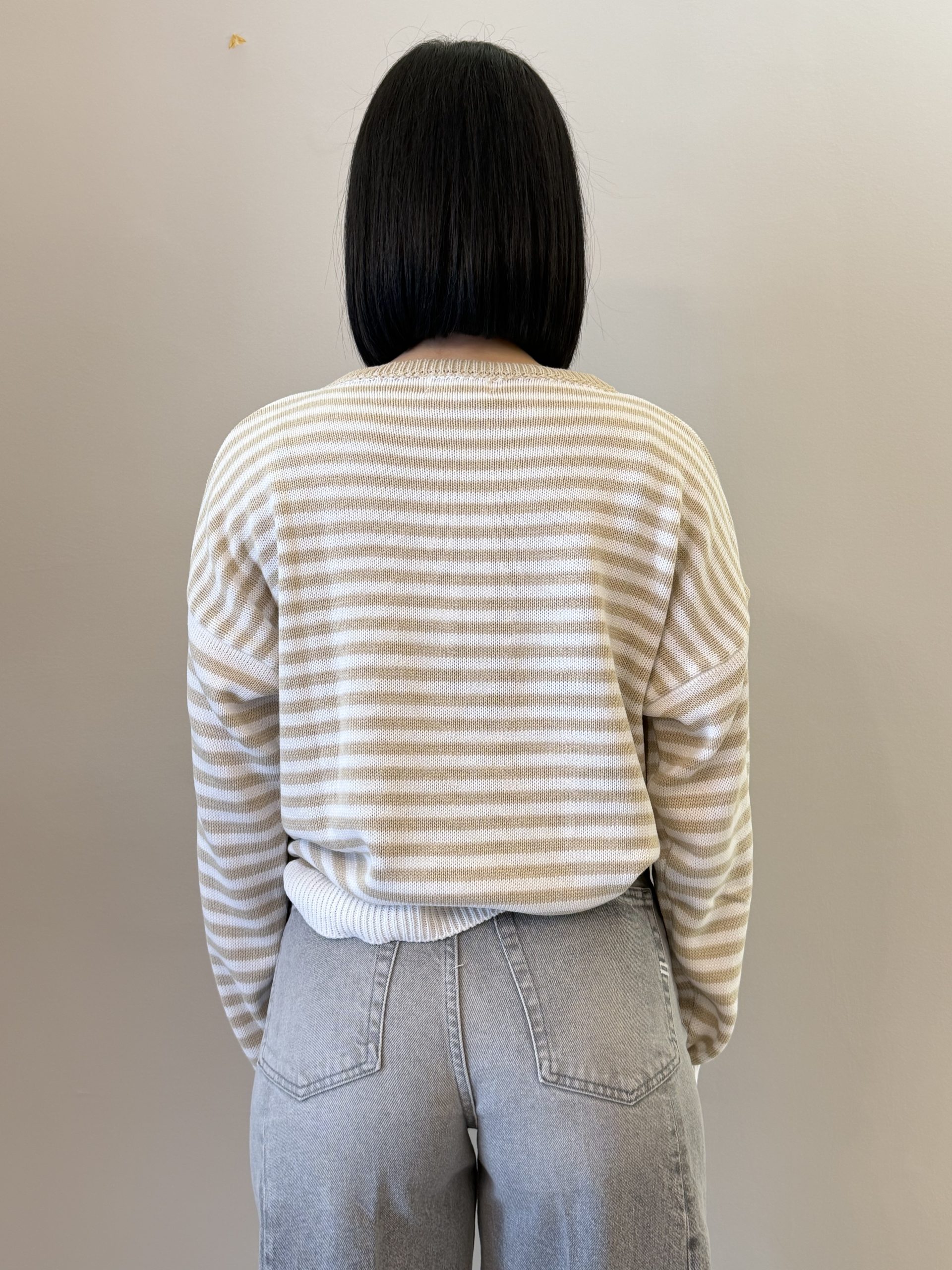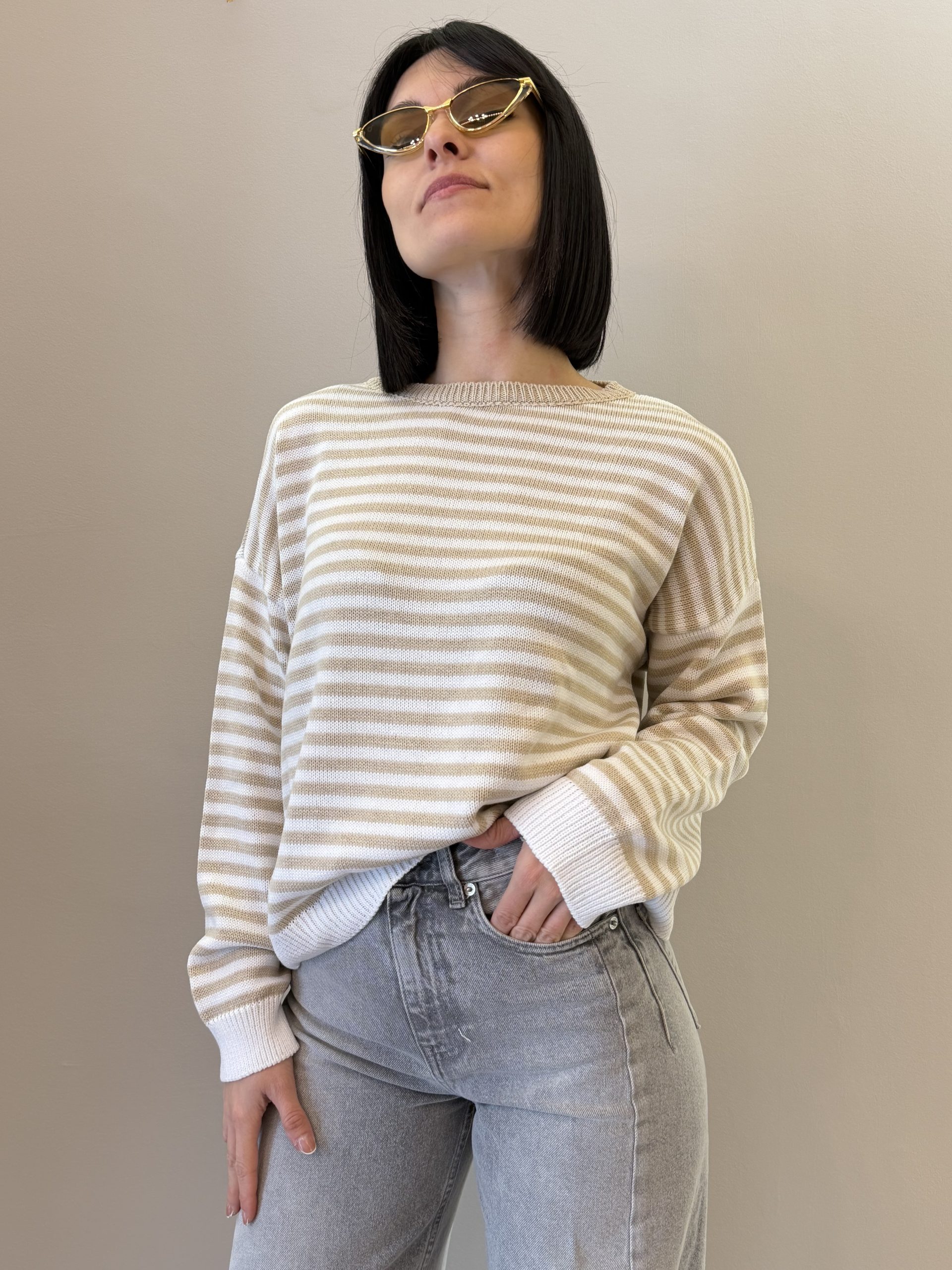 Motel Maglia in filo dal design casual e raffinato caratterizzata da una lavorazione a righe che dona al capo uno stile fresco e contemporaneo. Realizzata in filato morbido, garantisce comfort e leggerezza risultando perfetta per look quotidiani e versatili.