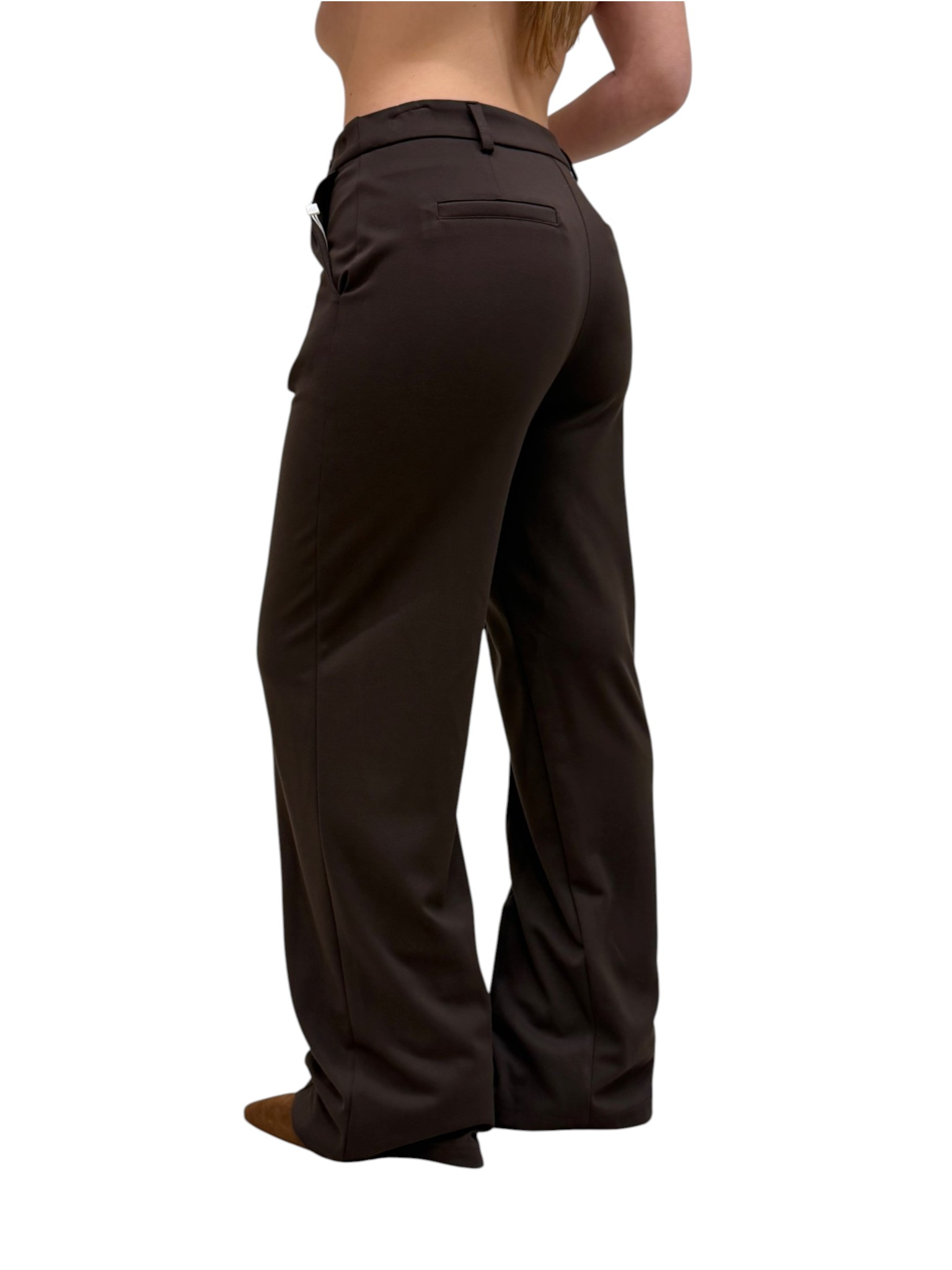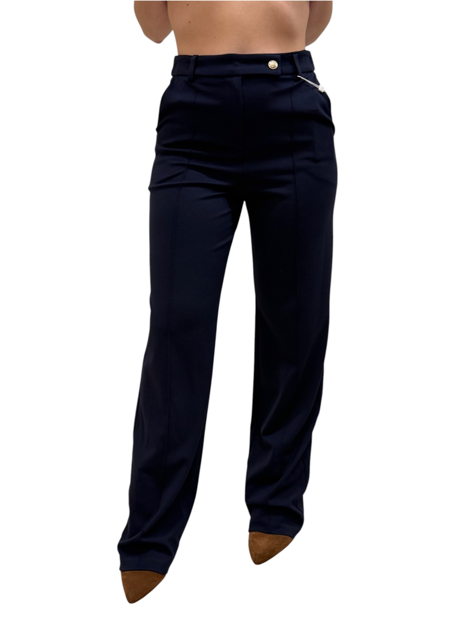 Pantalone lungo palazzo a vita media con linea ampia.