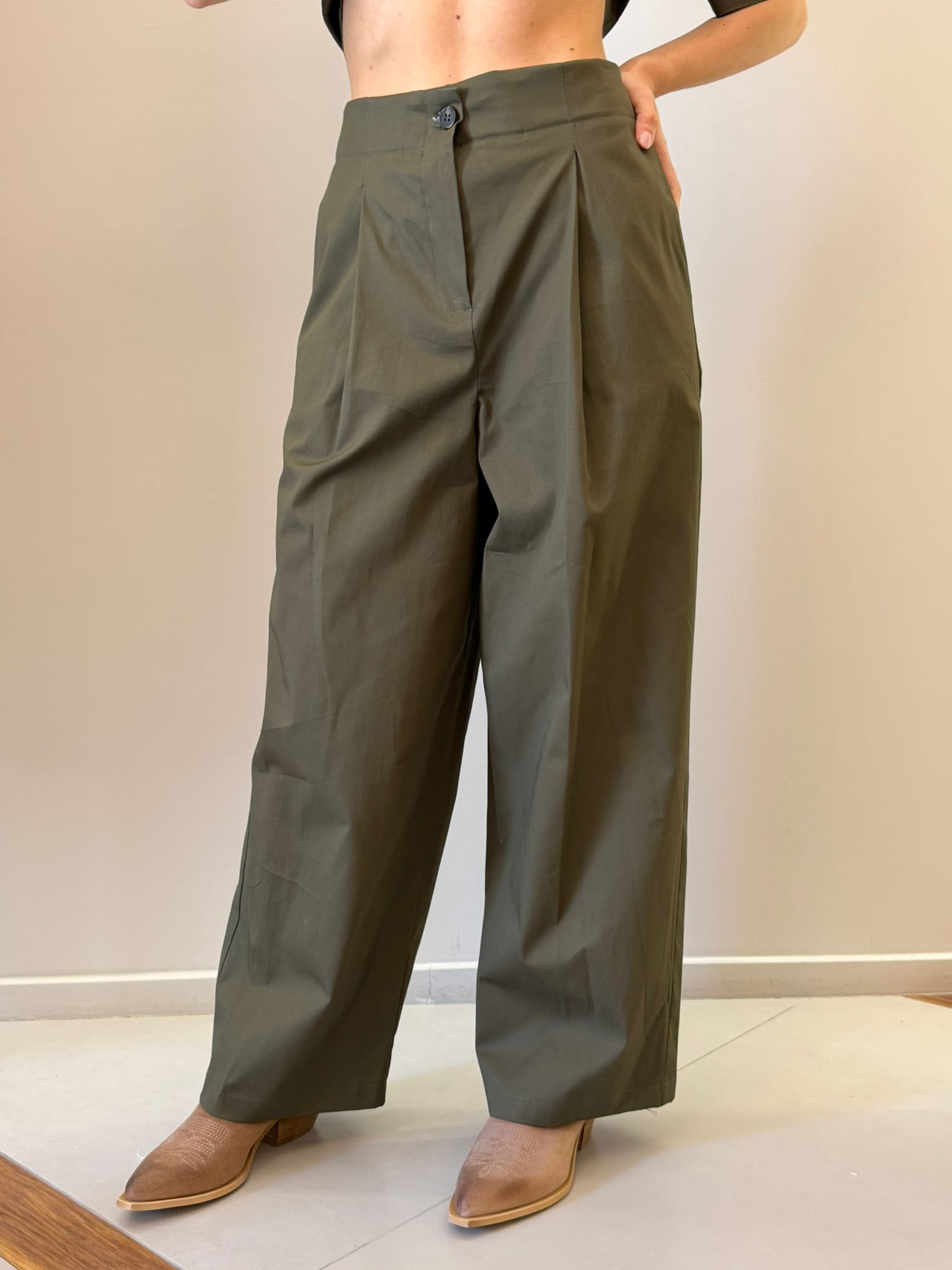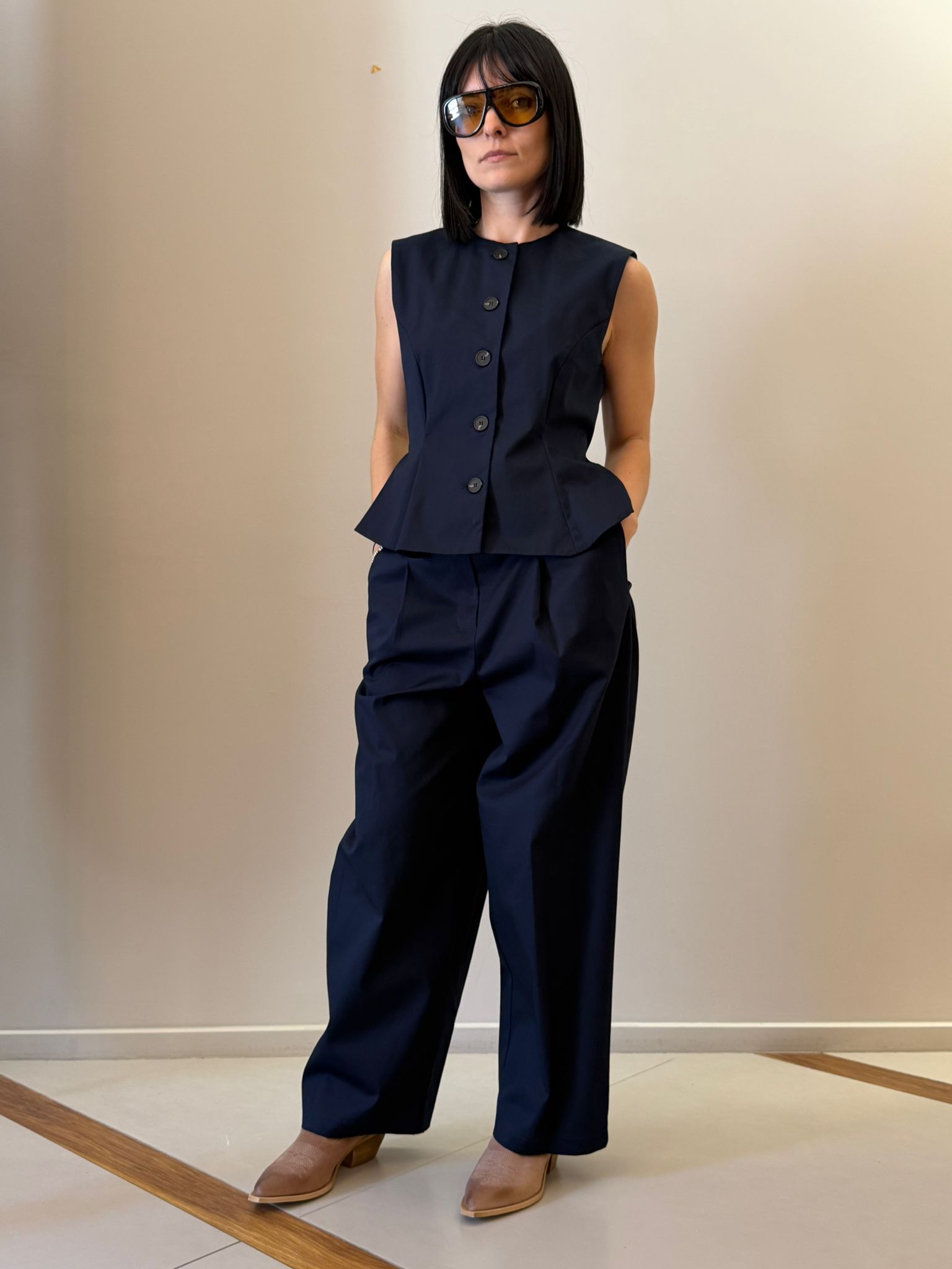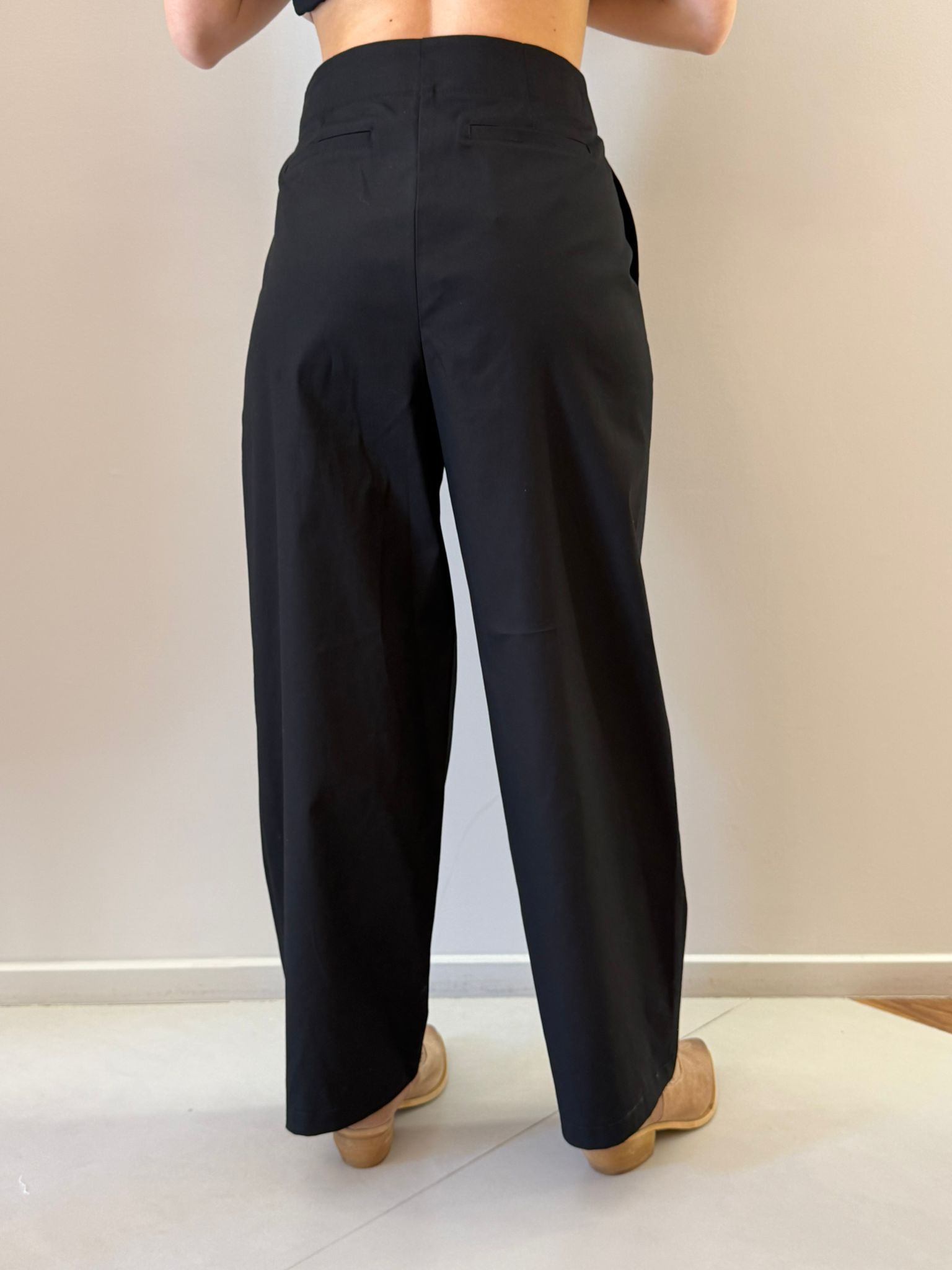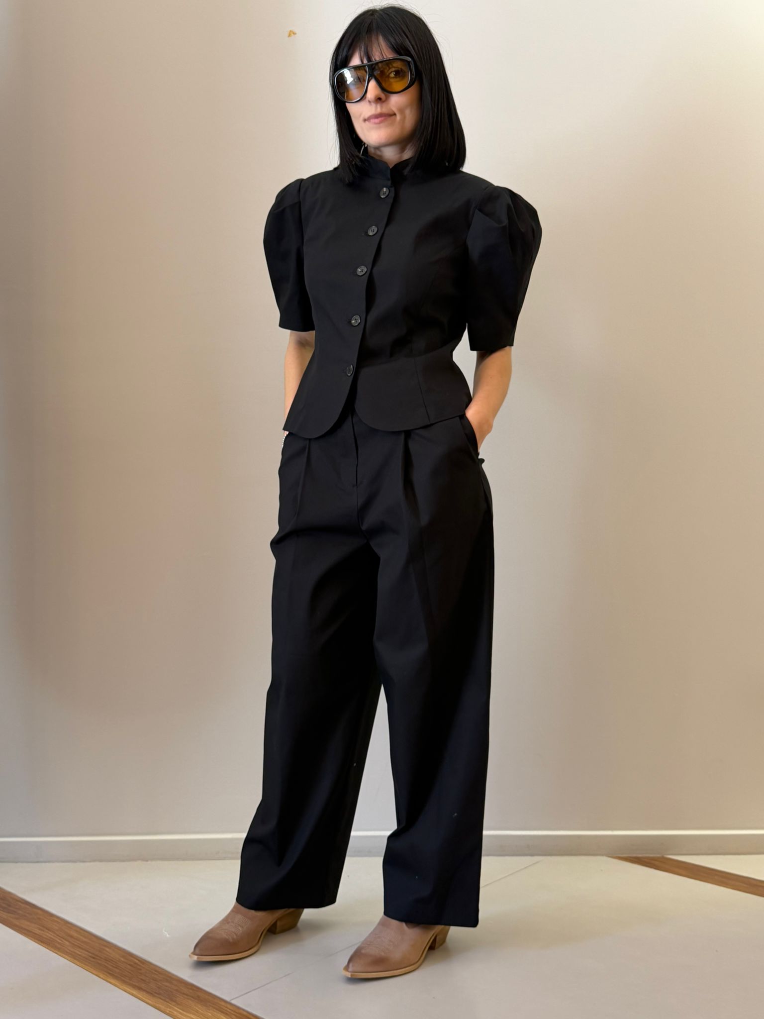 La linea ampia e fluida, arricchita dalle pinces frontali, dona movimento e struttura al capo, creando un equilibrio perfetto tra comfort e stile. La vita pulita e la costruzione sartoriale garantiscono una vestibilità impeccabile.
