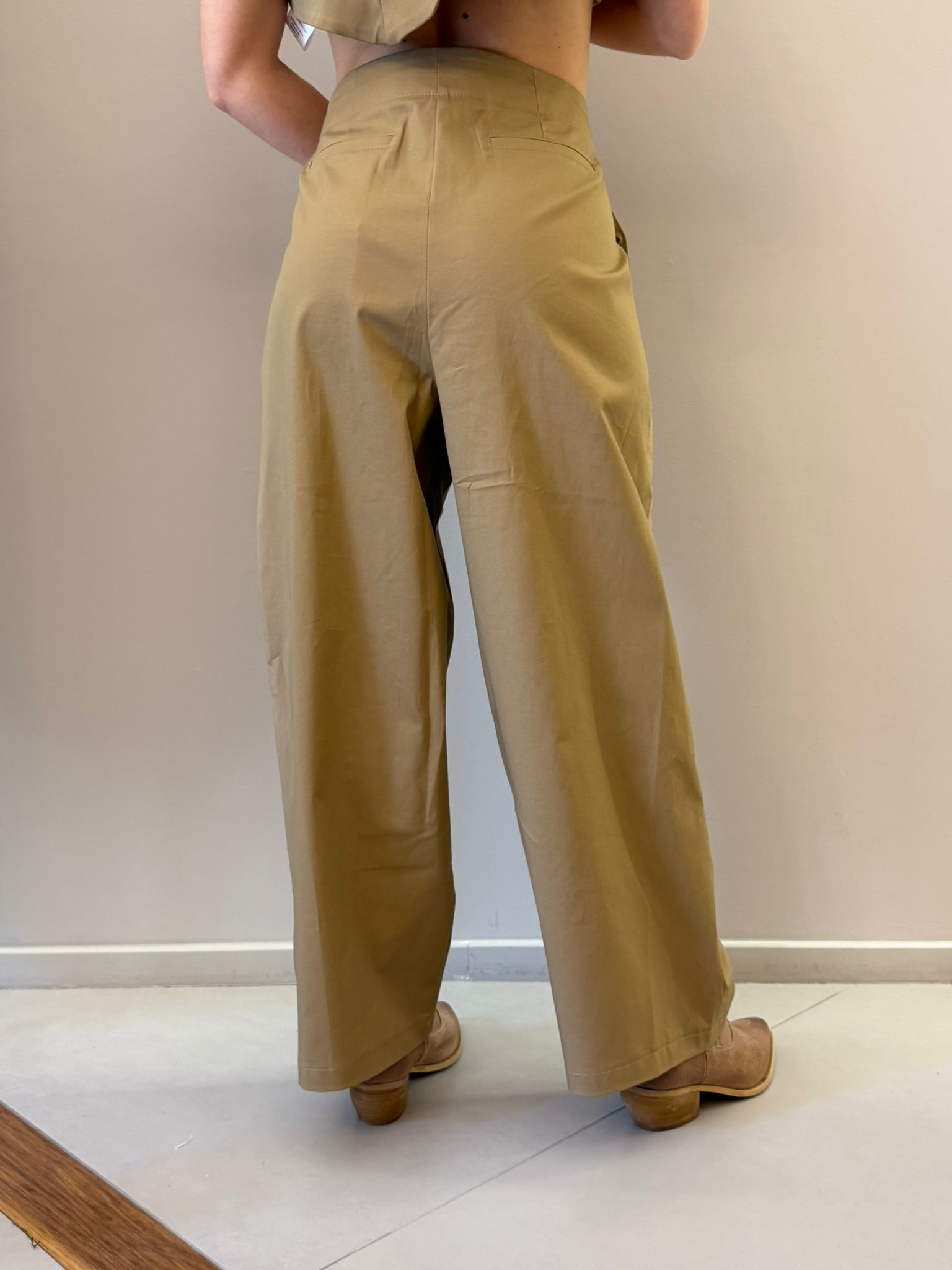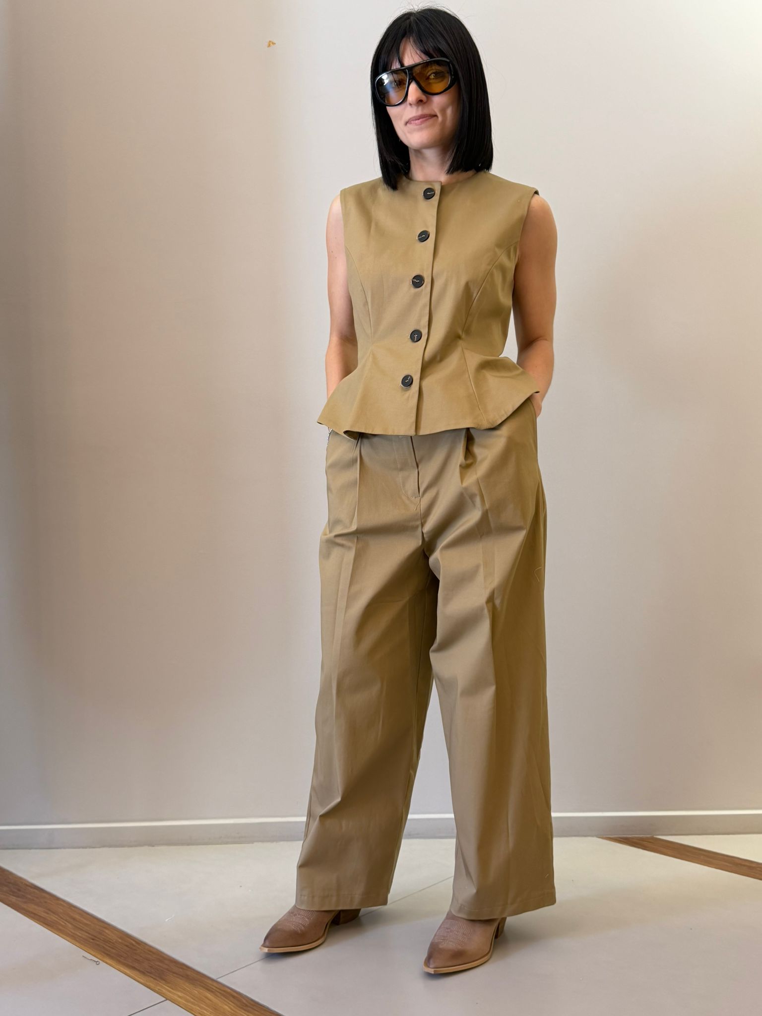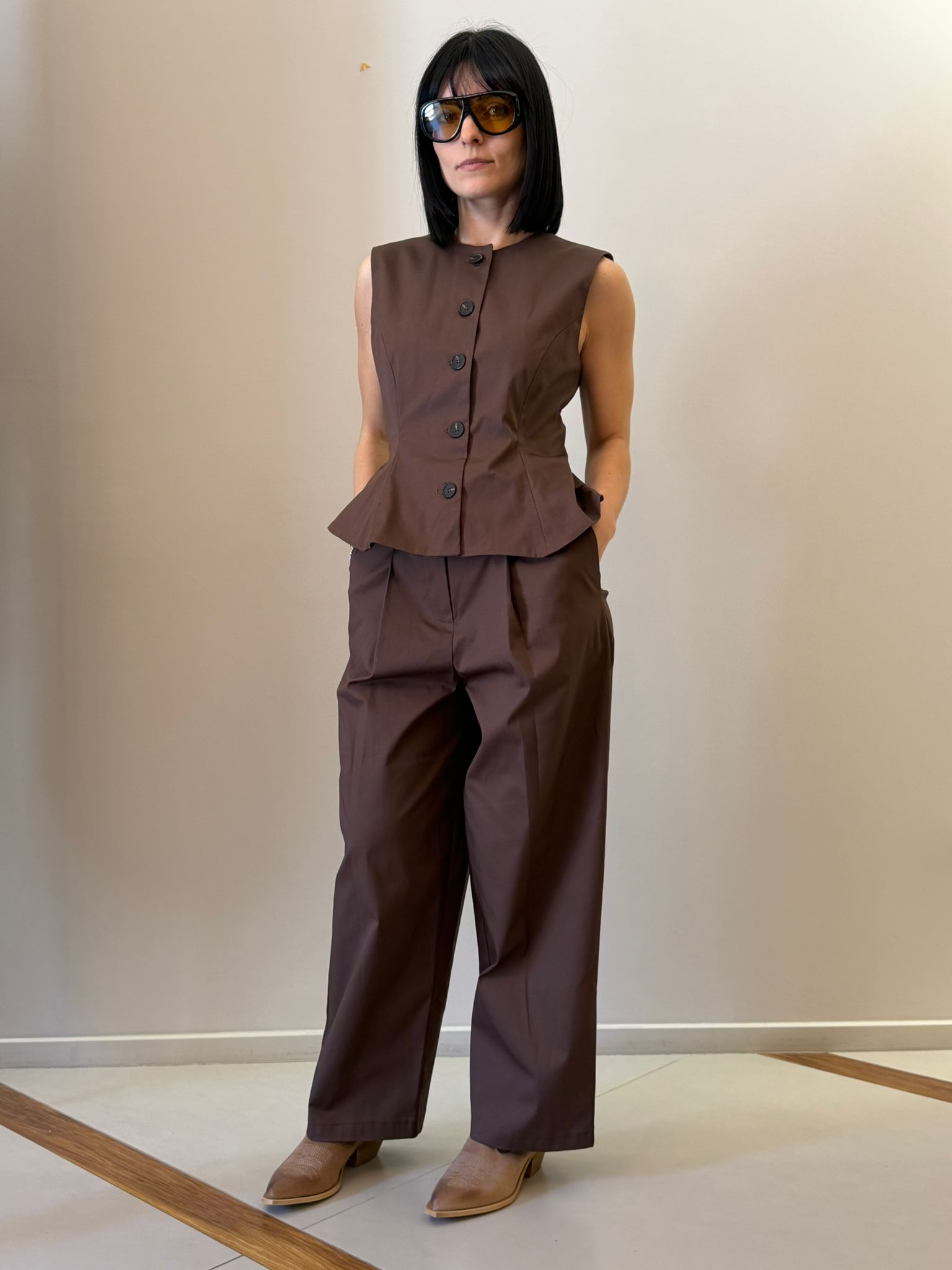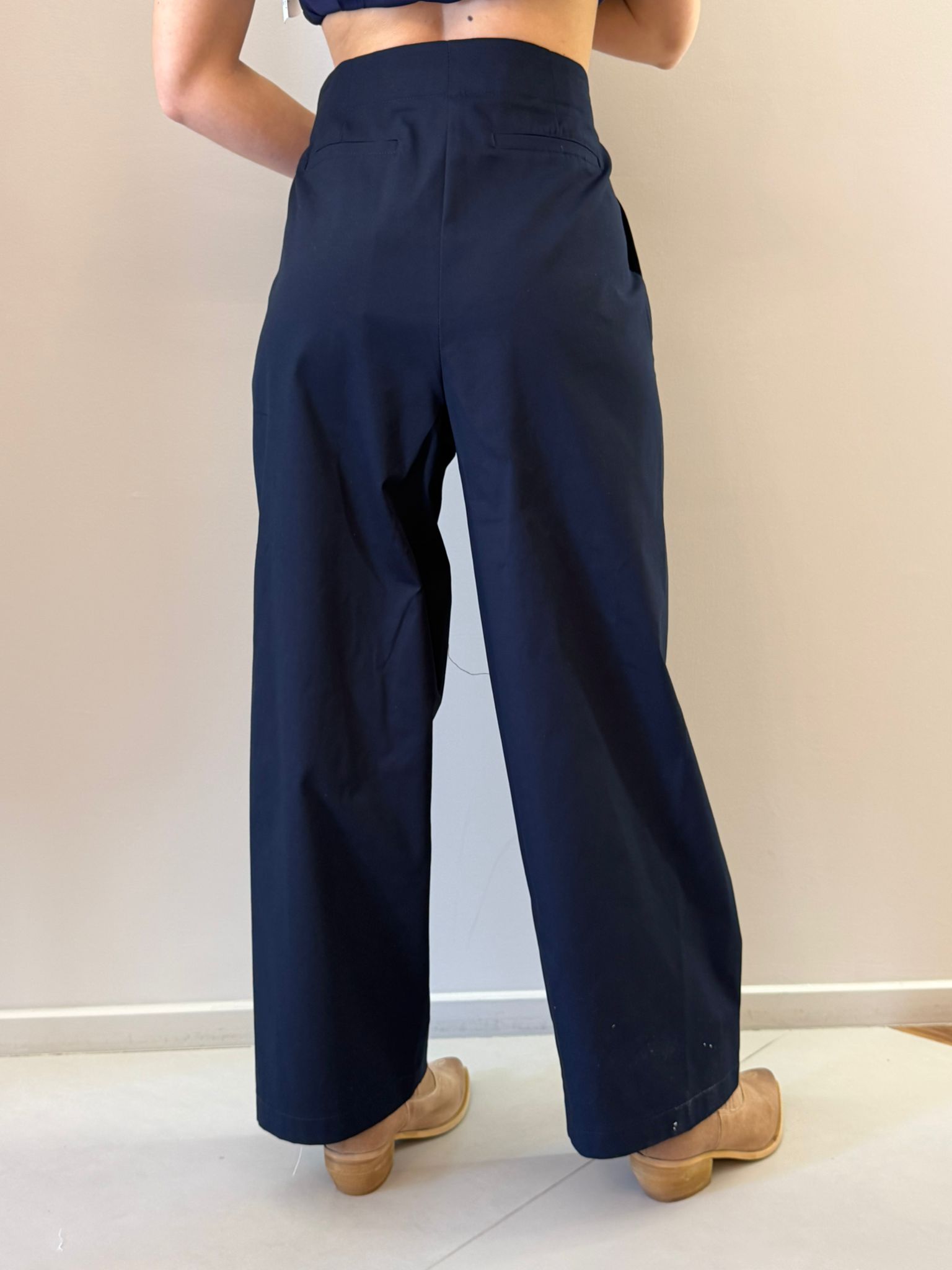 La linea ampia e fluida, arricchita dalle pinces frontali, dona movimento e struttura al capo, creando un equilibrio perfetto tra comfort e stile. La vita pulita e la costruzione sartoriale garantiscono una vestibilità impeccabile.