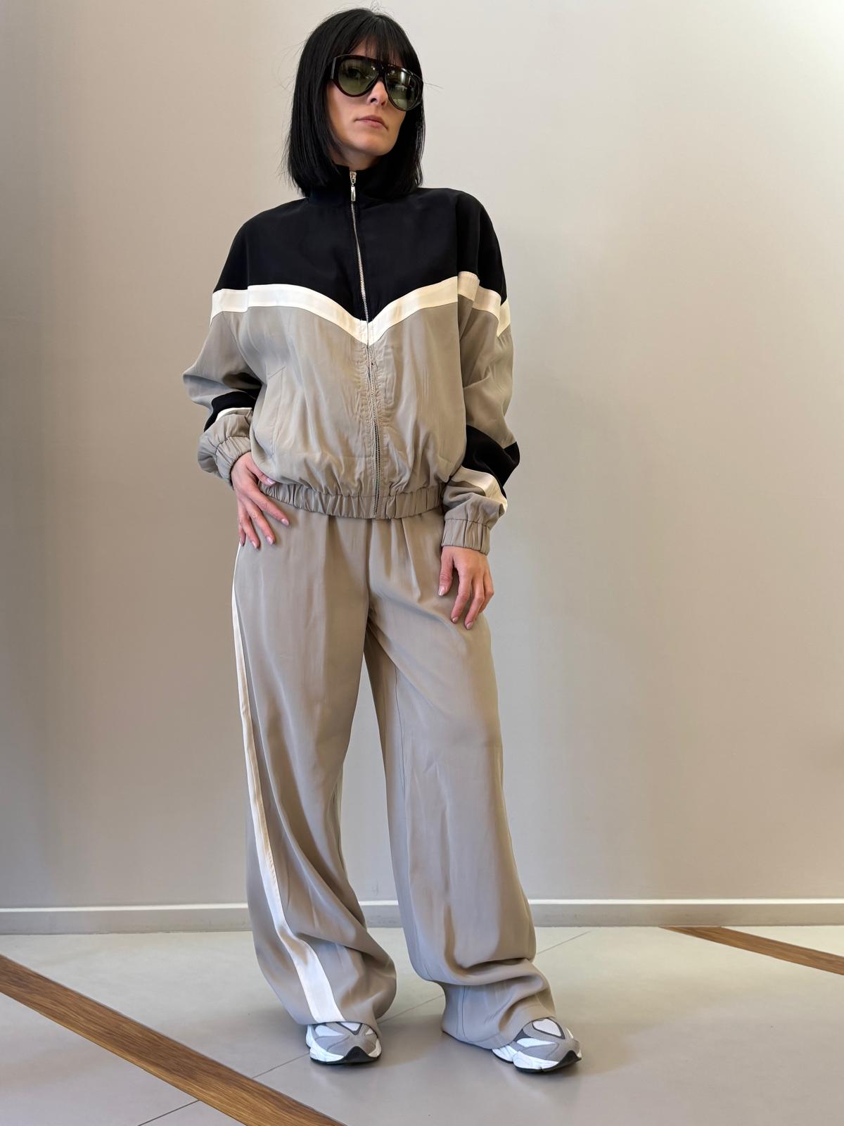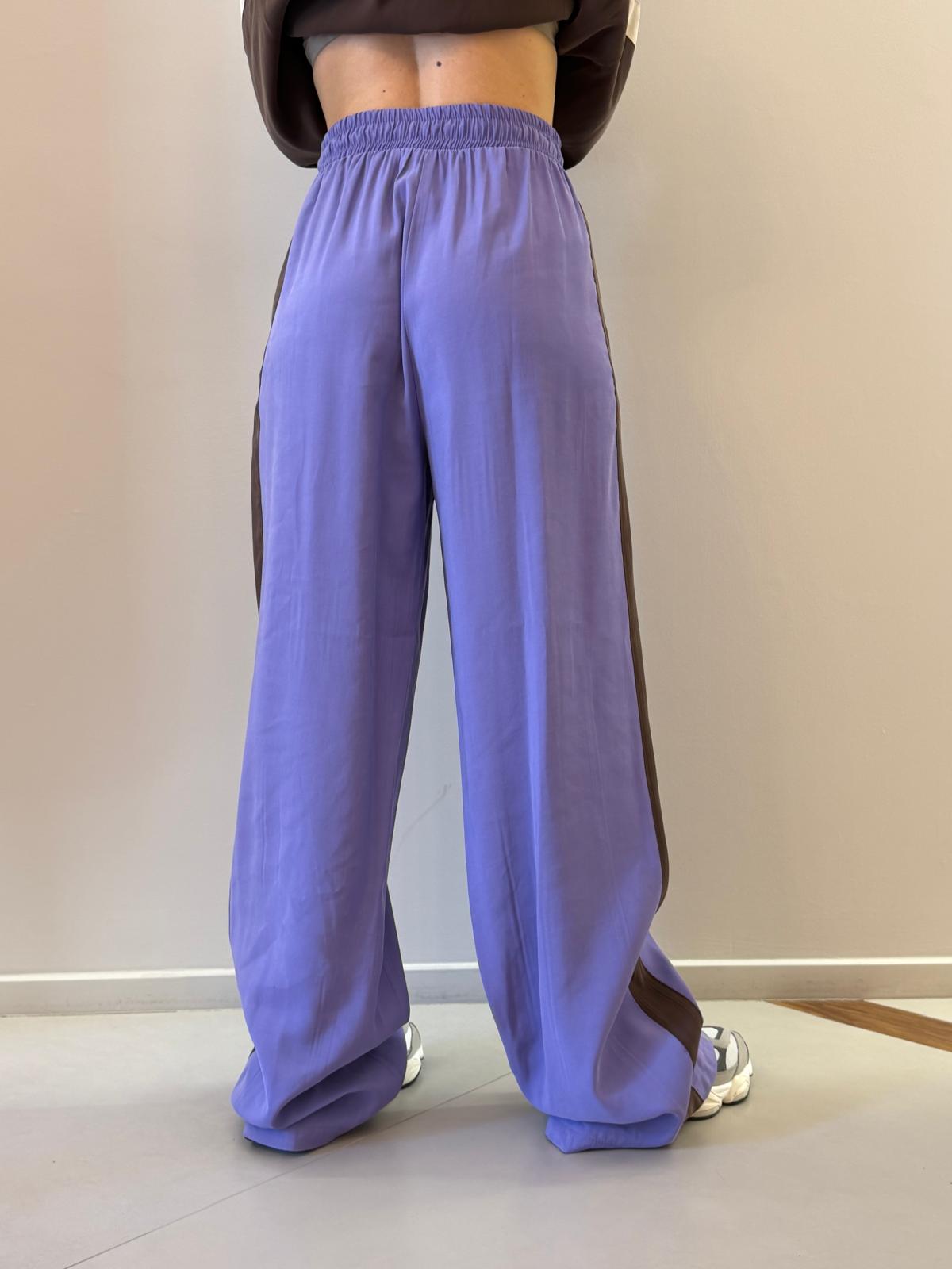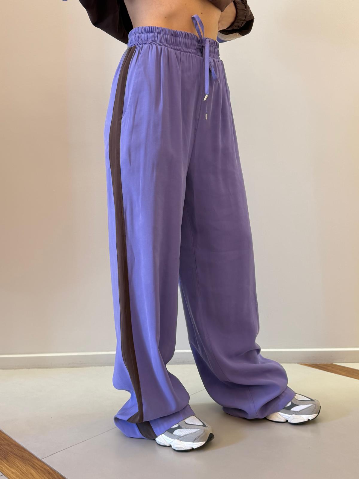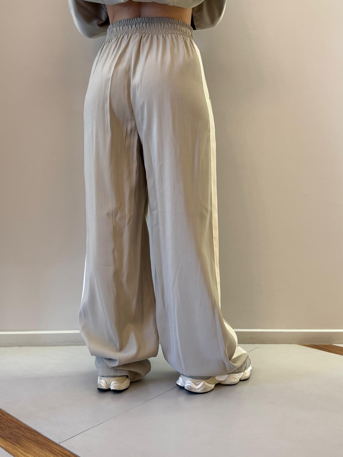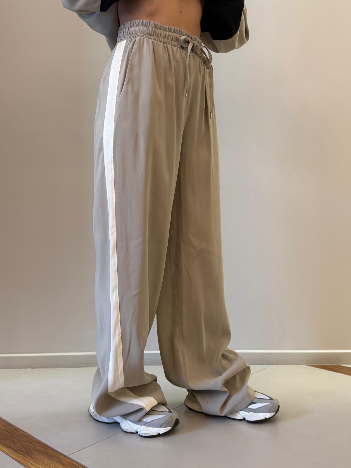 La vita elasticizzata con coulisse garantisce comfort e praticità, mentre la banda laterale a contrasto aggiunge un dettaglio moderno e distintivo, perfetto per uno stile dinamico e ricercato.