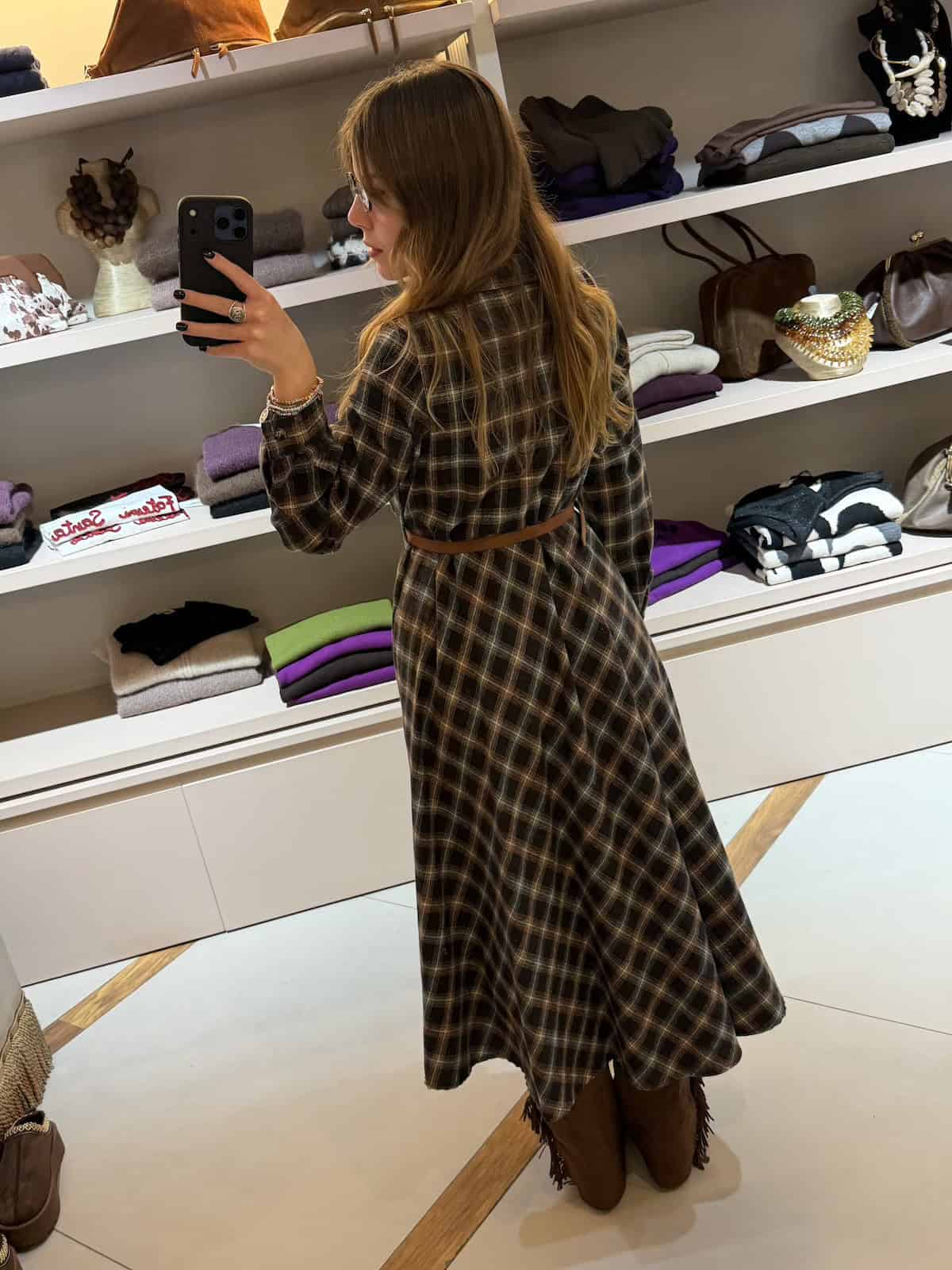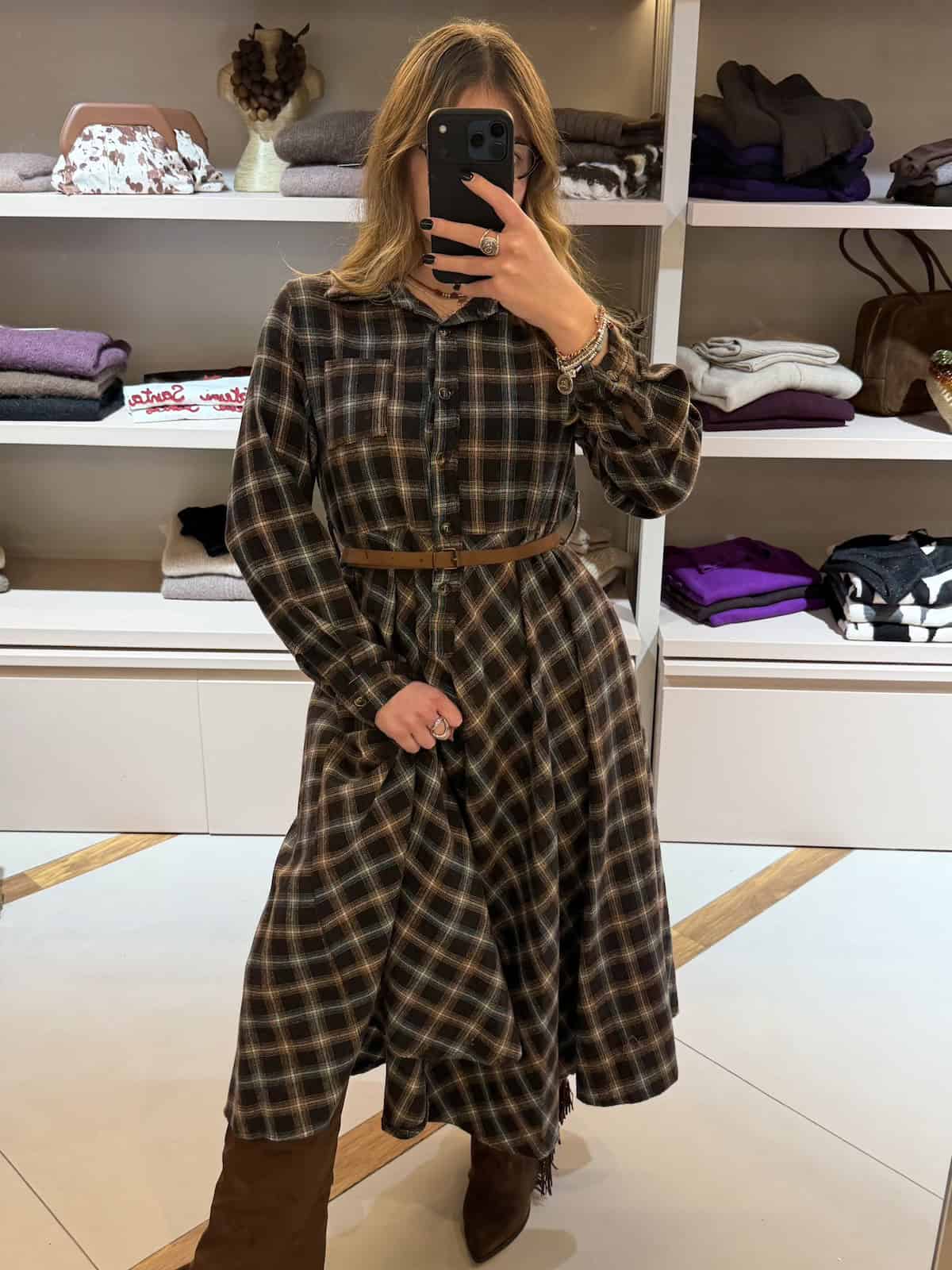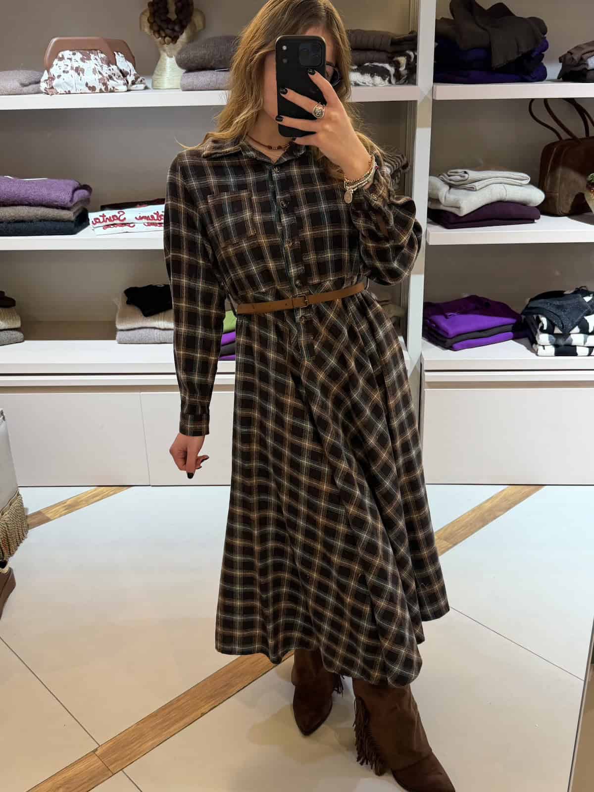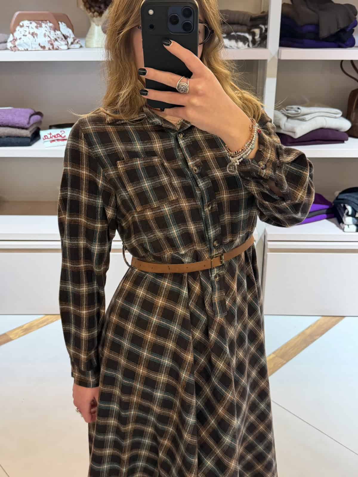 FitByDele abito chemisier lungo a fantasia quadri, caratterizzato da una linea fluida e femminile. Presenta colletto classico, abbottonatura frontale e cintura coordinata per definire il punto vita. Le maniche lunghe con polsino completano il design in stile casual-chic, perfetto per la stagione.