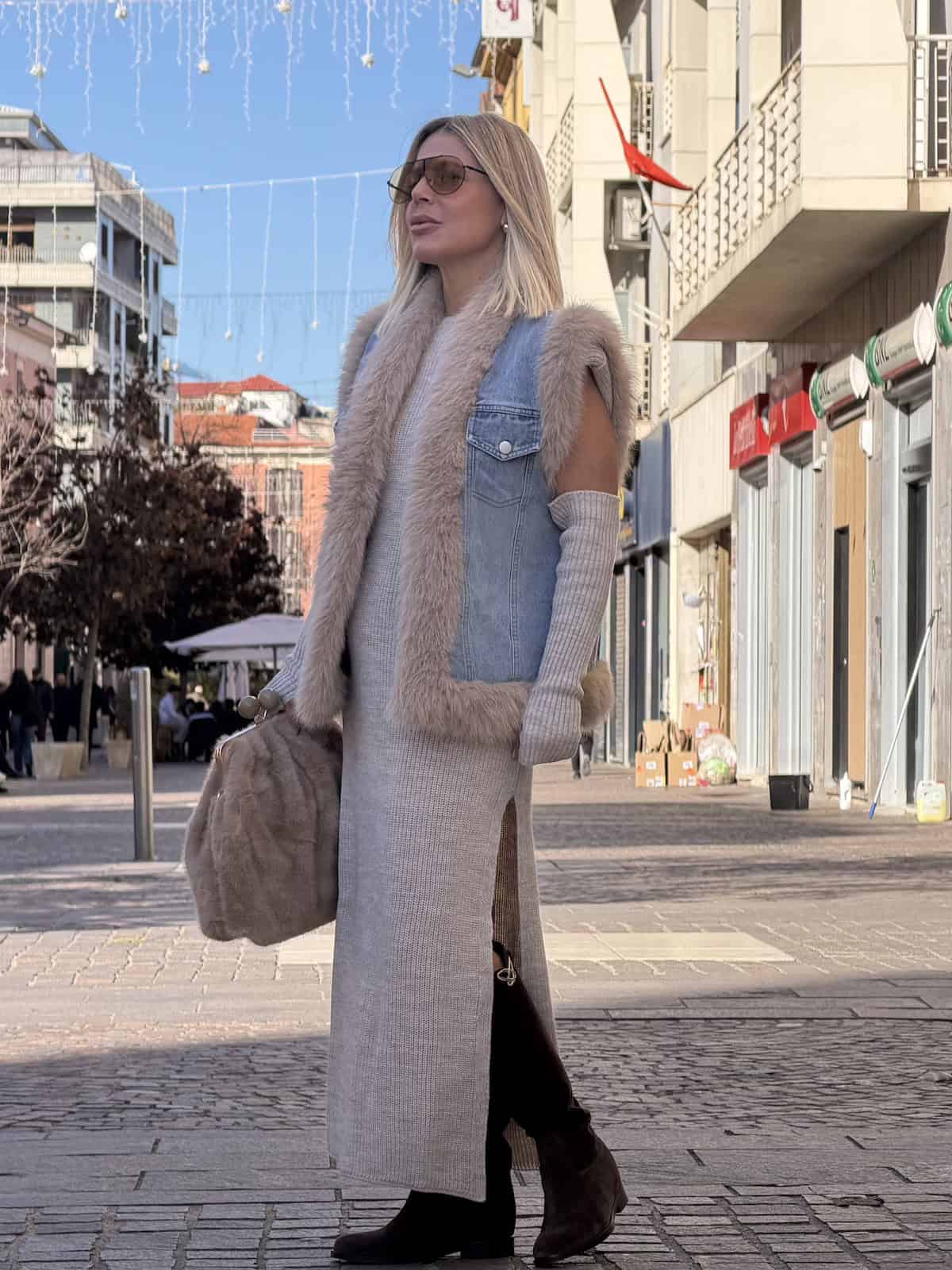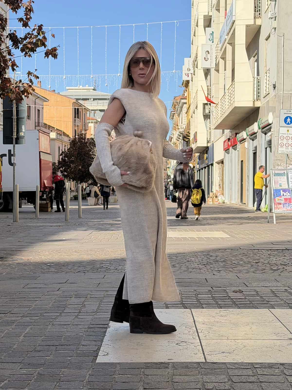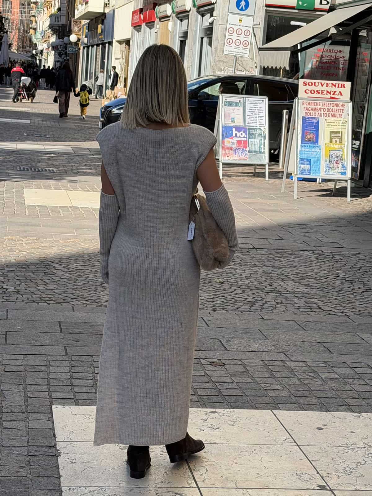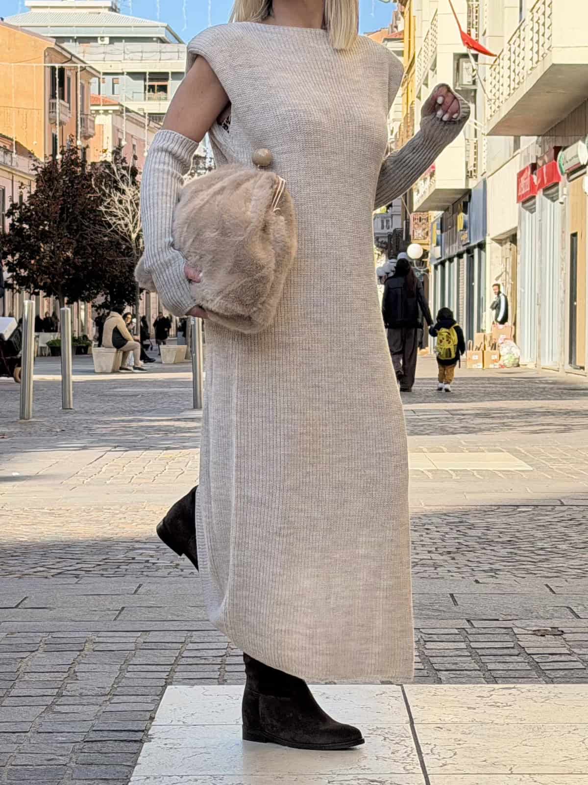 Vicolo abito in maglia lungo senza maniche, caratterizzato da una linea dritta e da spacchi laterali che donano movimento e femminilità. Il modello è completato da manicotti coordinati in maglia a costine, da indossare separatamente o insieme per un effetto più ricercato.