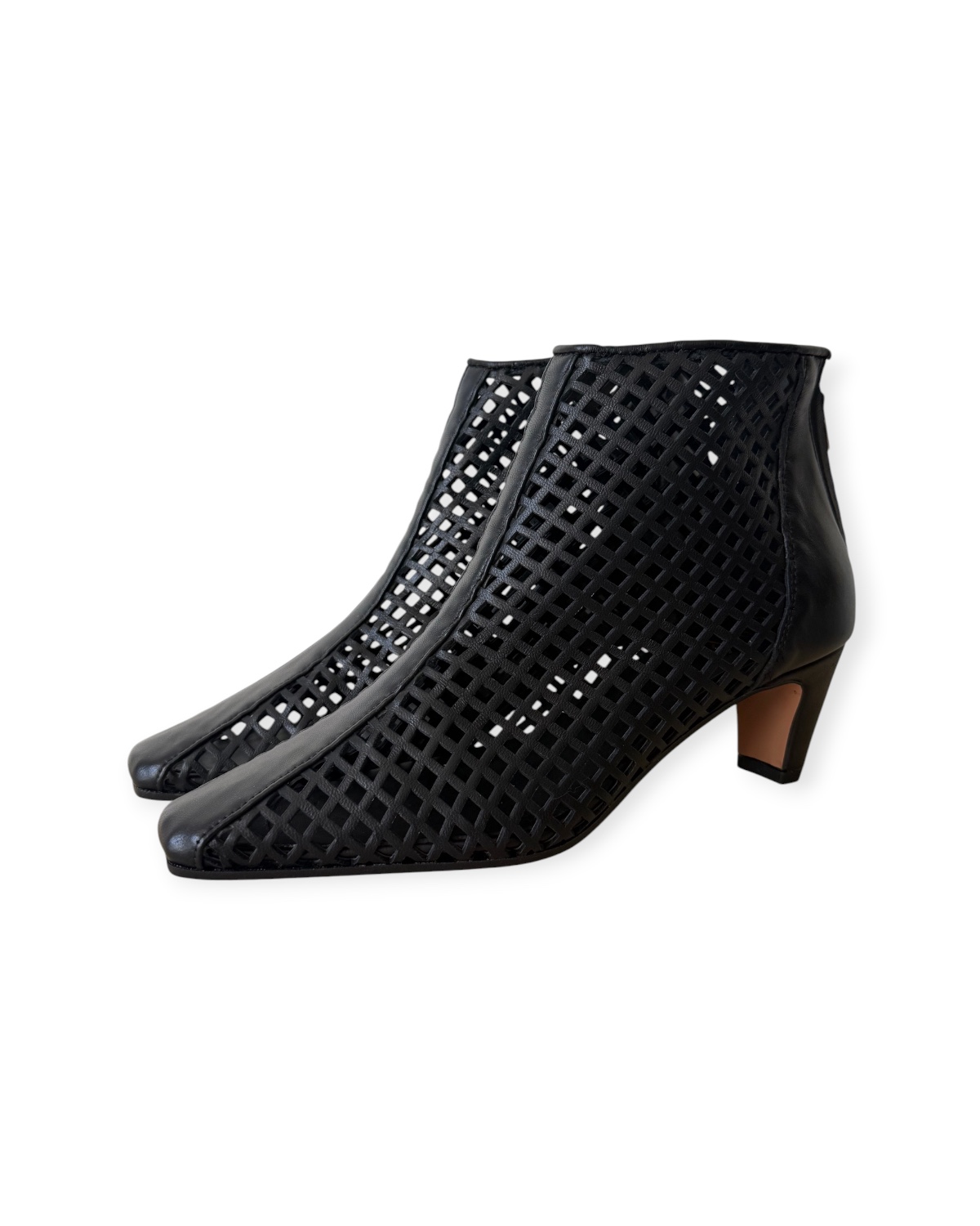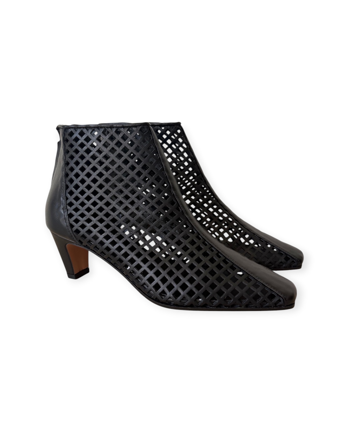 Tronchetto con punta affusolata, tomaia traforata e tacco di media altezza.