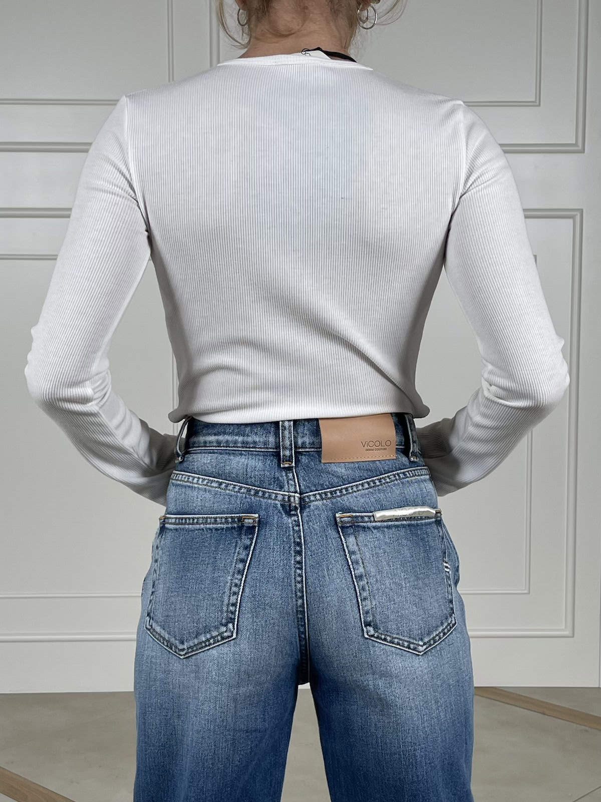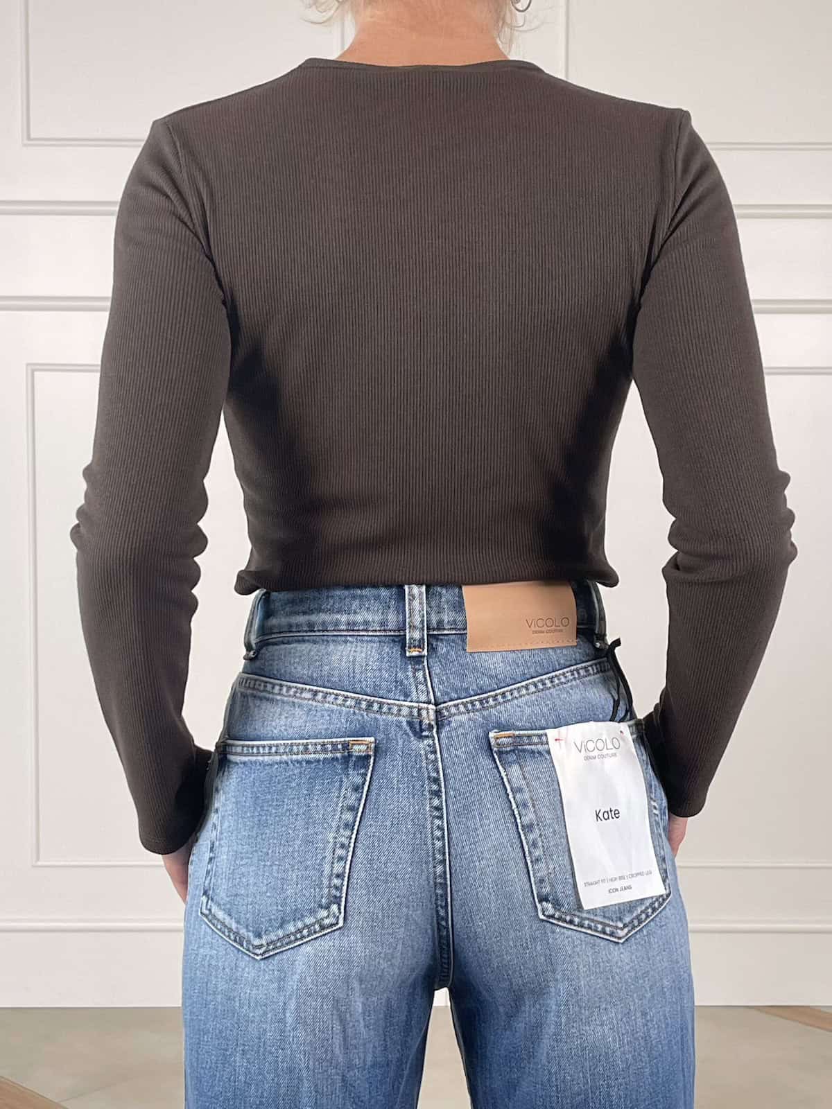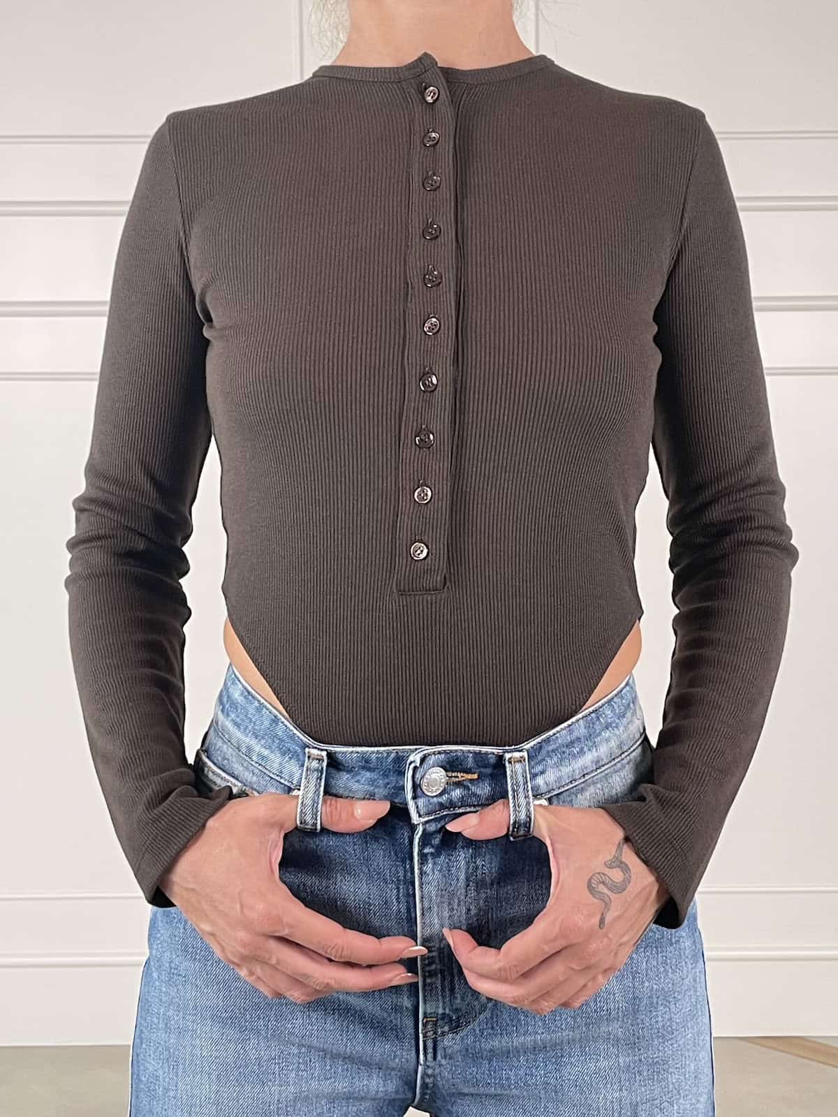 Vicolo body in costina con bottoni. Manica lunga dallo stile essenziale ma grintoso, con scollo a serafino arricchito da una fila di bottoni che donano un tocco minimal chic. Il taglio aderente esalta la silhouette, perfetto da indossare dentro jeans o pantaloni sartoriali.