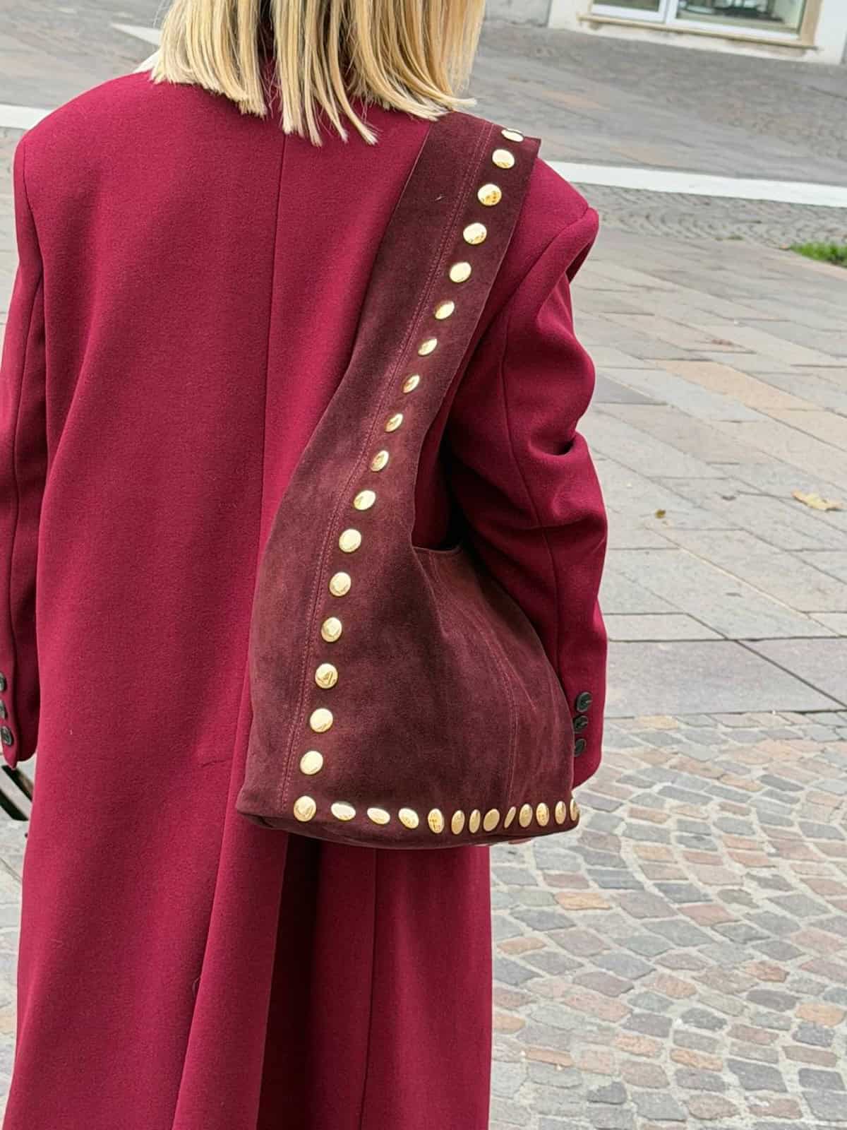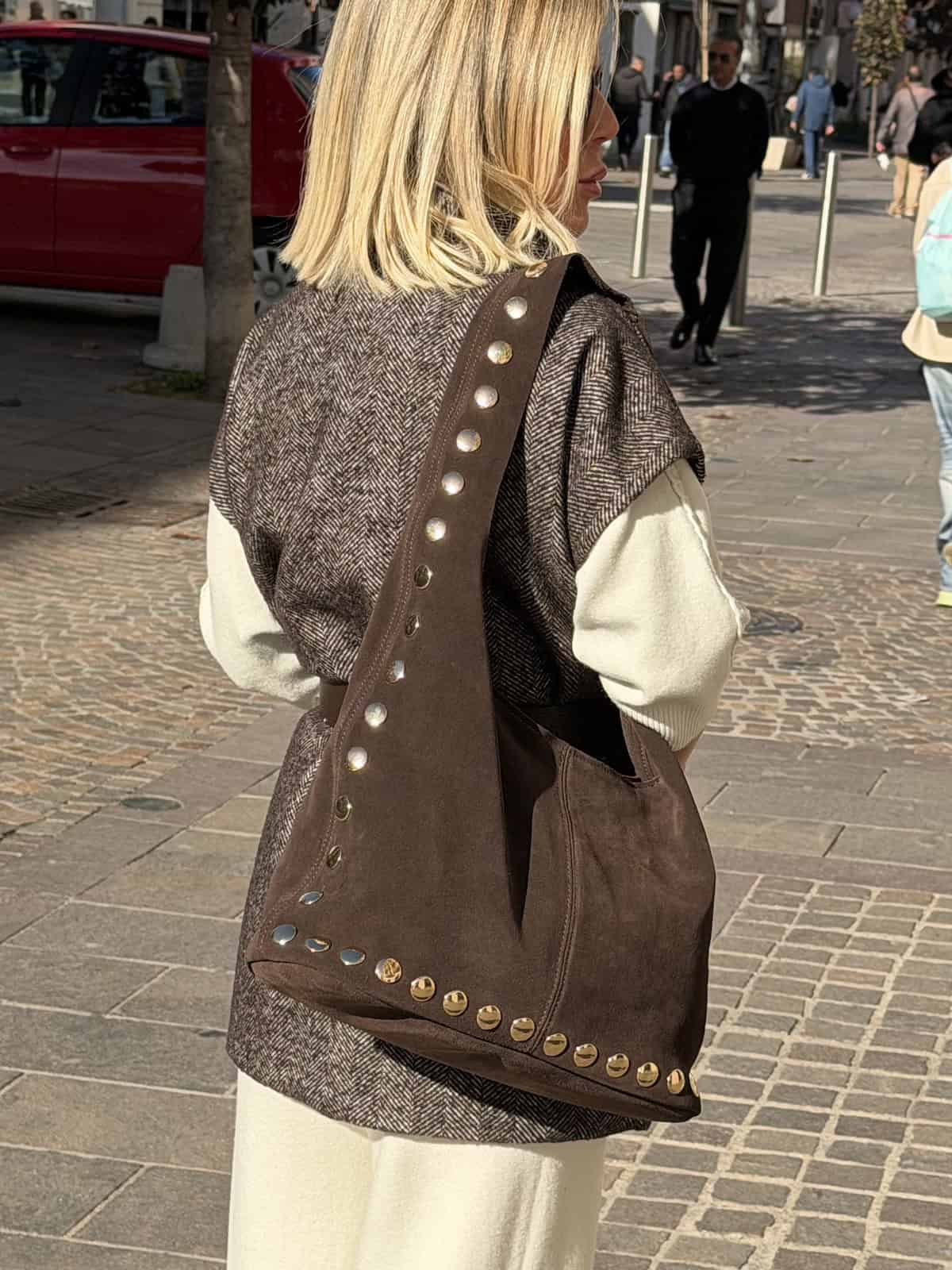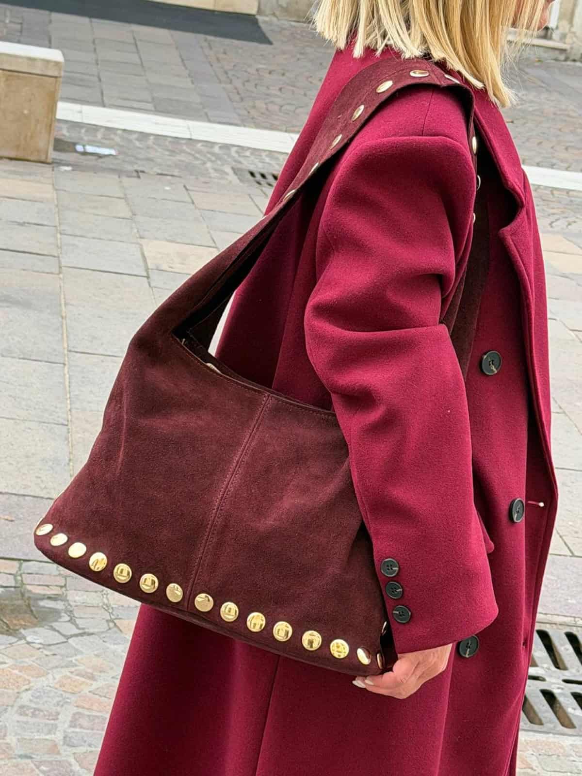 Dress17 borsa in morbida crosta dall’allure decisa e sofisticata, impreziosita da borchie dorate che percorrono il profilo e il manico, donando un tocco glam rock al look.
