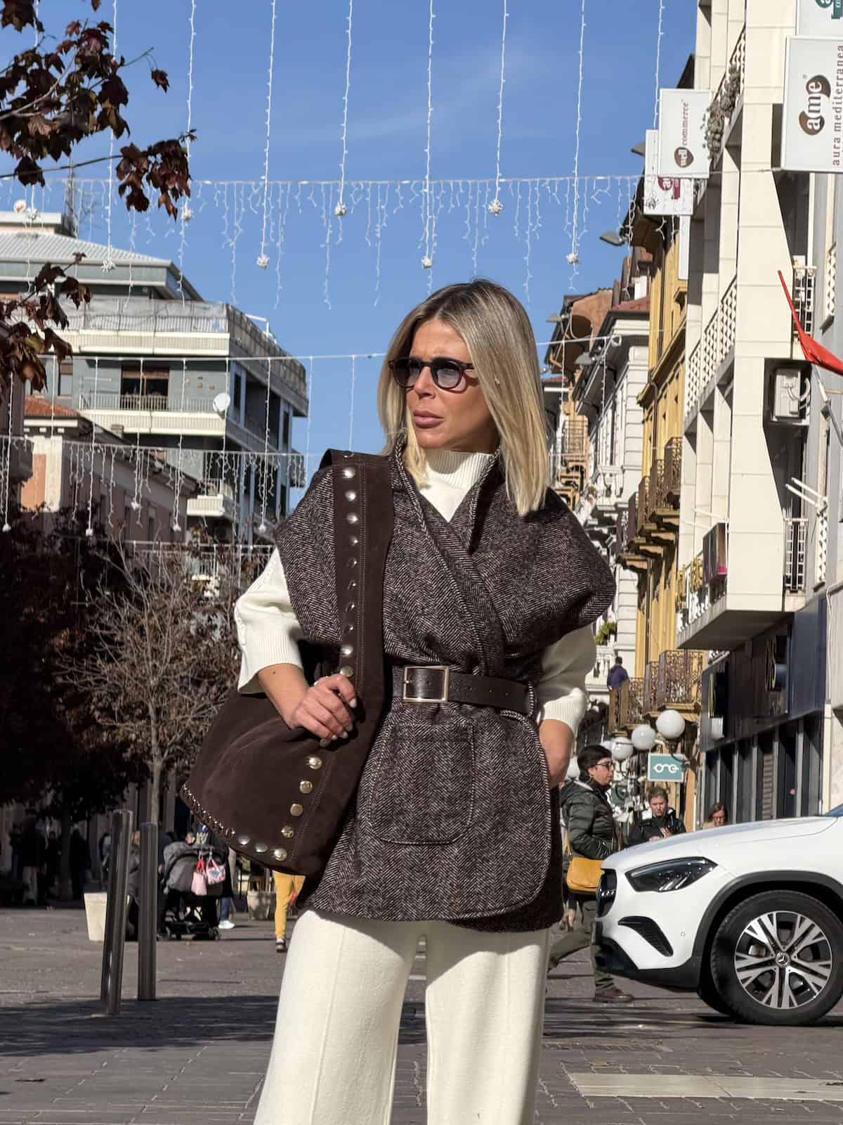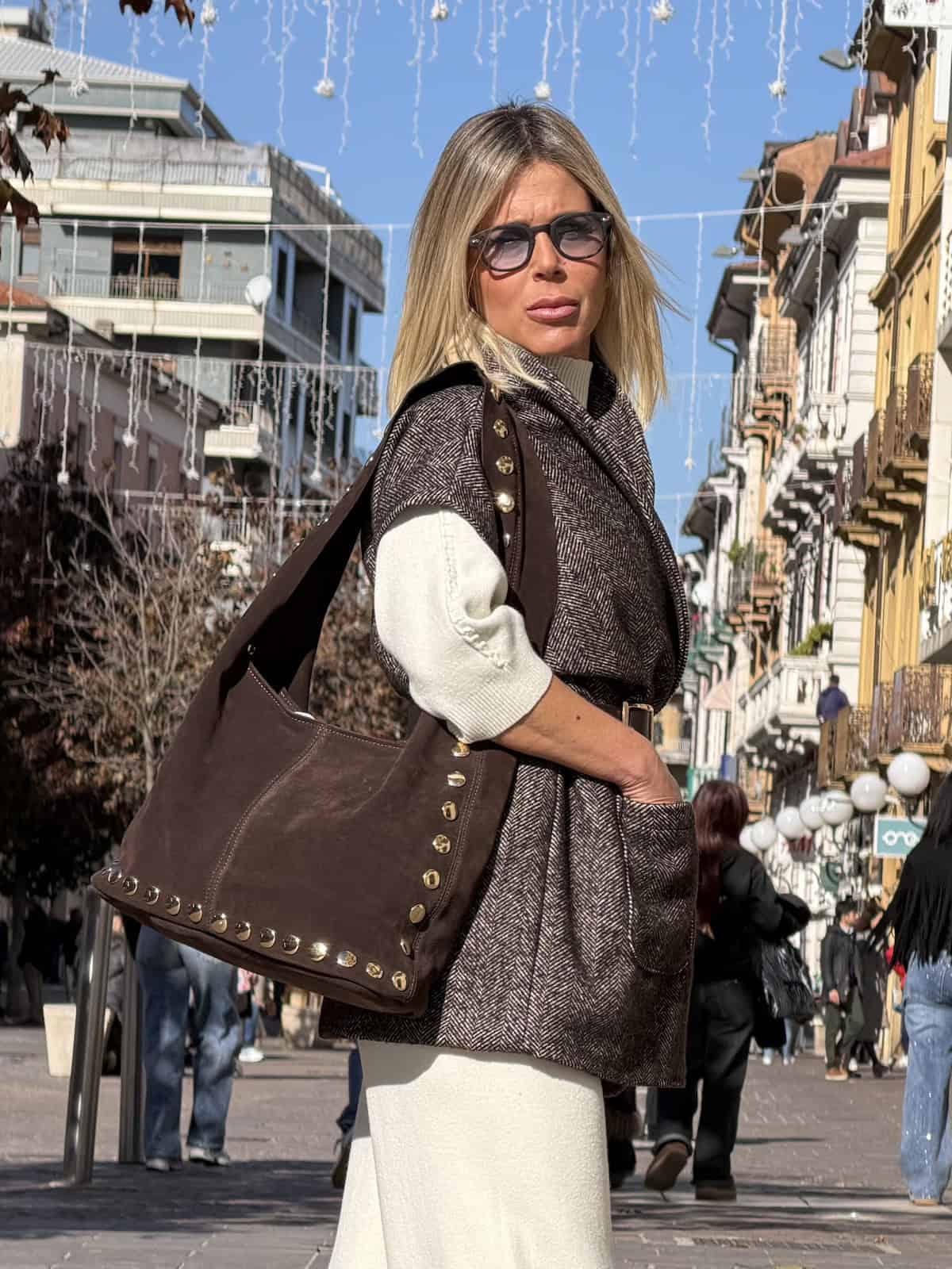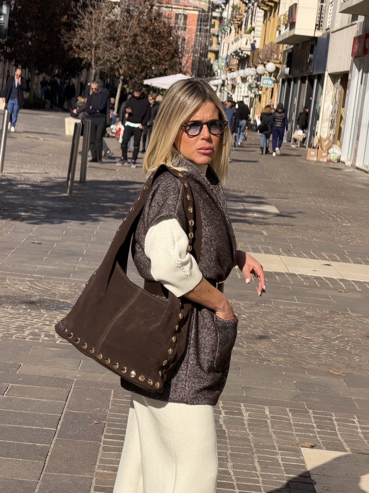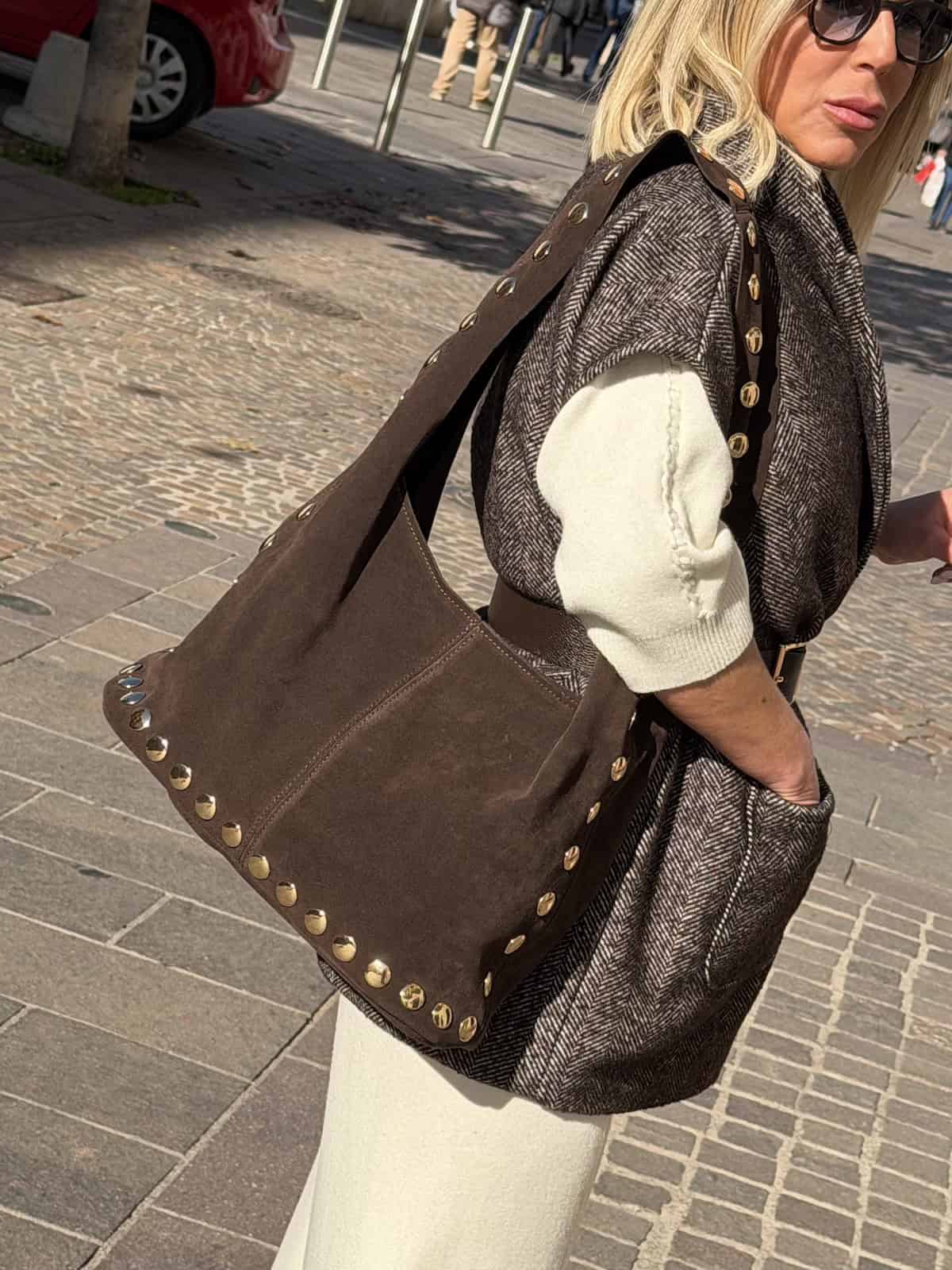 Dress17 borsa in morbida crosta dall’allure decisa e sofisticata, impreziosita da borchie dorate che percorrono il profilo e il manico, donando un tocco glam rock al look.