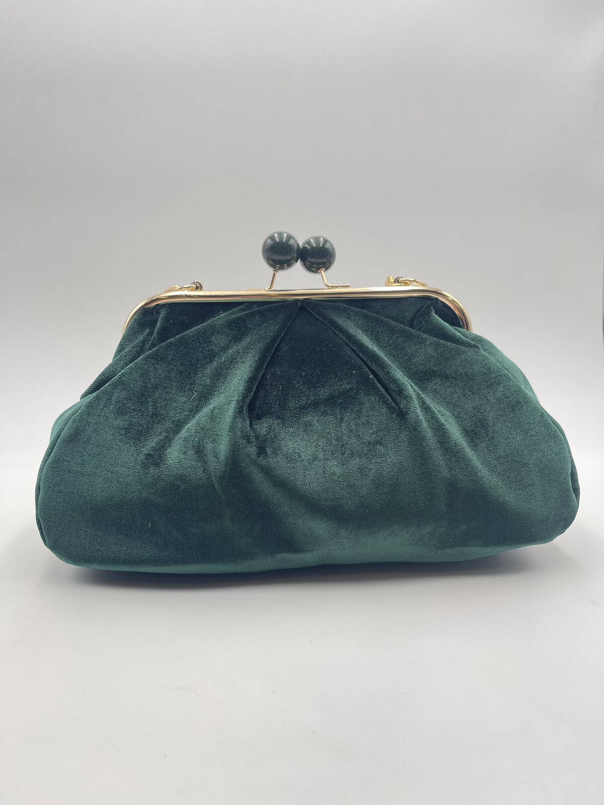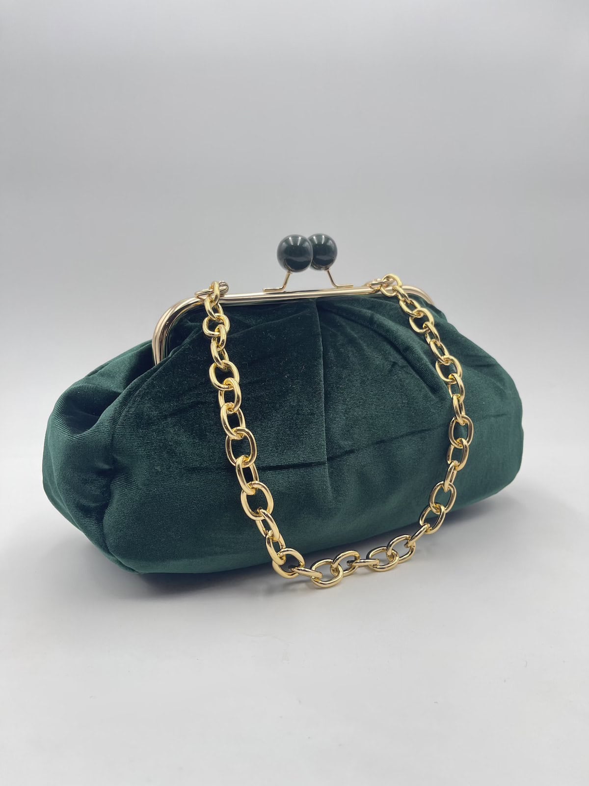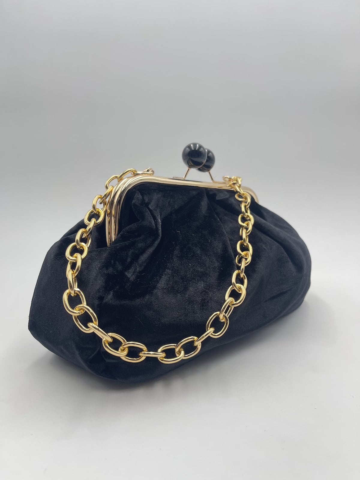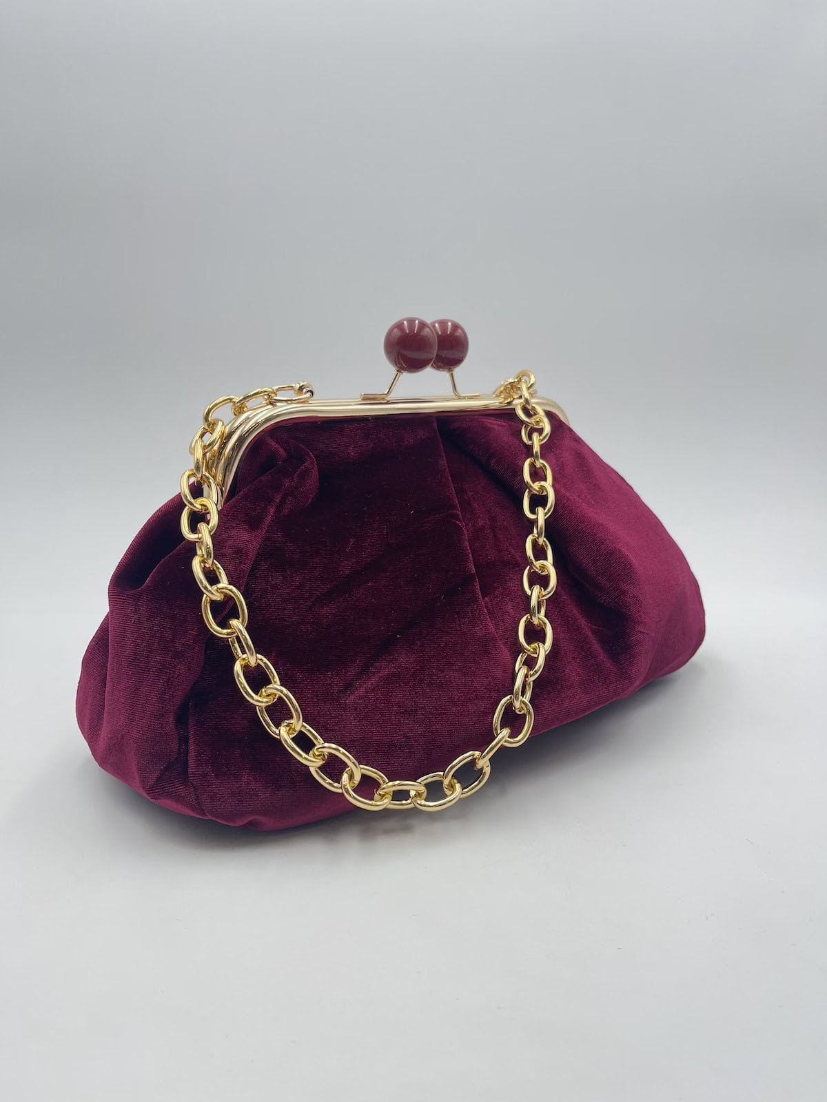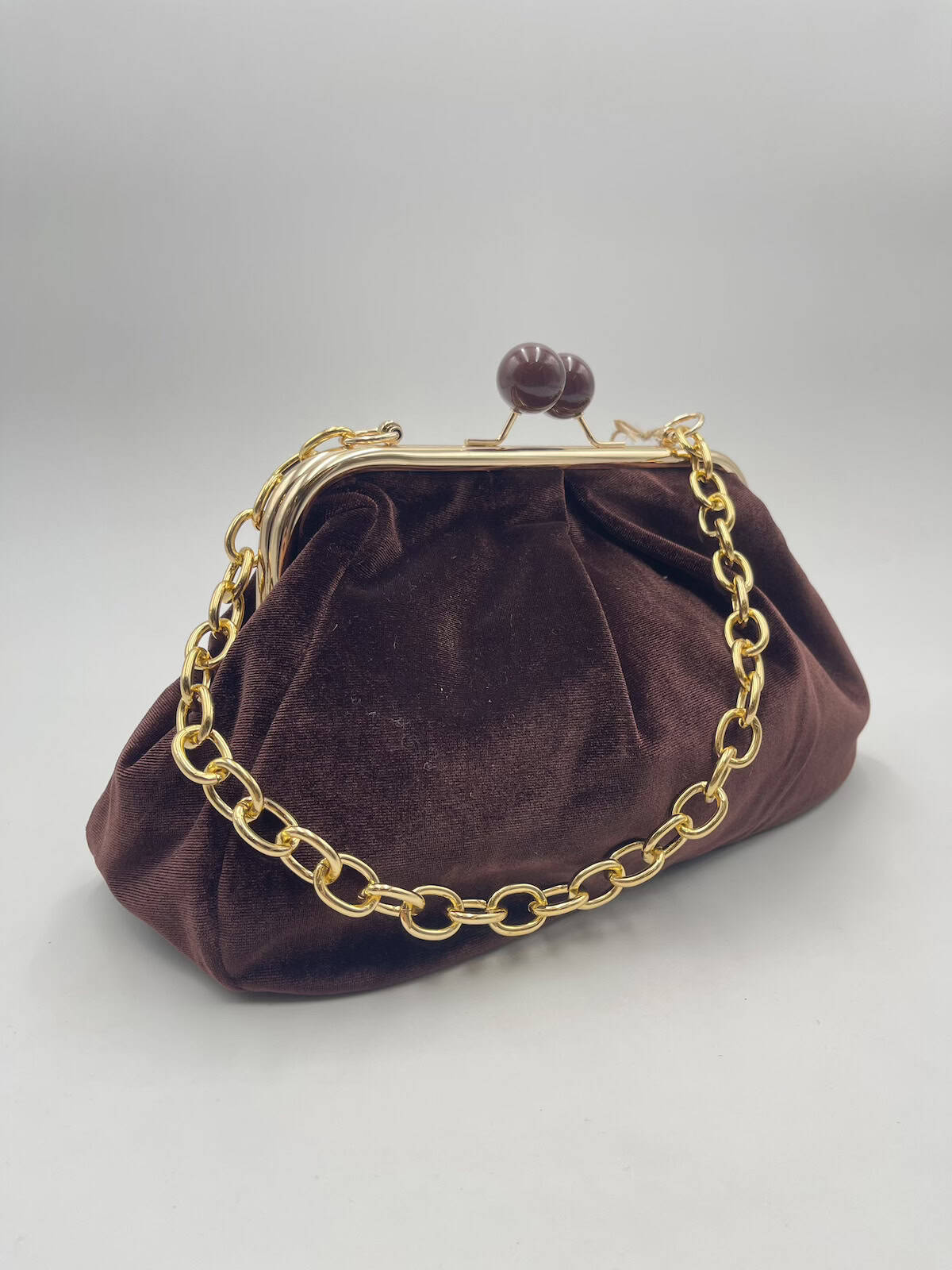 Borsa in velluto con clip a scatto e doppia tracolla (catena + tracolla coordinata in velluto).