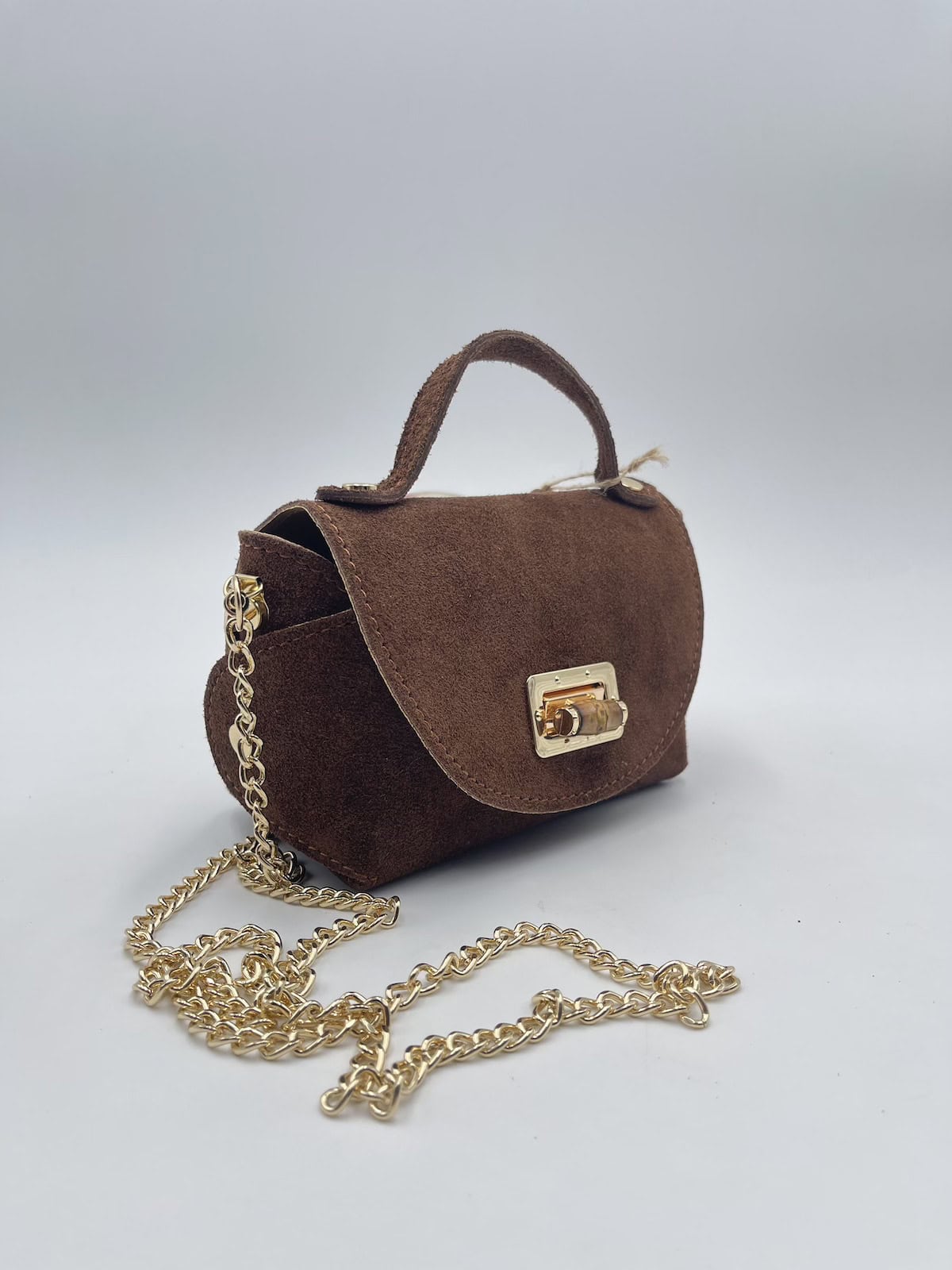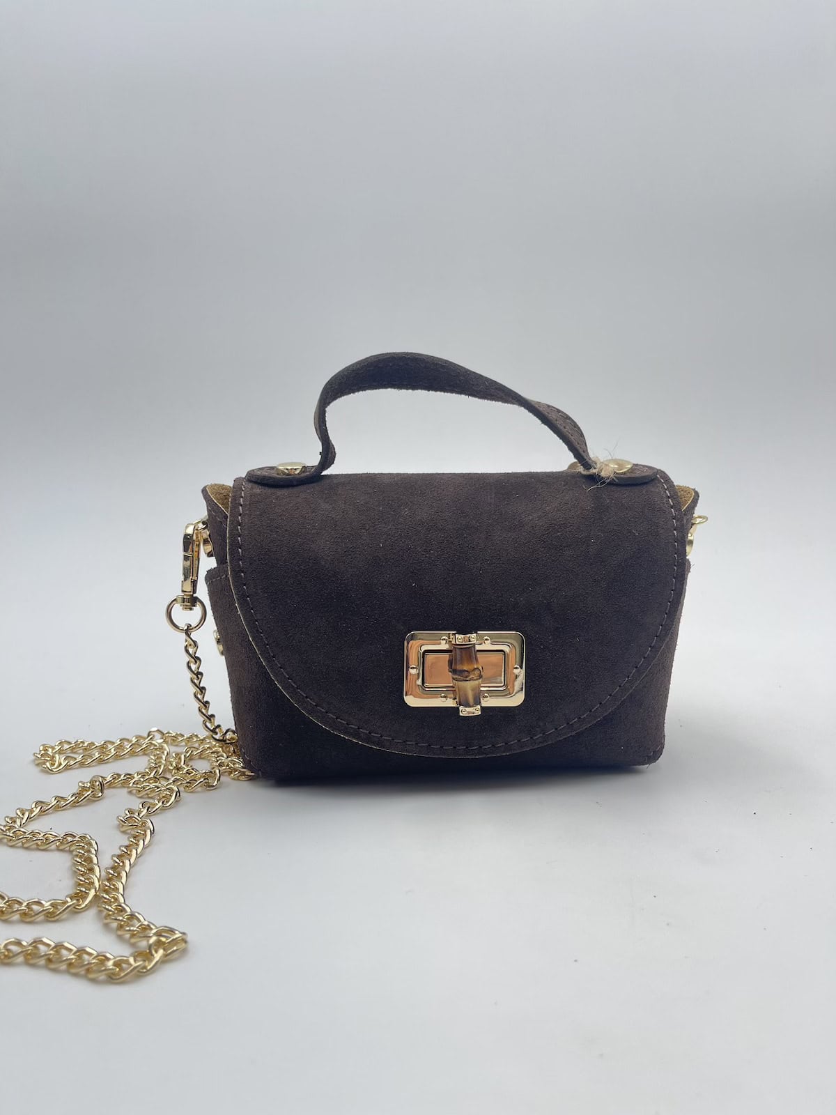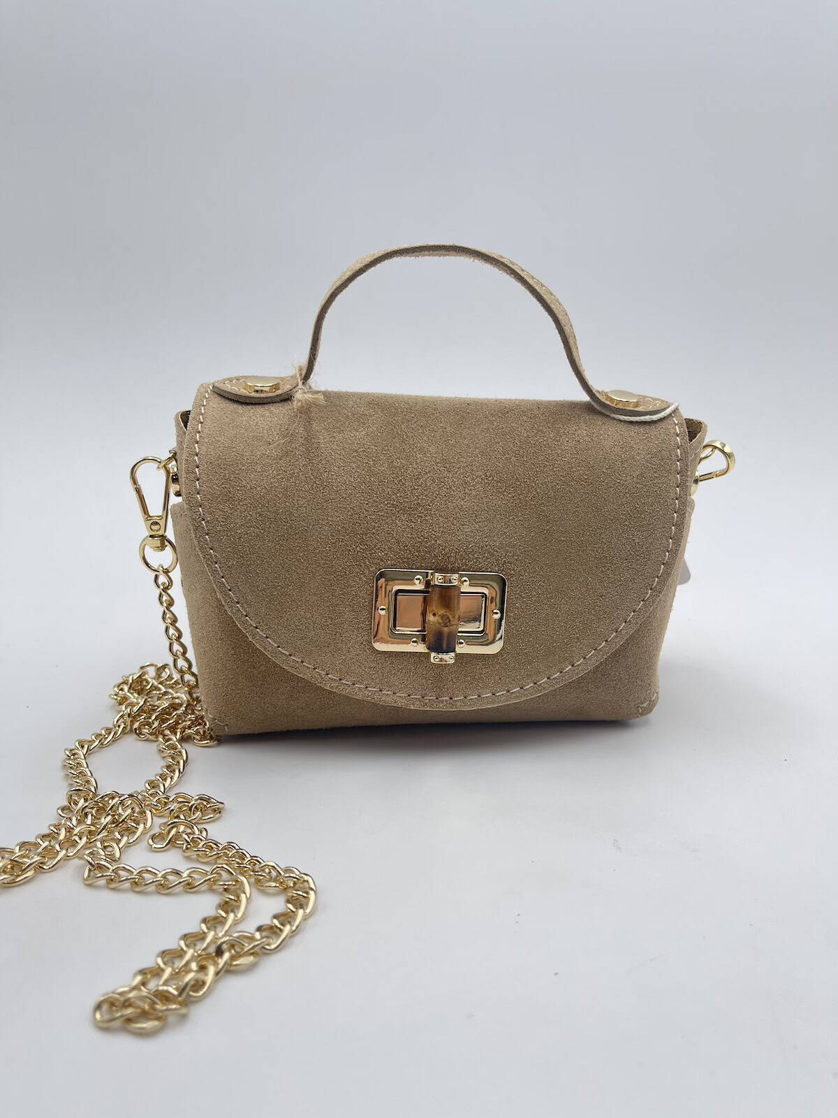 Dress17 borsa a mano in vera pelle, dal design strutturato e compatto. La superficie scamosciata dona un aspetto morbido e raffinato, mentre la chiusura frontale con dettaglio effetto bamboo e finitura metallica aggiunge un tocco elegante. Manico superiore rigido e tracolla a catena dorata removibile per indossarla anche a spalla.