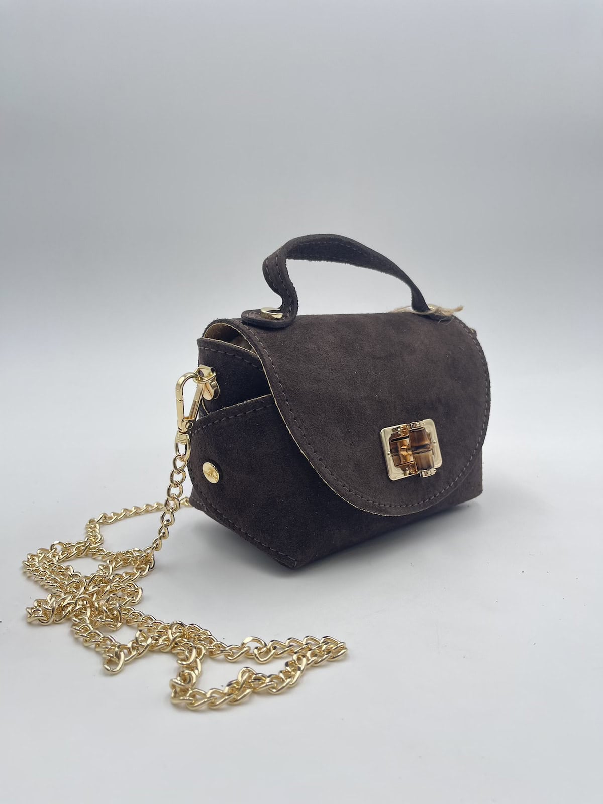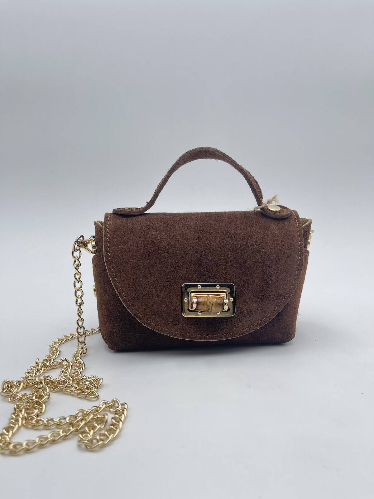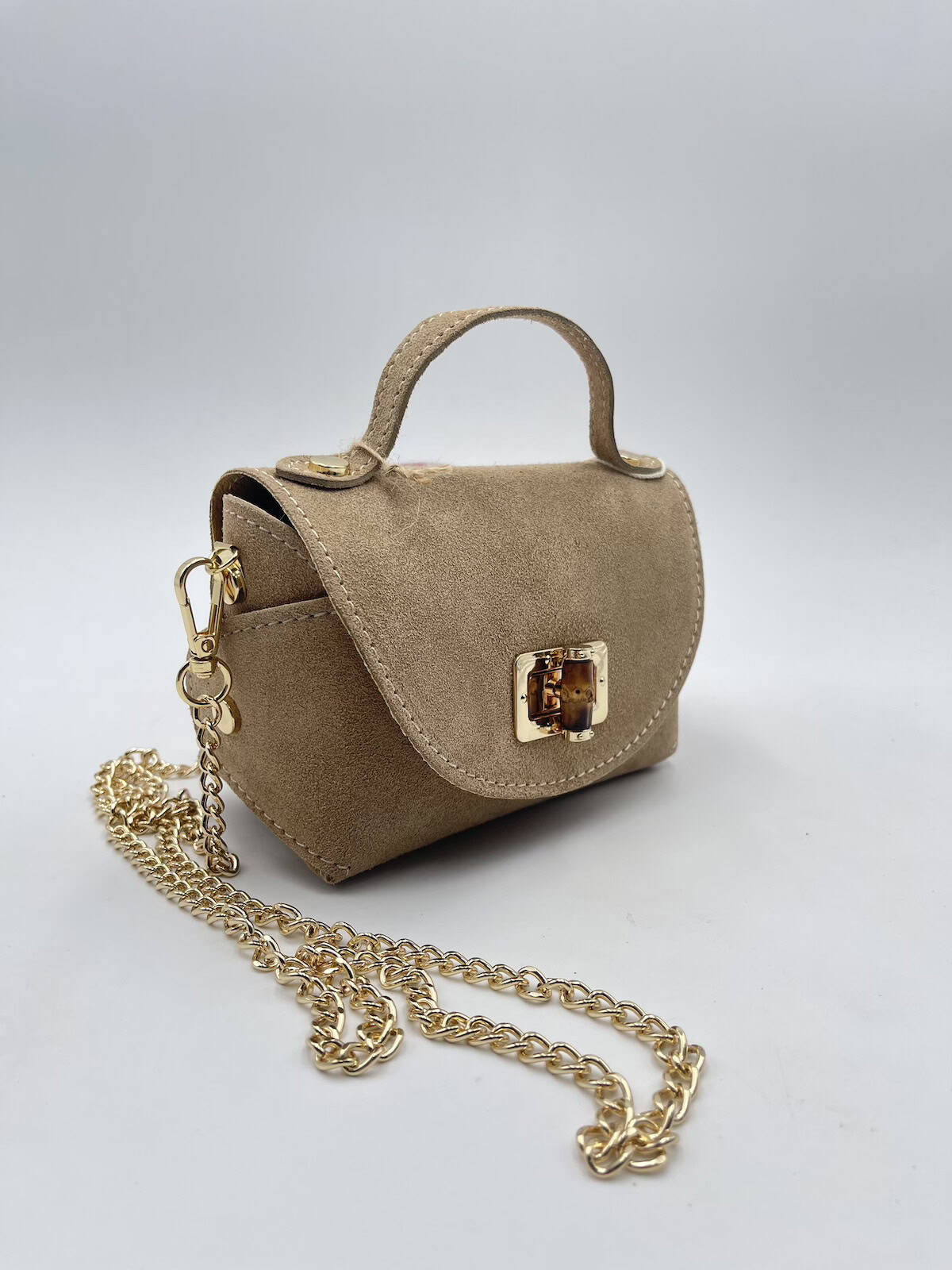 Dress17 borsa a mano in vera pelle, dal design strutturato e compatto. La superficie scamosciata dona un aspetto morbido e raffinato, mentre la chiusura frontale con dettaglio effetto bamboo e finitura metallica aggiunge un tocco elegante. Manico superiore rigido e tracolla a catena dorata removibile per indossarla anche a spalla.