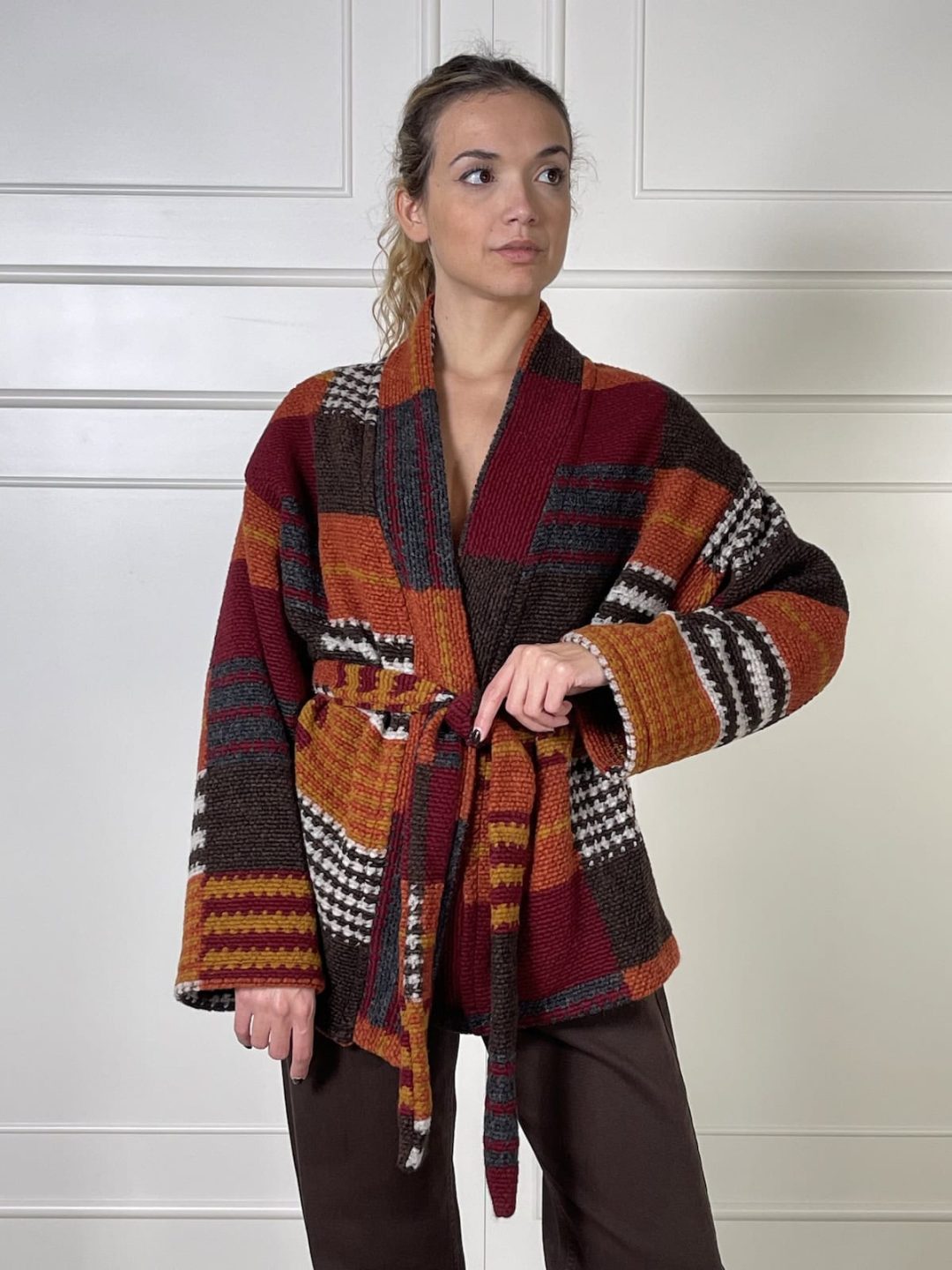 Vicolo Caban fantasia dal carattere deciso e dallo stile contemporaneo, un capo caldo e avvolgente che dona personalità a ogni look. La lavorazione multicolor e la cintura in vita lo rendono un pezzo distintivo, ideale per affrontare la stagione con stile e comfort.