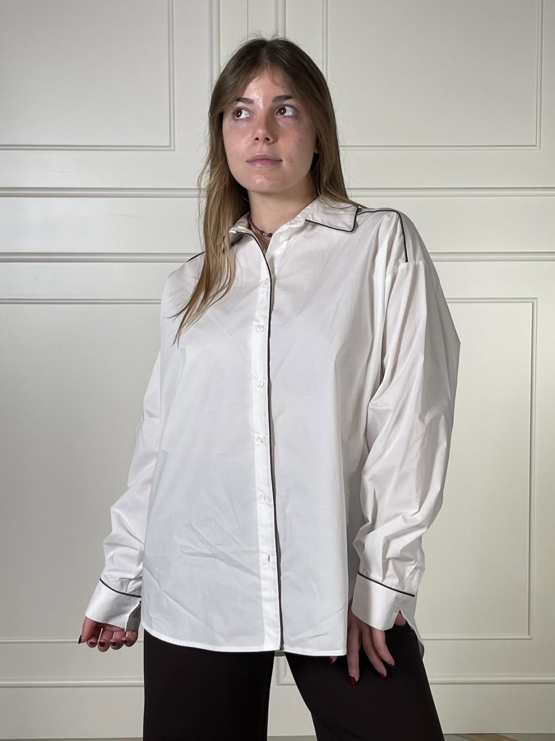 Taglio morbido con fondo stondato, collo classico e chiusura frontale con bottoni. Maniche lunghe con polsino abbottonato e profilo a contrasto su colletto, abbottonatura e polsi.