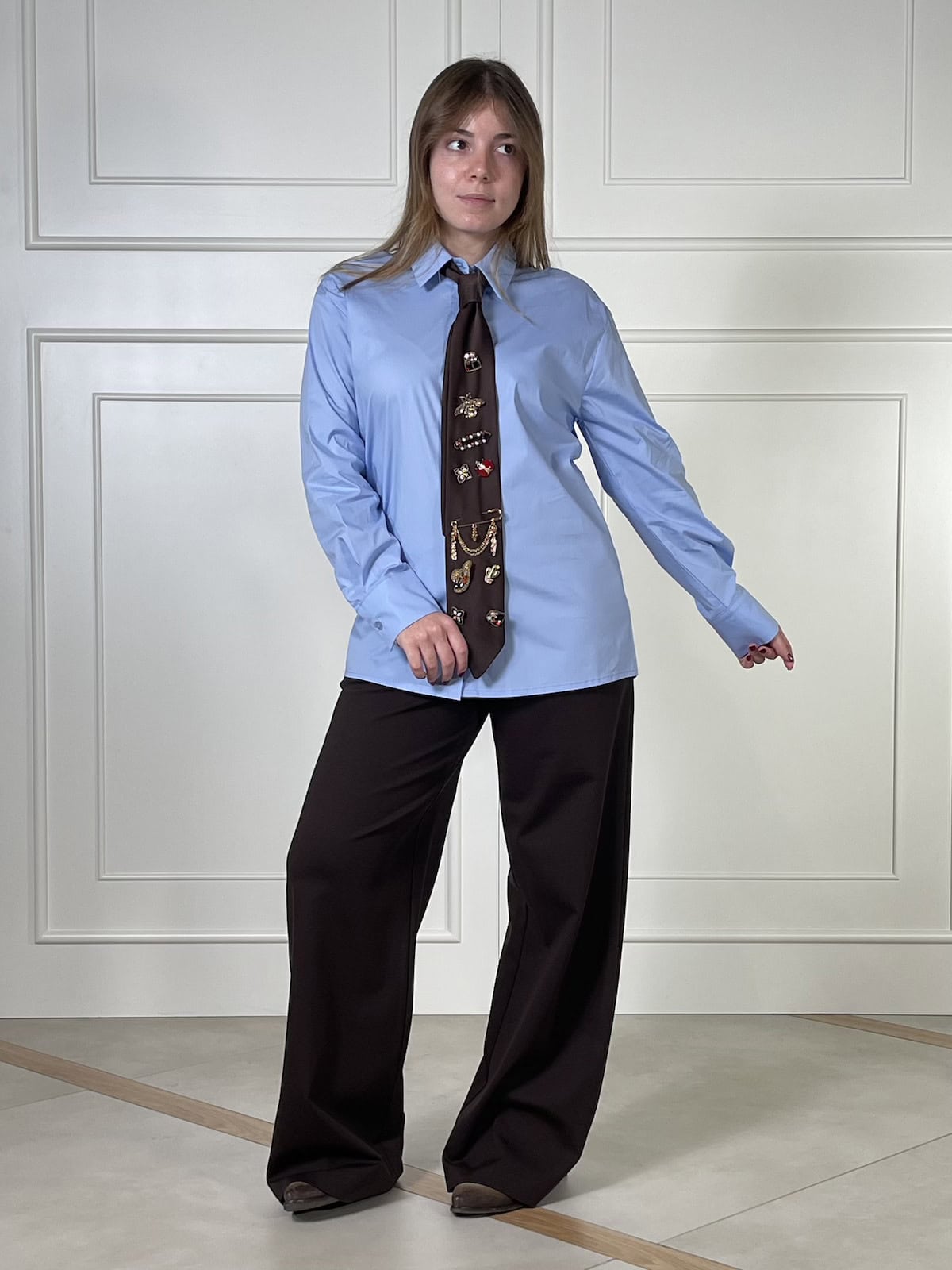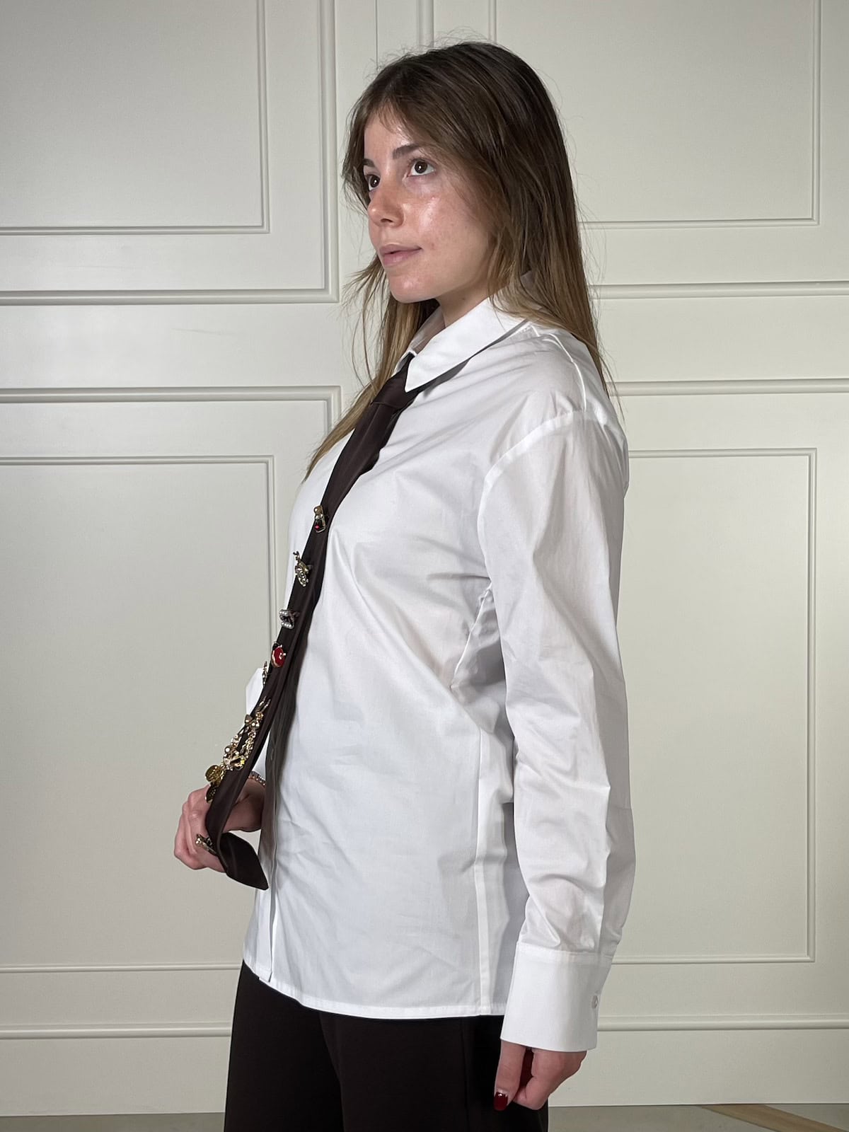Tensione In camicia dal fascino originale e contemporaneo, arricchita da una cravatta coordinata con spille decorative che aggiungono un tocco glam e ricercato. Un capo che unisce eleganza classica e personalità moderna.
