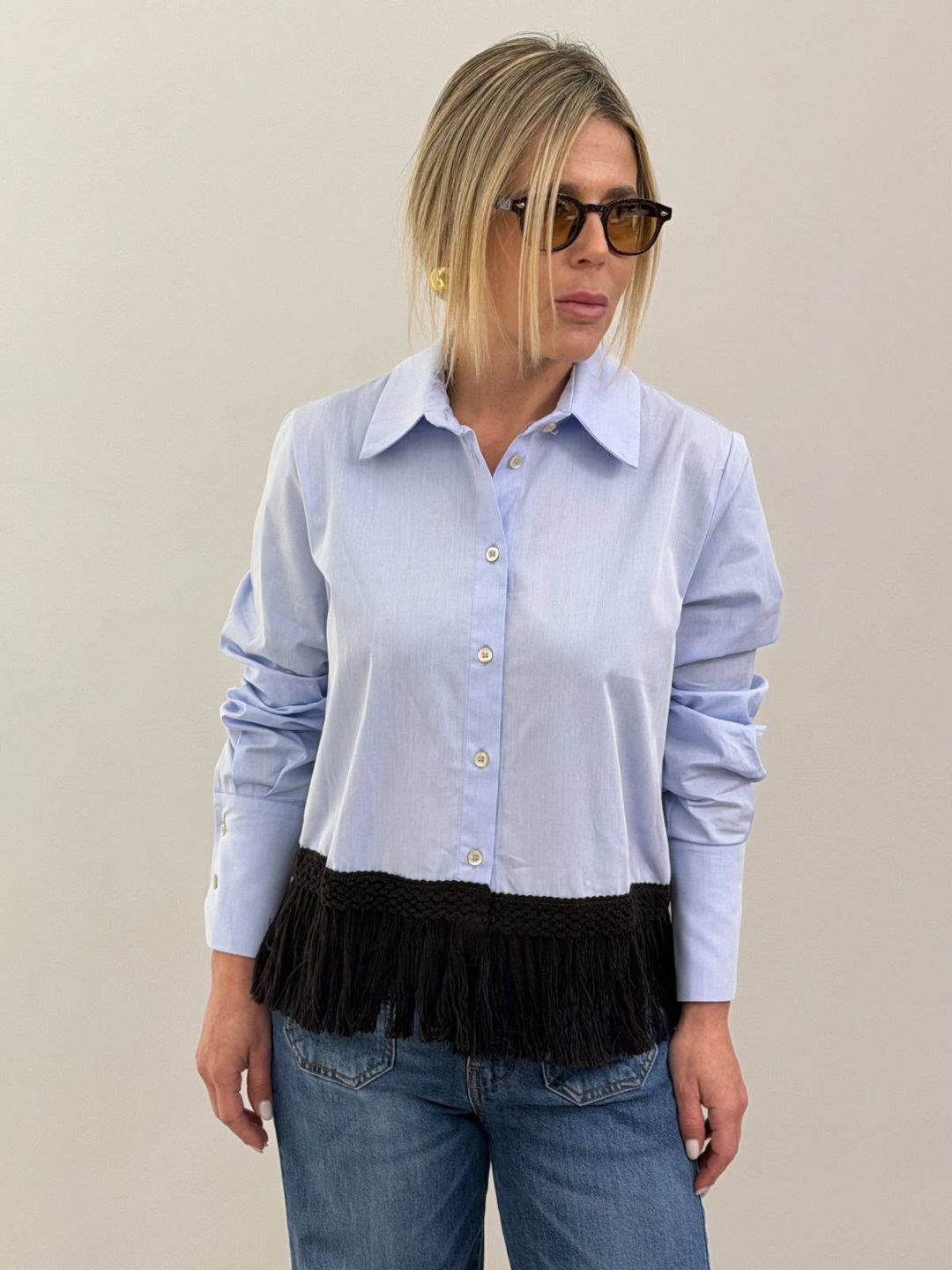 Realizzata in popeline di cotone leggero e morbido al tatto, con rifiniture curate e caduta fluida. Frange decorative tono su tono sul bordo inferiore e sui polsi per un effetto elegante e ricercato.