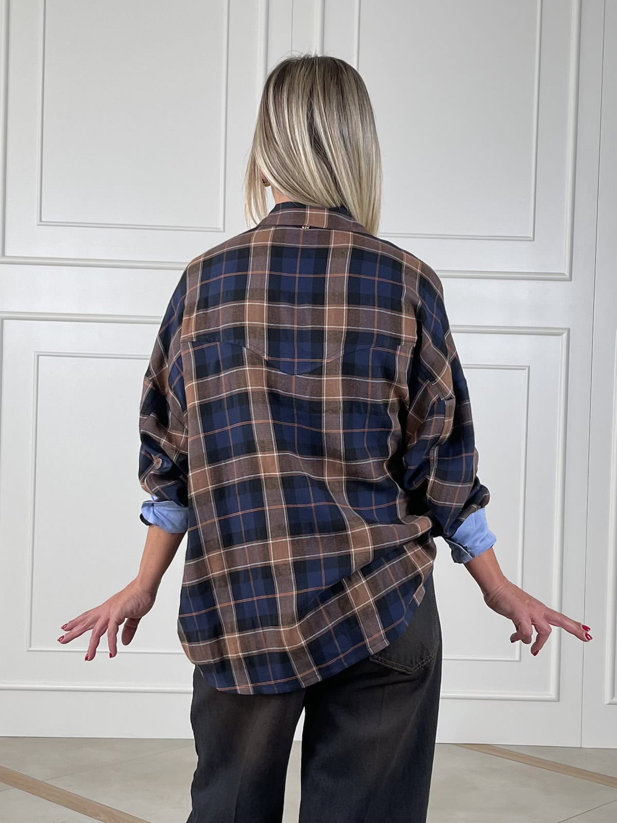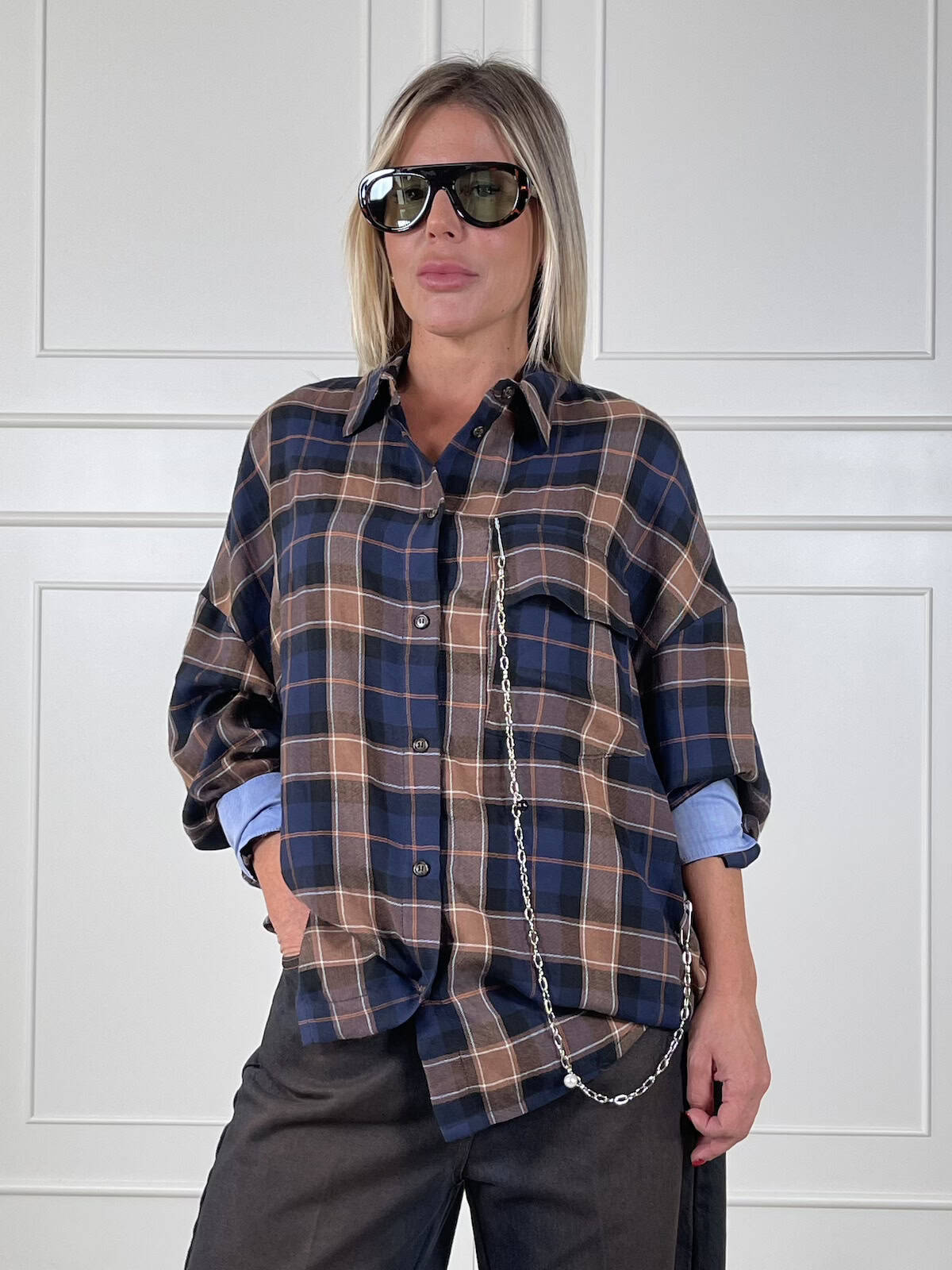 caratterizzata da una fantasia check dal fascino casual e da un dettaglio gioiello in catena che dona un tocco moderno e distintivo. La linea fluida e il tessuto leggero la rendono perfetta per outfit rilassati ma curati, ideale con denim o gonne a vita alta.