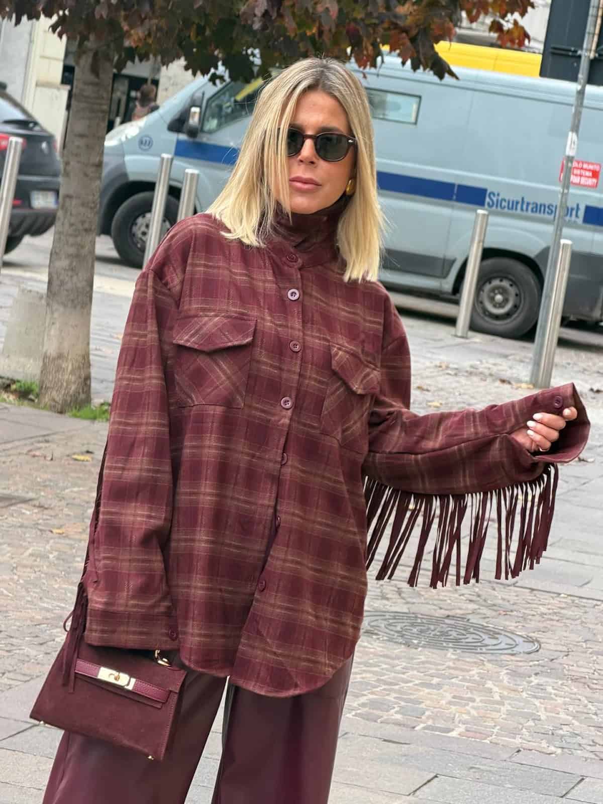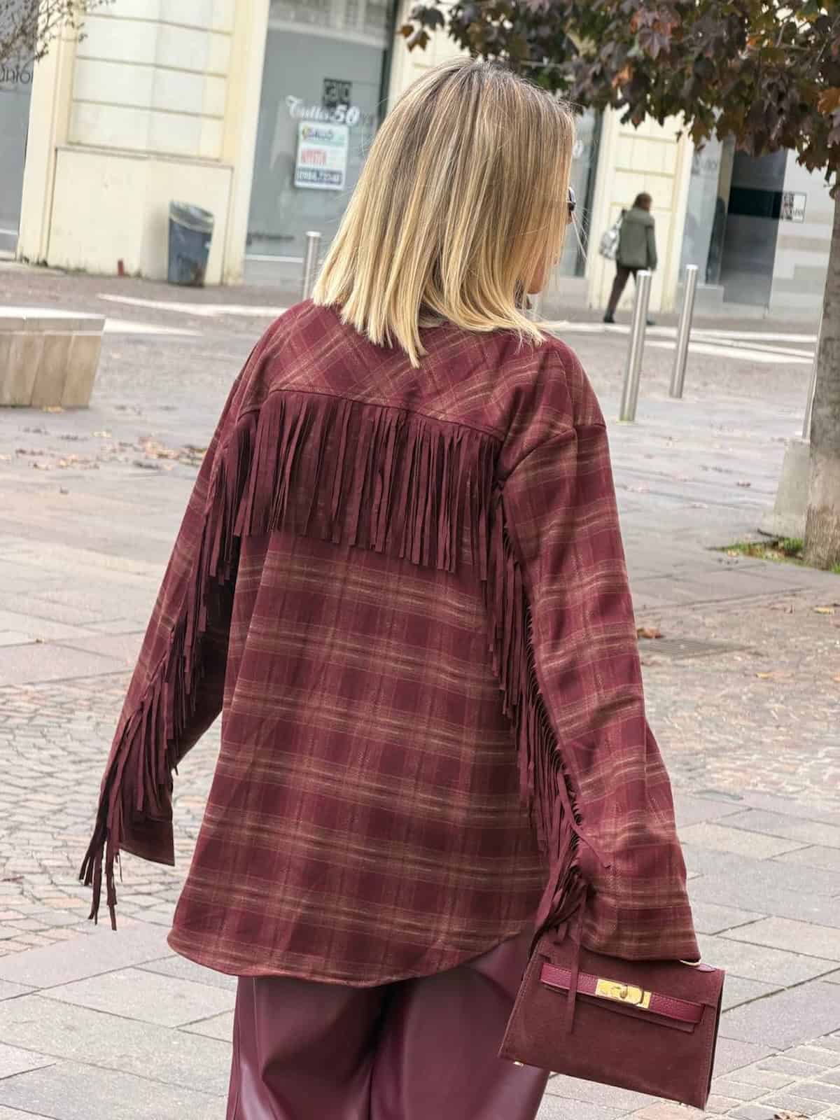 FitByDele camicia-giacca dalla linea morbida con fondo stondato, caratterizzata da due taschini frontali e applicazioni di frange lungo le maniche che donano un tocco western moderno.