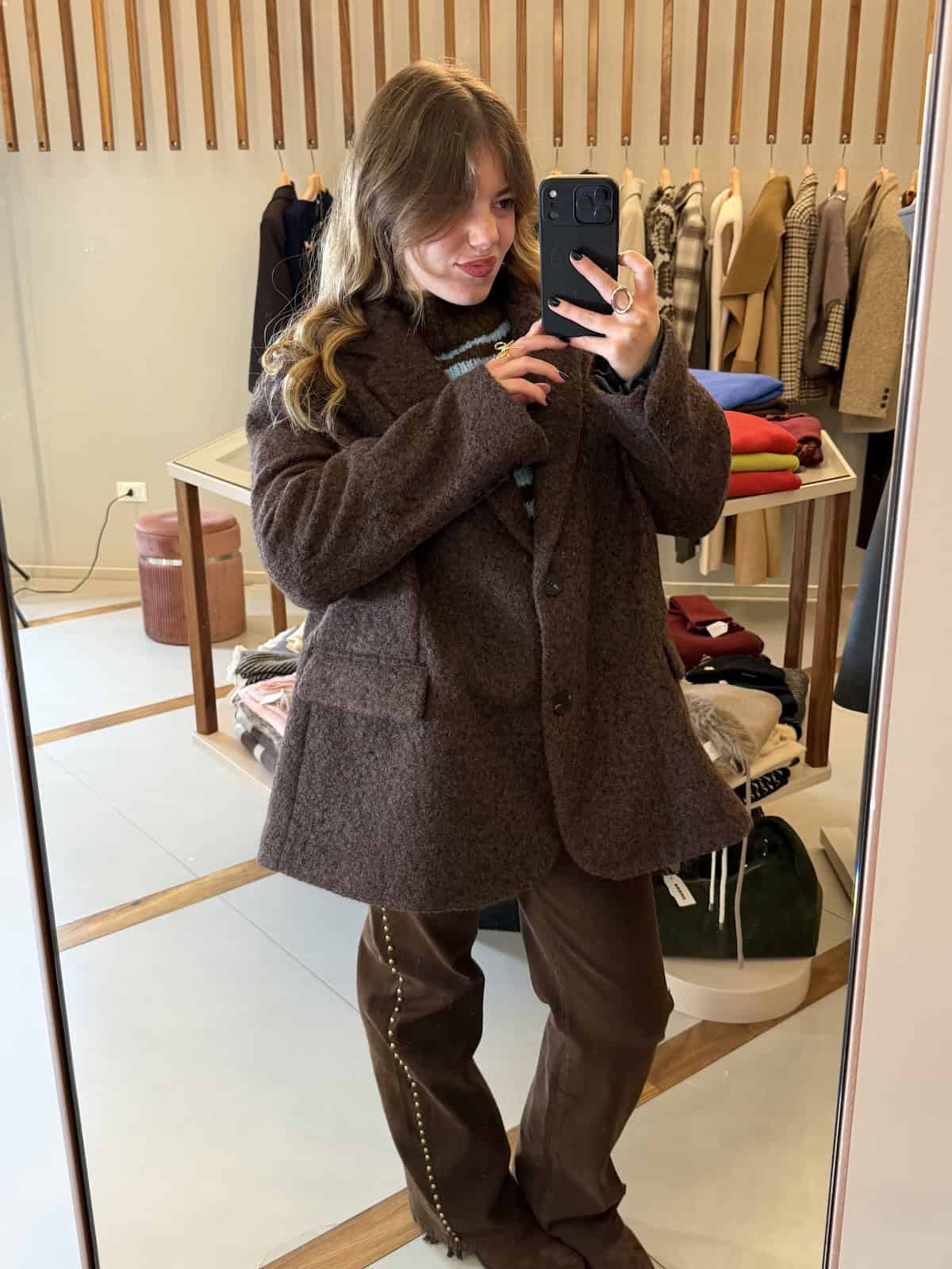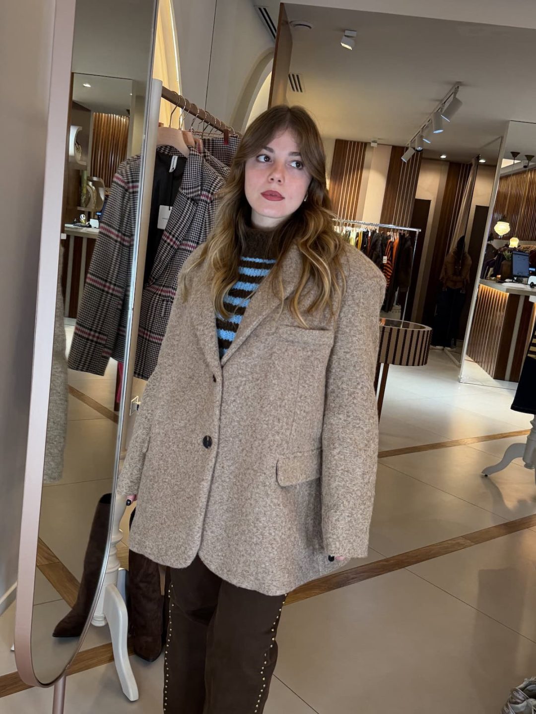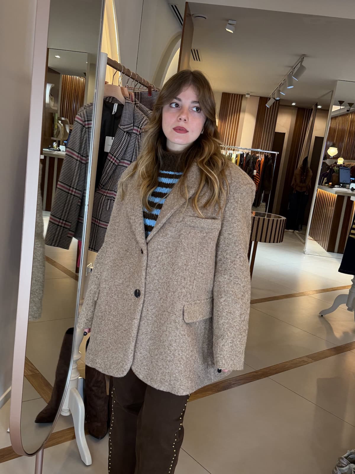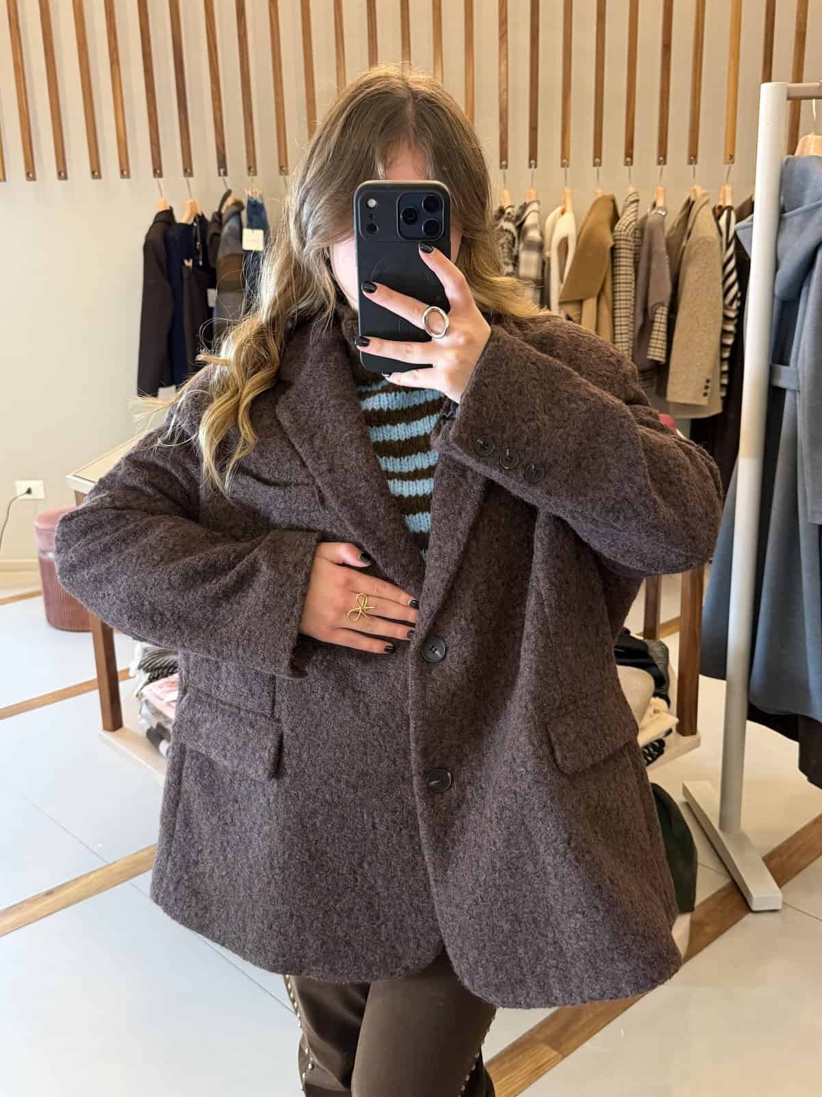 FitByDele cappotto corto modello giacca, caratterizzato da una linea morbida e un effetto bouclé che dona struttura e un aspetto estremamente caldo e avvolgente. Chiusura frontale doppi bottoni, collo a rever classico e tasche frontali con pattina. Un capo ideale per dare un tocco sofisticato ai look quotidiani.