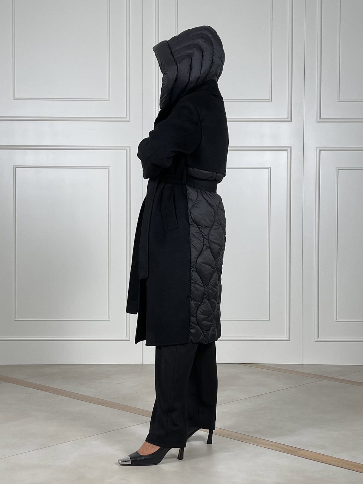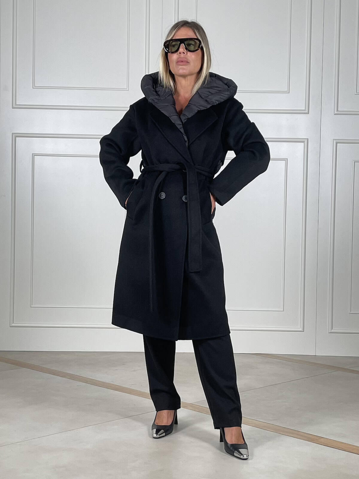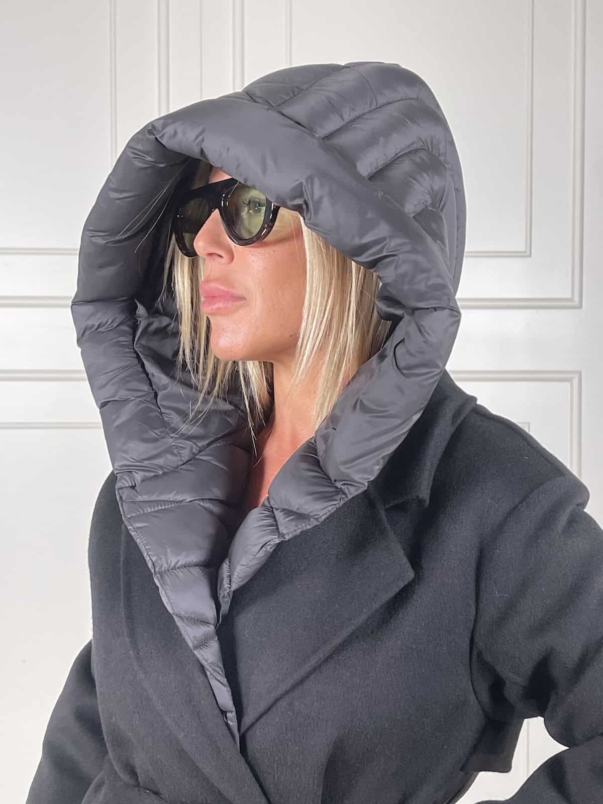 Vicolo cappotto interamente imbottito, con revers ampi e cappuccio avvolgente