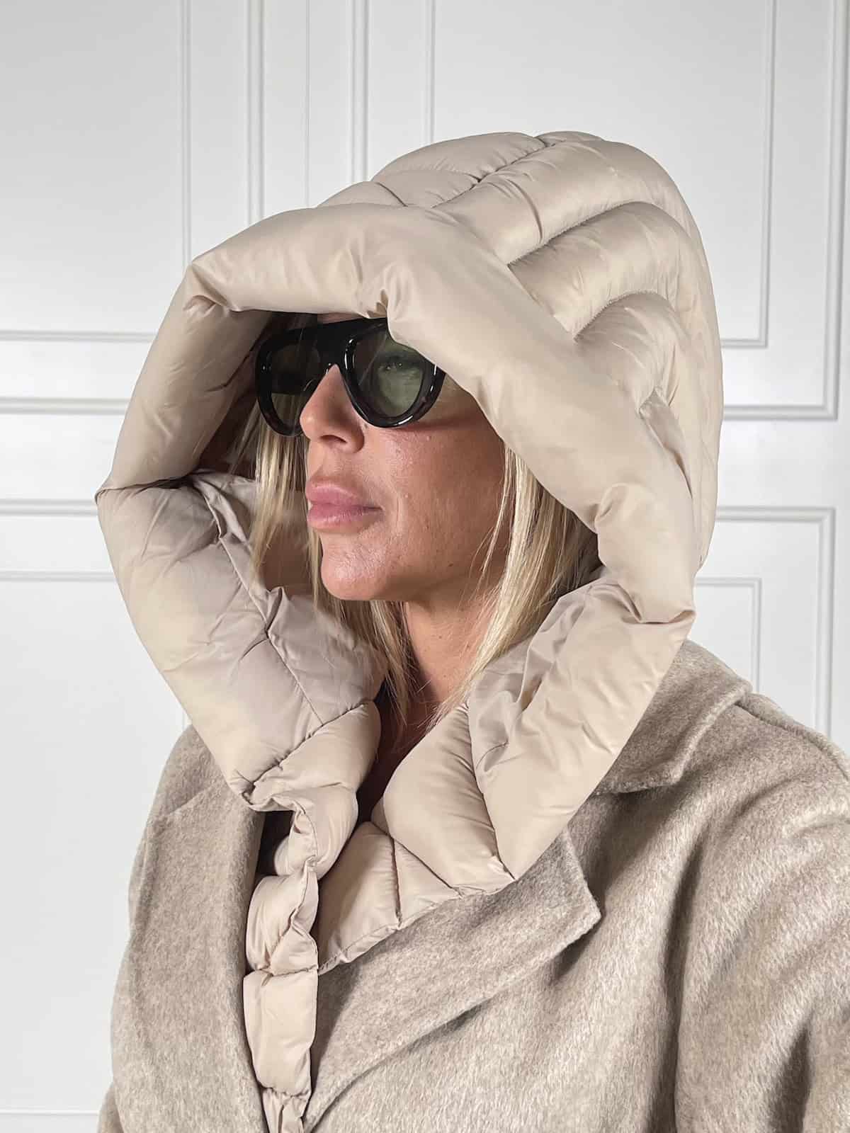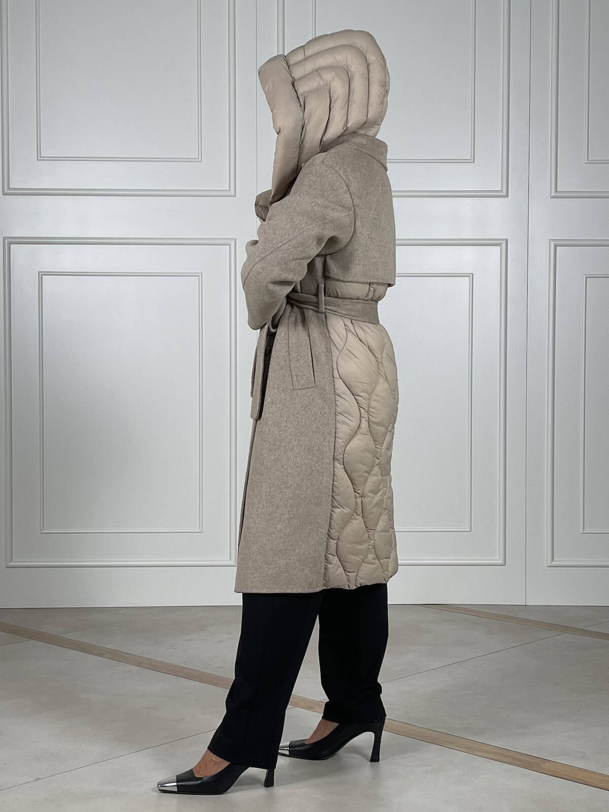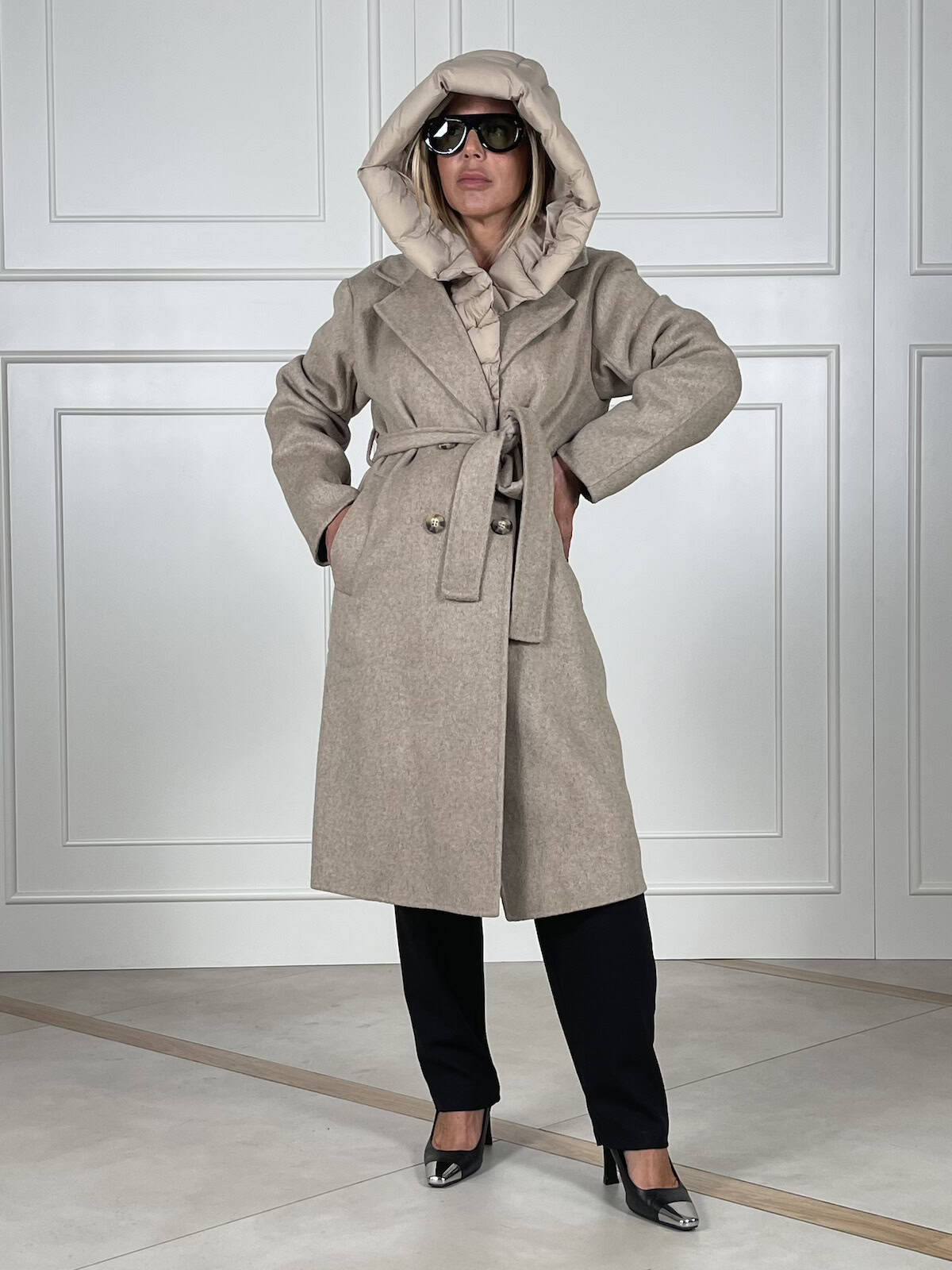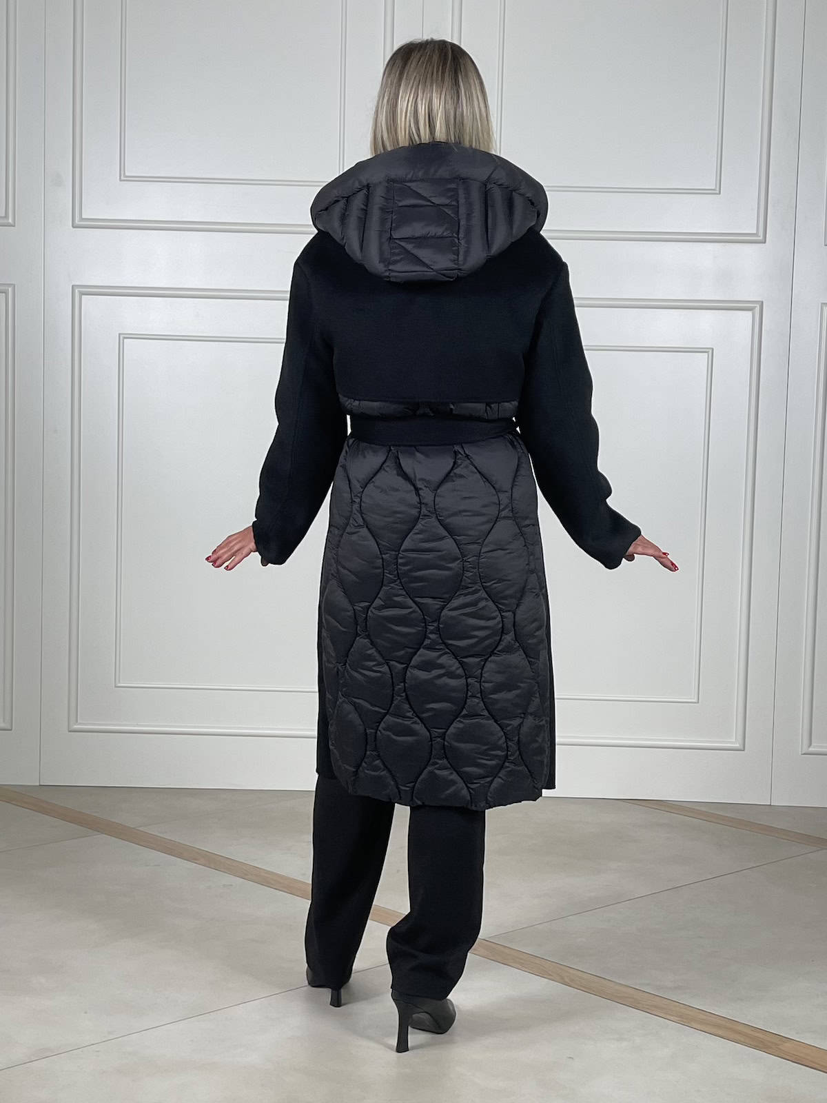 Vicolo cappotto interamente imbottito, con revers ampi e cappuccio avvolgente