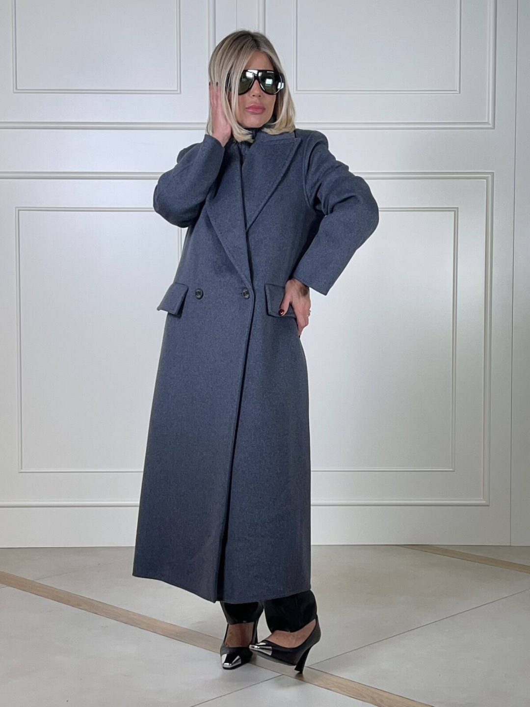 icona di eleganza contemporanea con un taglio sartoriale impeccabile. Realizzato in pregiato misto cashmere, avvolge la silhouette con morbidezza e calore, garantendo un’allure sofisticata e senza tempo. Il design doppiopetto e il rever ampio lo rendono un capo versatile, perfetto per look sia formali che quotidiani.