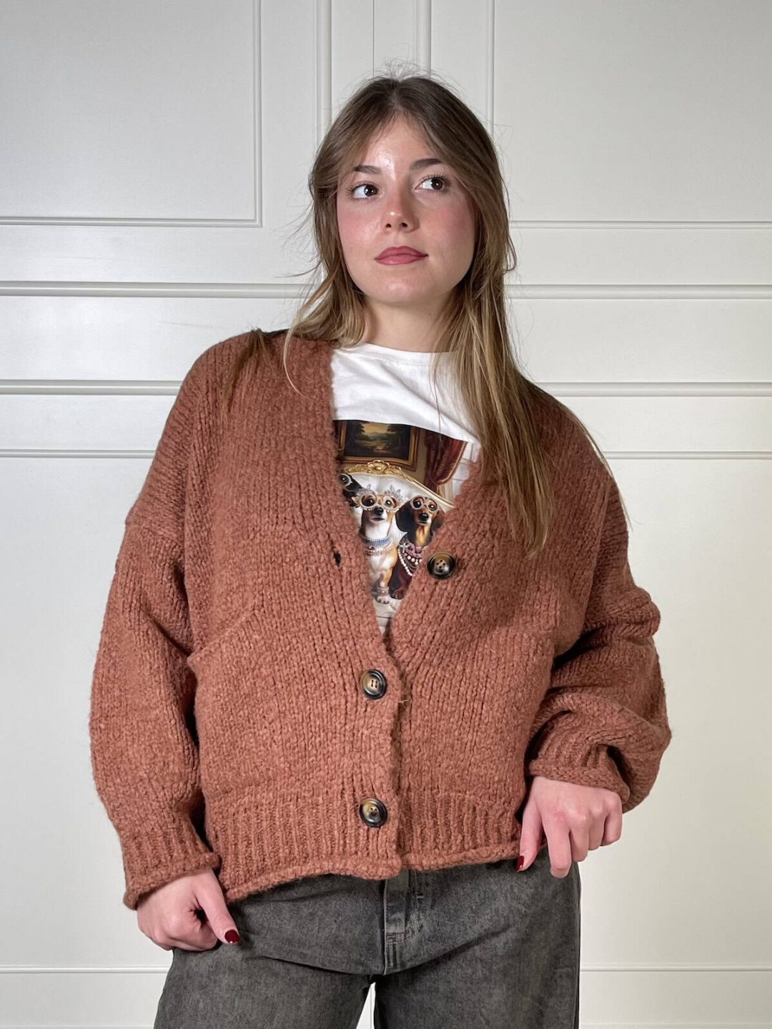 Vicolo Cardigan in maglia dallo stile casual e avvolgente, un capo morbido e versatile perfetto per completare look quotidiani o per dare un tocco cozy alle giornate più fredde. La texture compatta e l’effetto leggermente peloso lo rendono un must-have di stagione.
