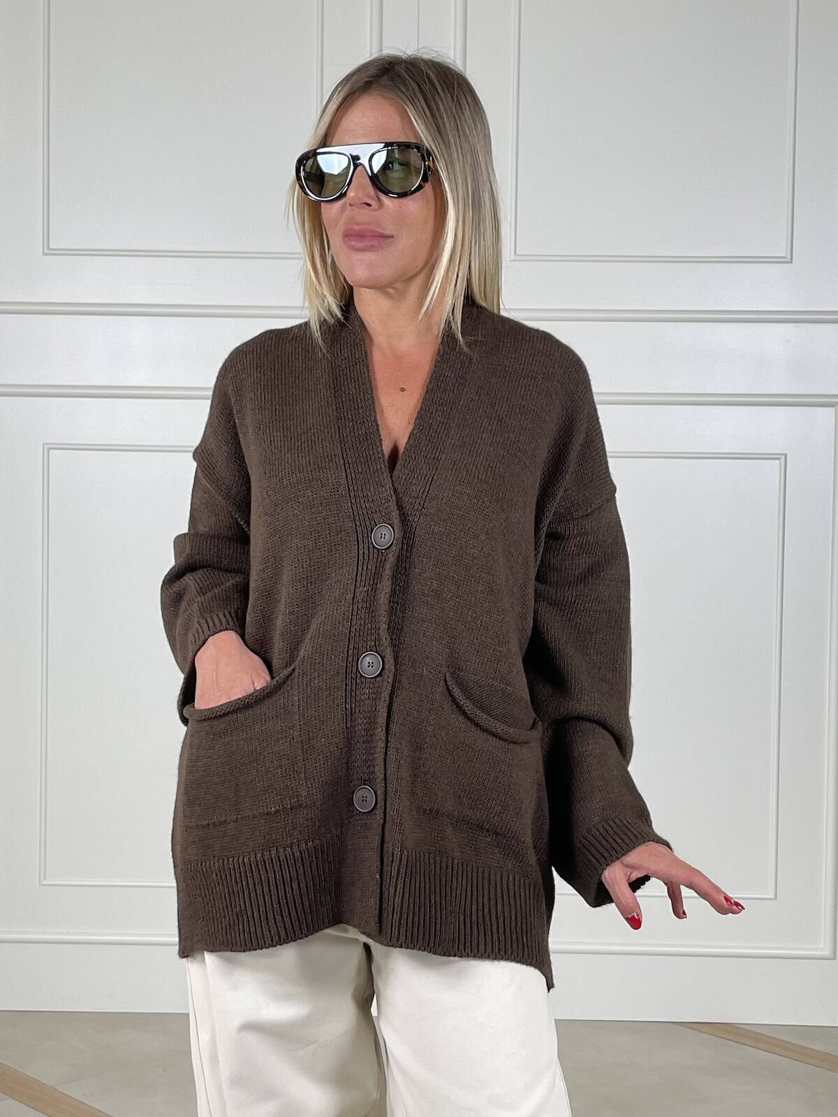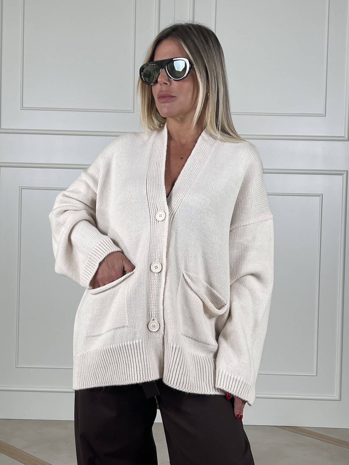 Cardigan morbido e avvolgente, dal design casual con un tocco grintoso. Il dettaglio grafico sul retro aggiunge personalità e carattere, trasformando un capo basic in un elemento distintivo e contemporaneo del guardaroba.
