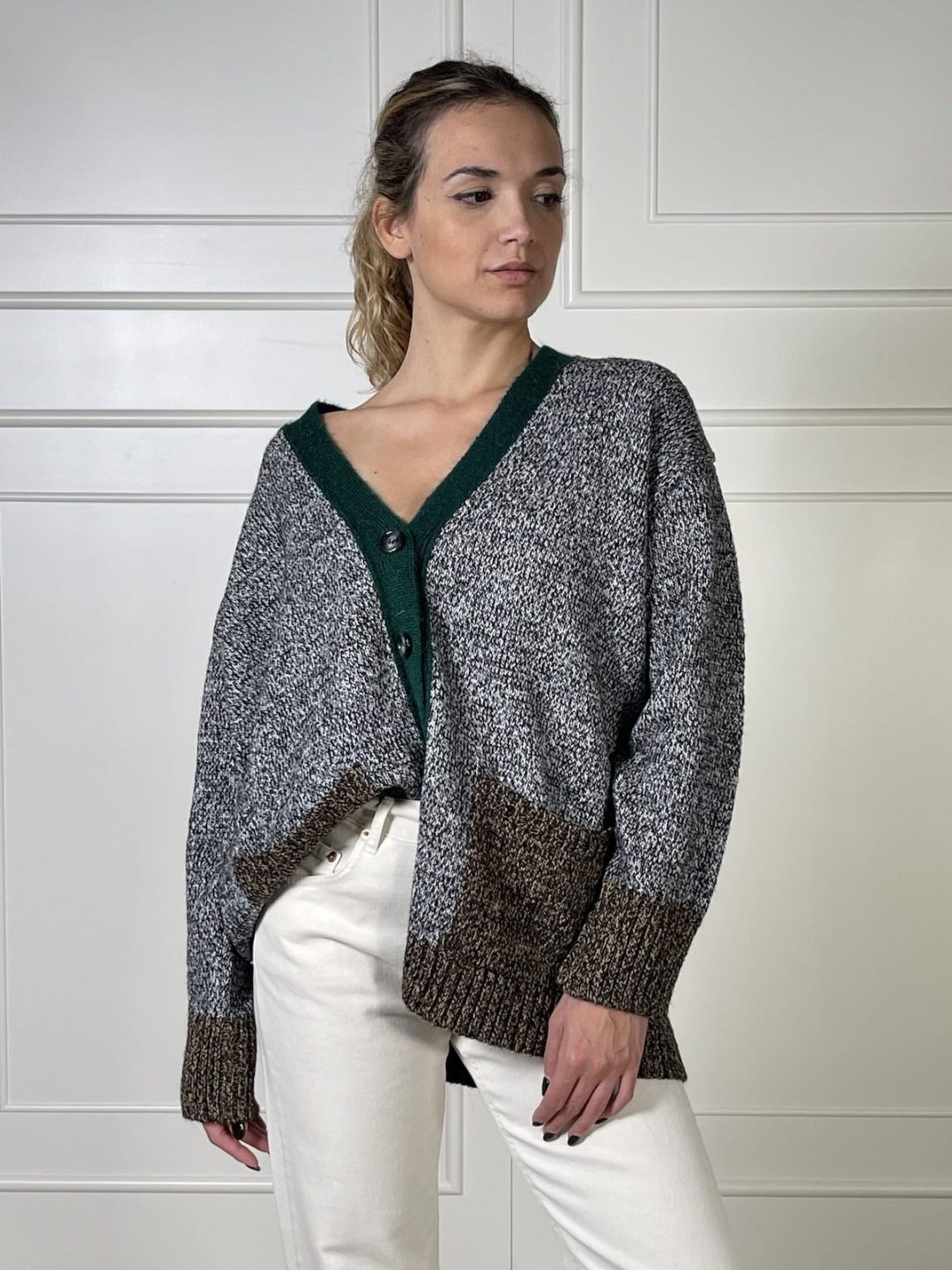 Vicolo Cardigan dal taglio over in morbida maglia spigata, ideale per un look casual ma curato. La texture mélange e i dettagli a contrasto conferiscono personalità e stile, rendendolo un capo perfetto per la stagione fredda.
