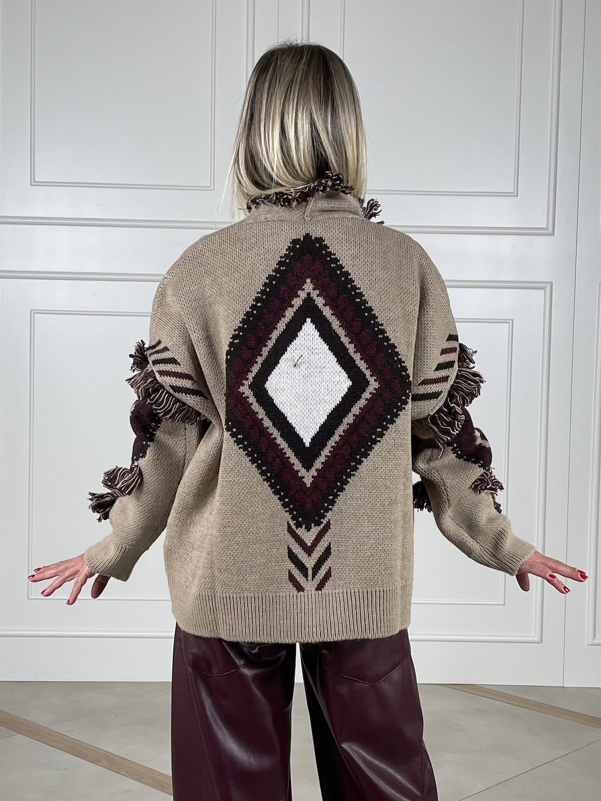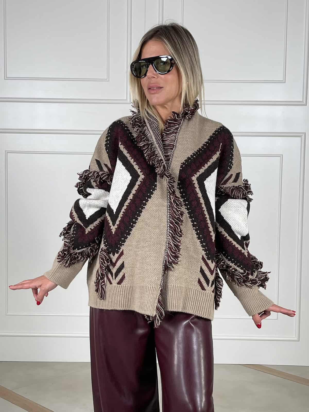 Un capo caldo e d’effetto che unisce ispirazioni etniche e dettagli contemporanei. Il motivo geometrico e le frange donano movimento e carattere, rendendo questo cardigan perfetto per aggiungere personalità ai look quotidiani.