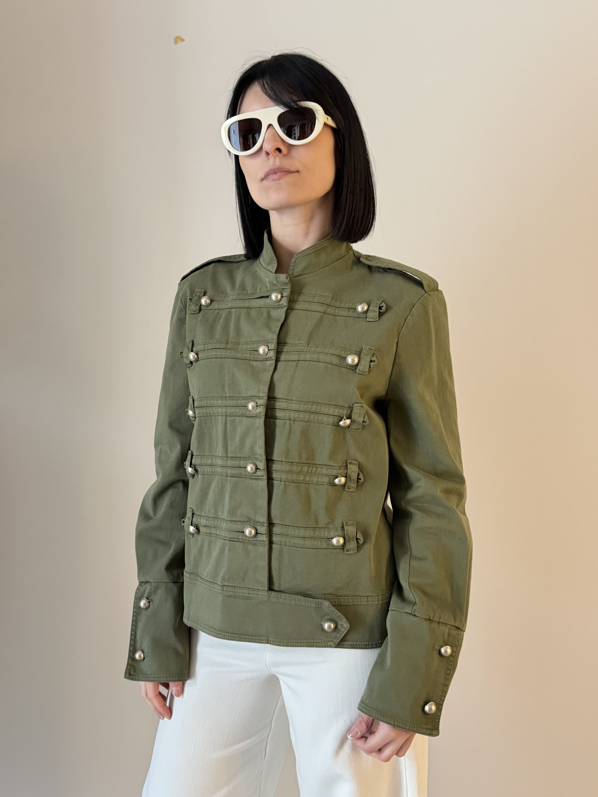 Tensione In Giacca dal design strutturato ispirato allo stile militare, caratterizzata da una linea pulita e dettagli decorativi che donano al capo un aspetto elegante e deciso. I bottoni metallici e le bande applicate sul davanti aggiungono carattere, rendendola ideale per completare look contemporanei e ricercati.