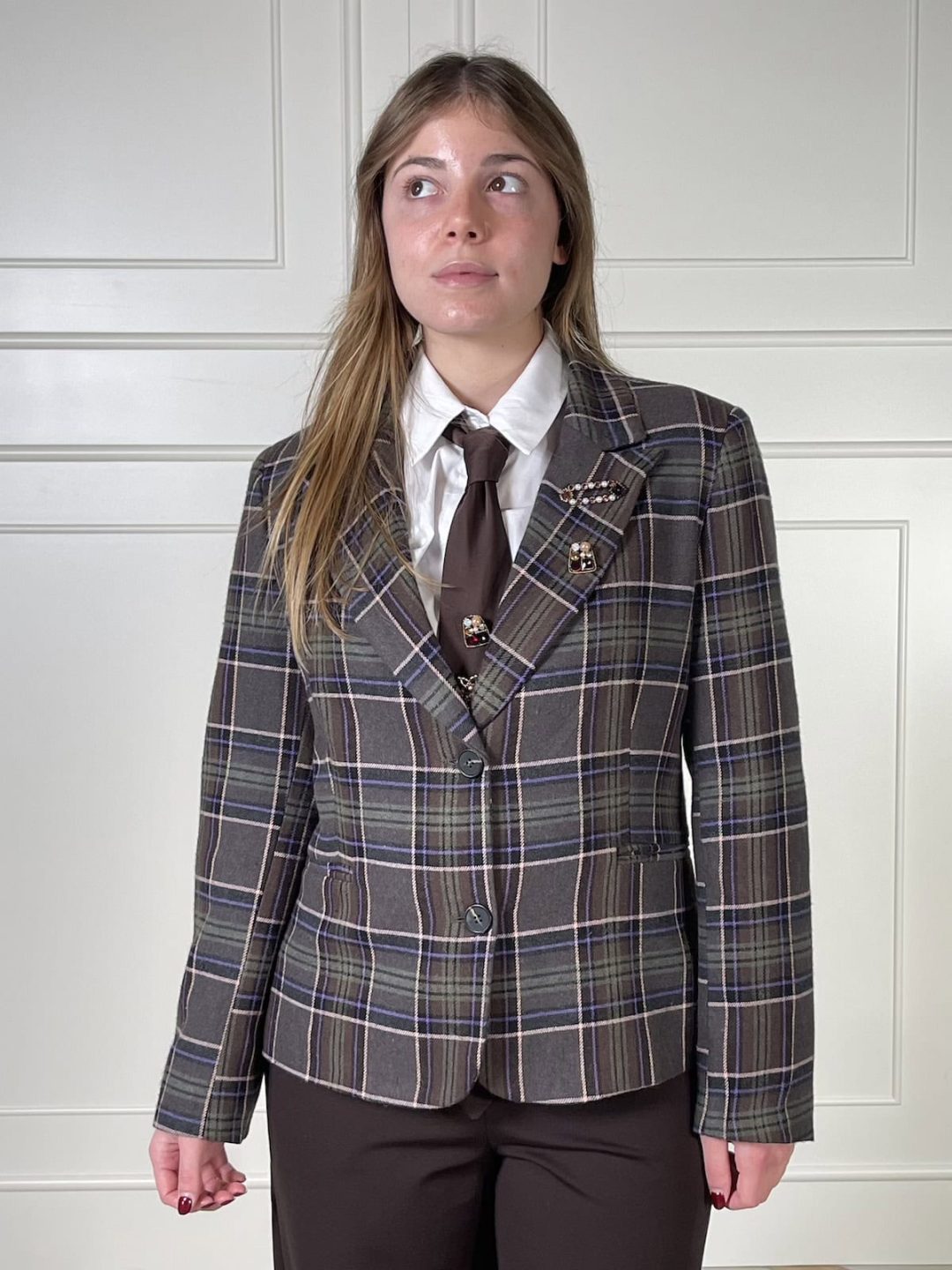 Tensione In giacca elegante dal taglio sartoriale in fantasia check, arricchita da spille decorative sul revers che aggiungono un tocco di originalità e carattere. Un capo versatile, perfetto per completare look sia casual che più raffinati.