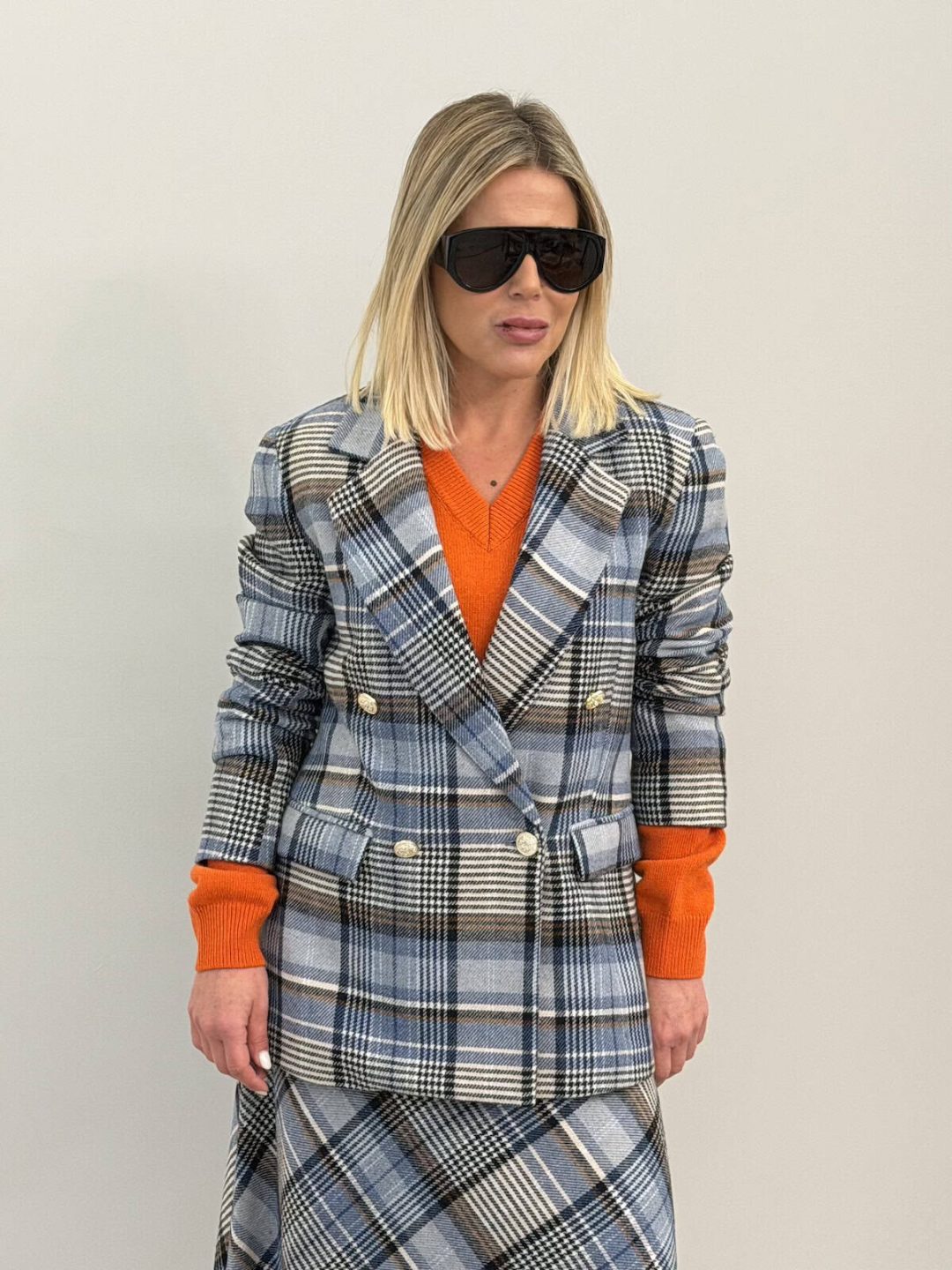 Taglio strutturato con revers classici e chiusura doppiopetto a bottoni dorati decorativi. Le spalle sono leggermente imbottite per dare definizione alla silhouette, mentre la lunghezza regolare la rende perfetta da indossare sia con pantaloni sartoriali che con denim.
