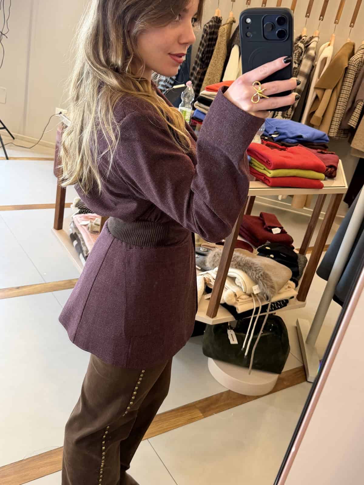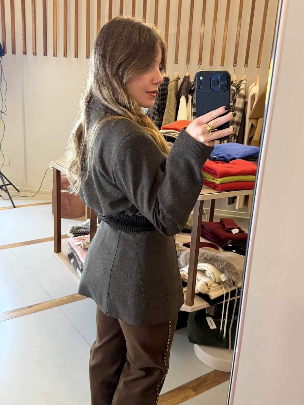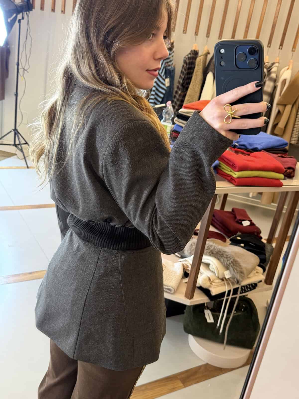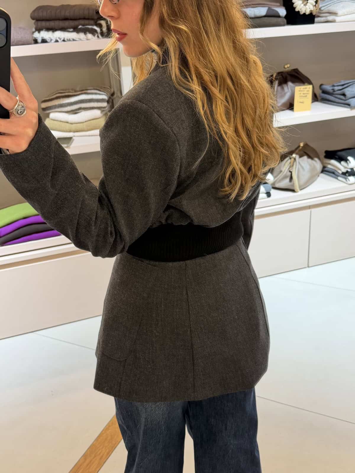 FitByDele giacca dalla linea pulita e attuale, progettata con un taglio strutturato sul fronte e un inserto elasticizzato sul retro che sottolinea il punto vita con eleganza. Un modello versatile che unisce comfort e stile.