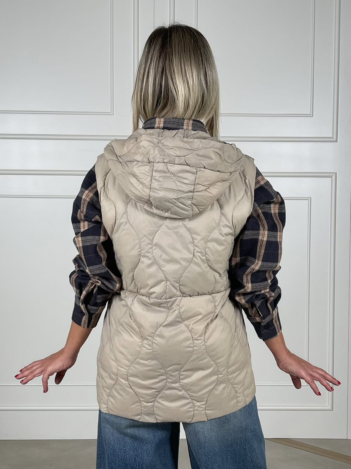 Gilet imbottito leggero, ideale per la mezza stagione. Il design trapuntato con motivo ondulato dona un tocco moderno e dinamico, mentre il cappuccio integrato lo rende pratico e funzionale. Perfetto da indossare sopra maglie o felpe per un look casual e sportivo.