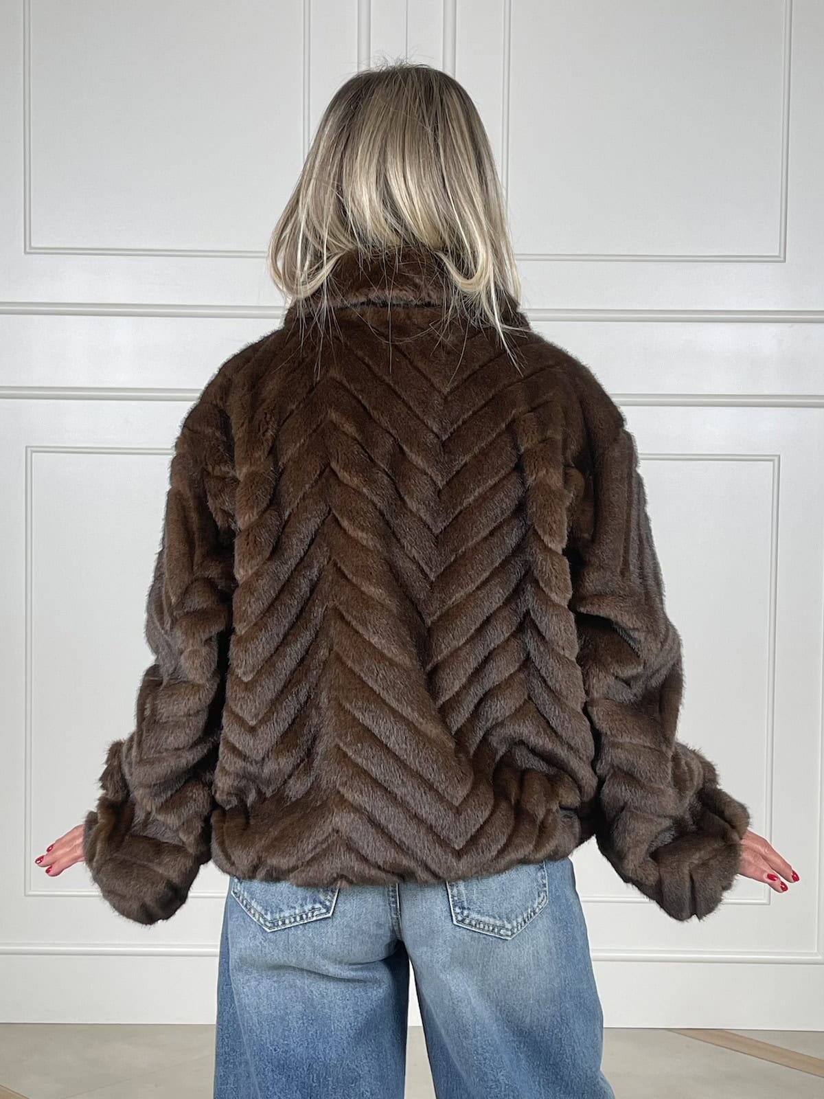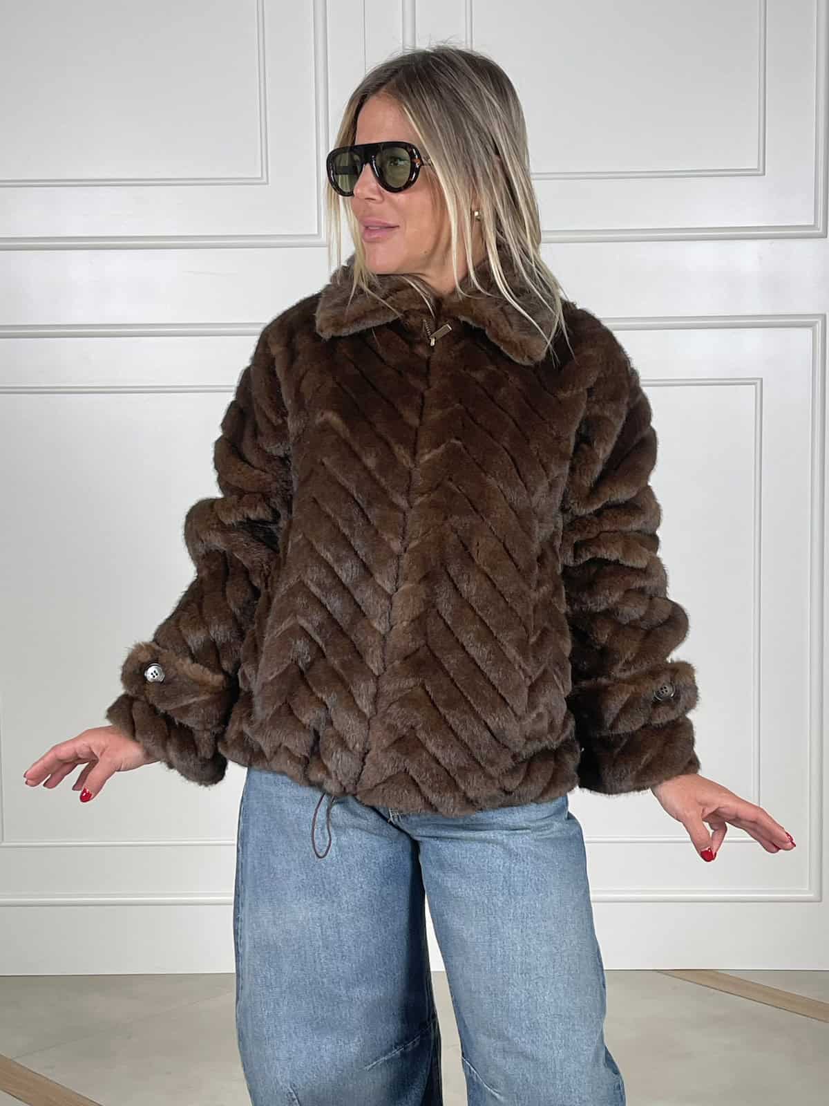 Vicolo giubbino eco-pelliccia, linea dritta con colletto maxi e chiusura frontale a zip