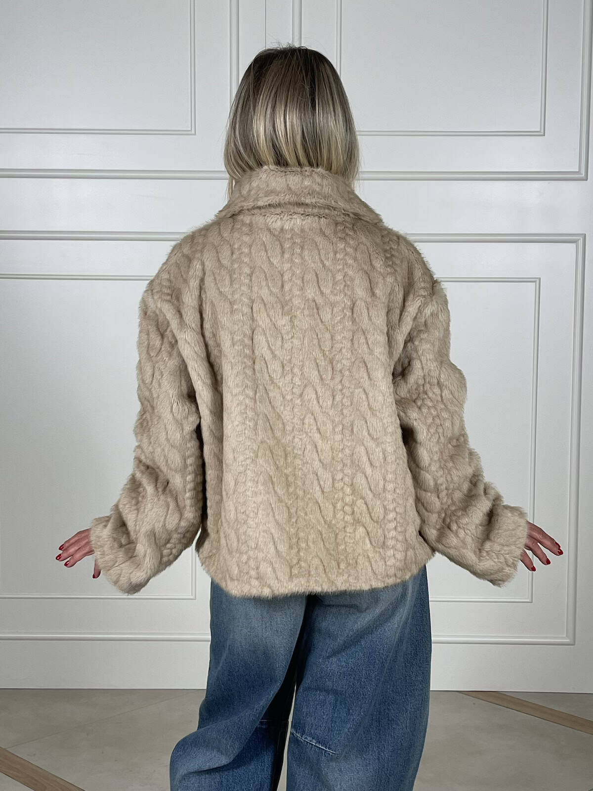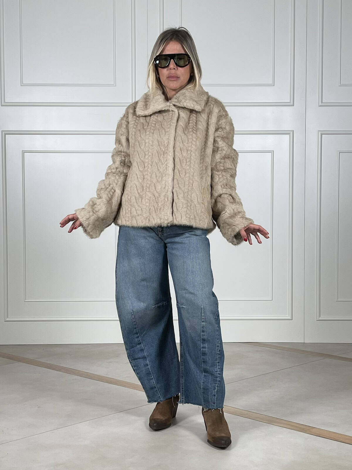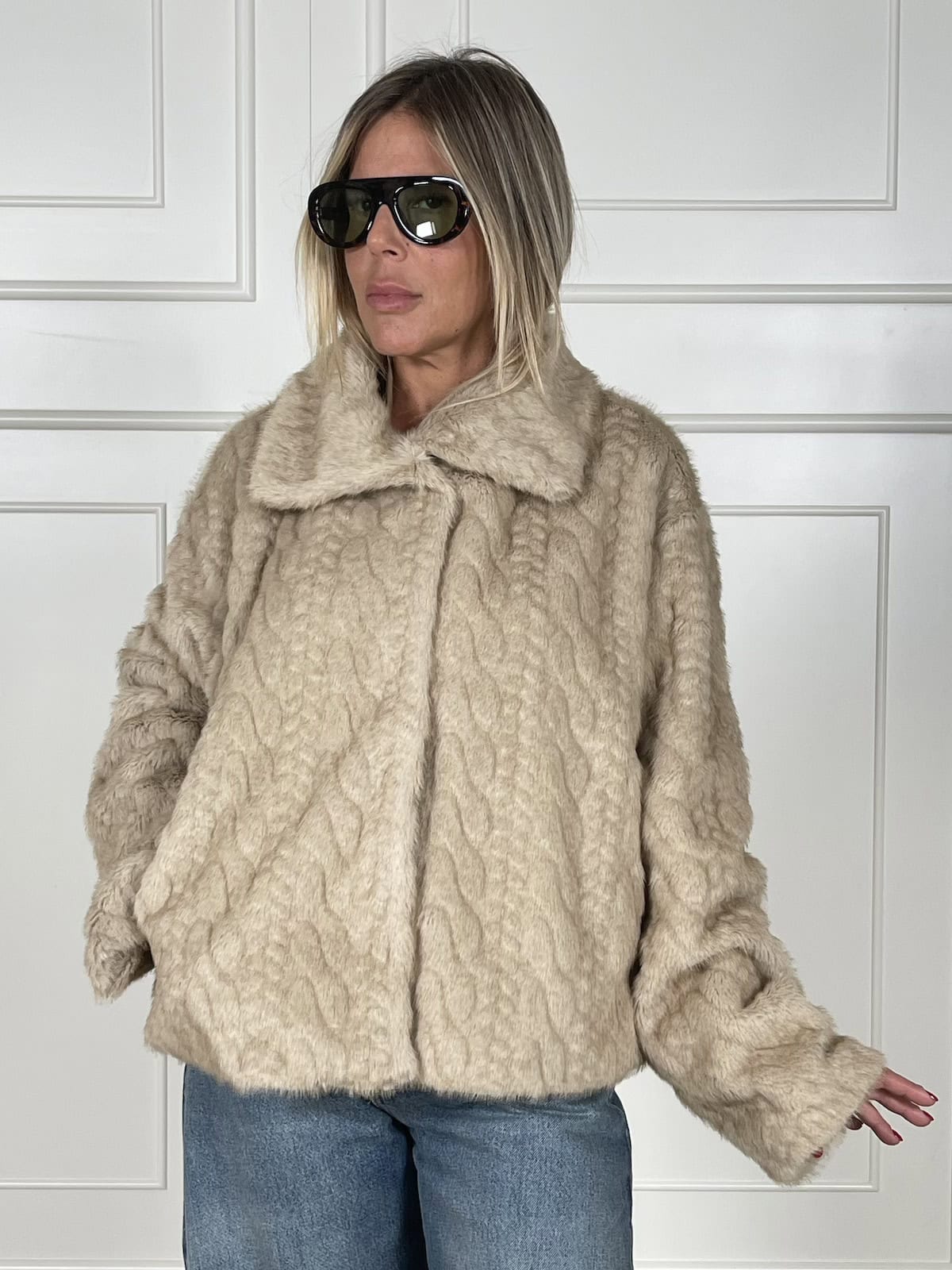Vicolo giubbino eco-pelliccia, linea dritta con colletto maxi e chiusura a bottoni.