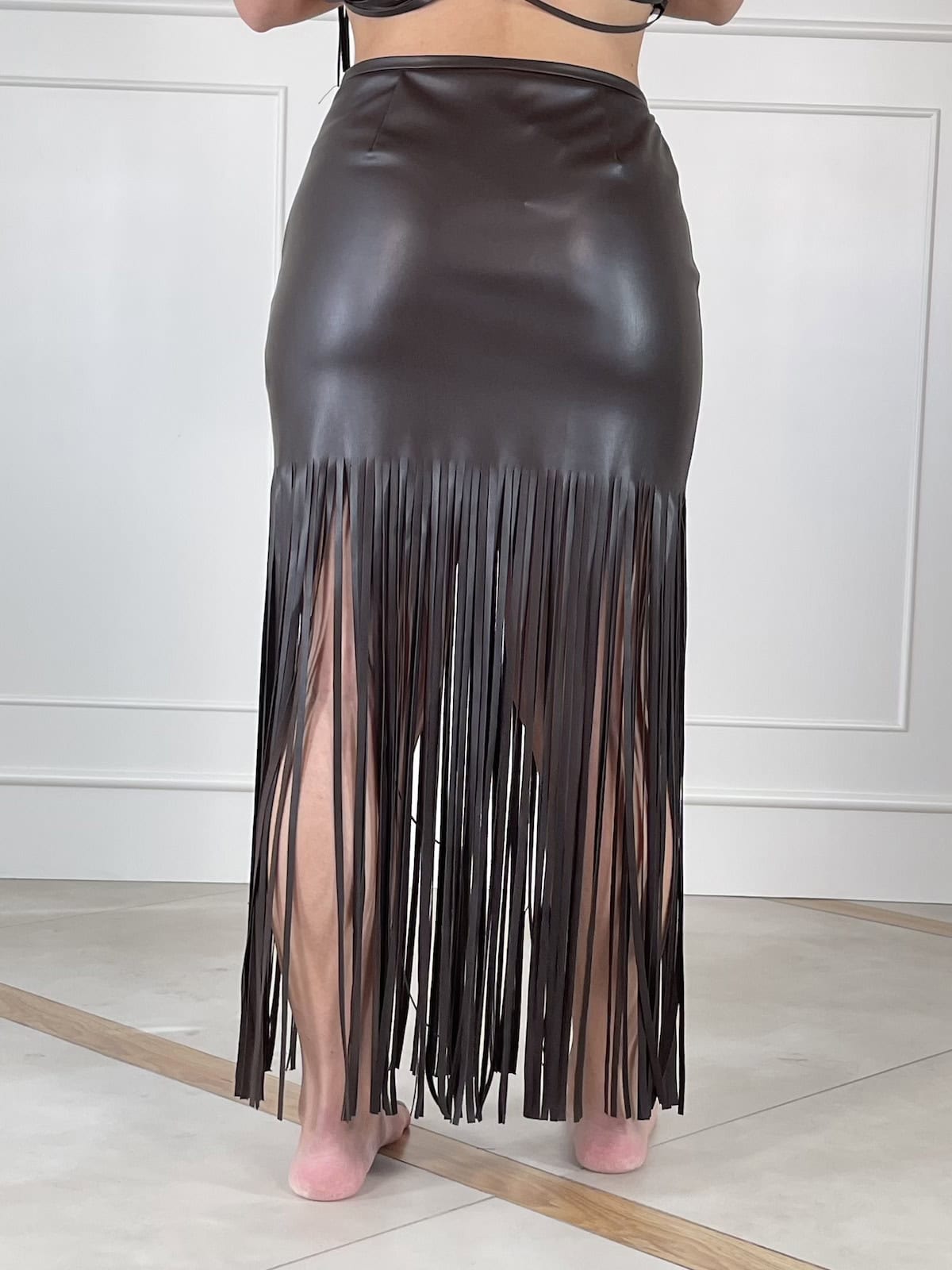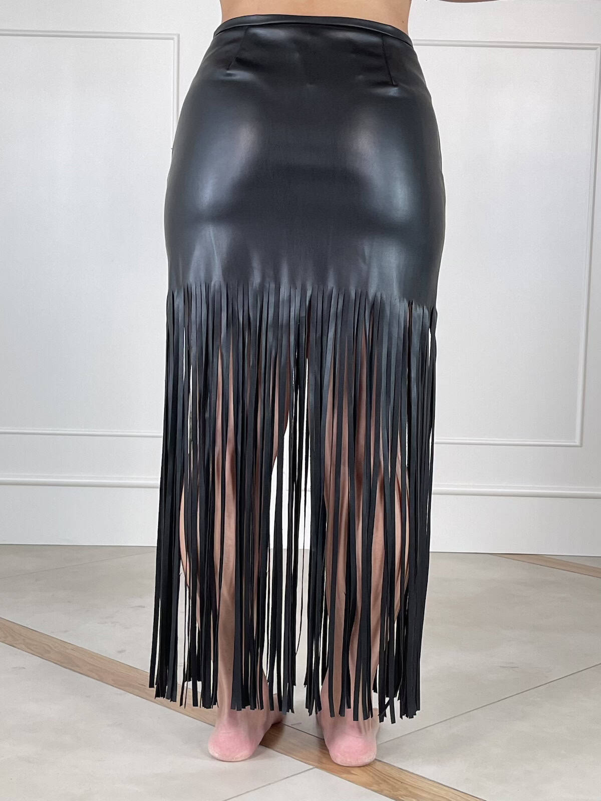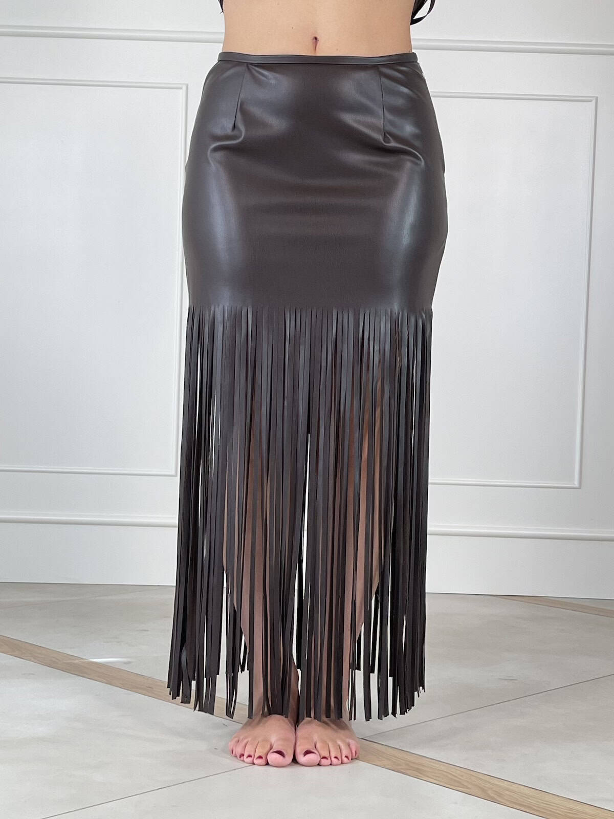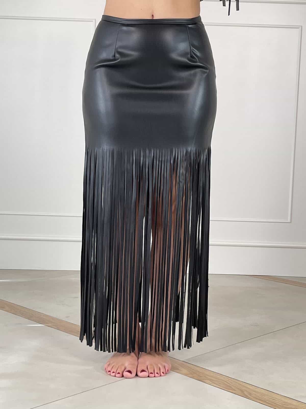 Tensione in gonna in ecopelle con frange dinamiche che aggiungono movimento e personalità ad ogni passo. La chiusura con zip laterale garantisce praticità, mentre le leggere pieghe sul davanti