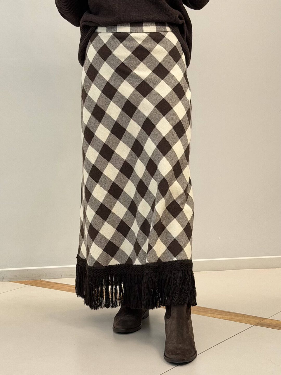 Tensione In gonna lunga dal fascino country-chic, caratterizzata dal motivo check diagonale e dalle frange decorative sul fondo. Un capo femminile e deciso, perfetto per look autunnali che combinano eleganza e personalità.