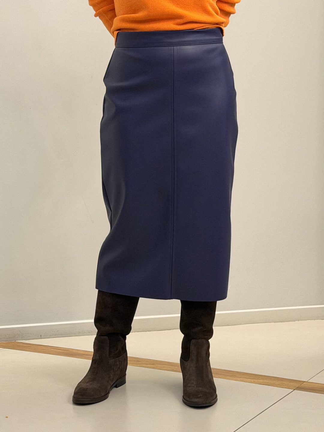 Linea dritta al ginocchio con spacco posteriore e chiusura a cerniera invisibile sul retro. Struttura aderente che segue armoniosamente le forme.