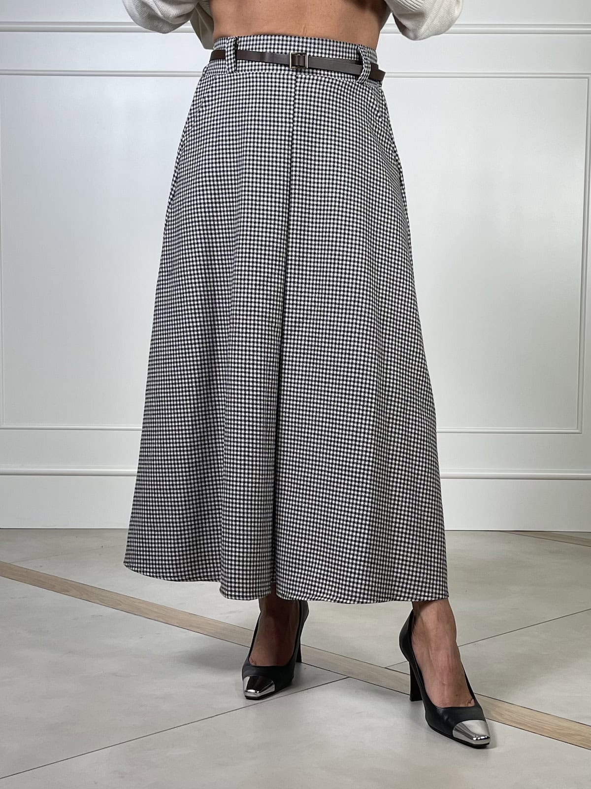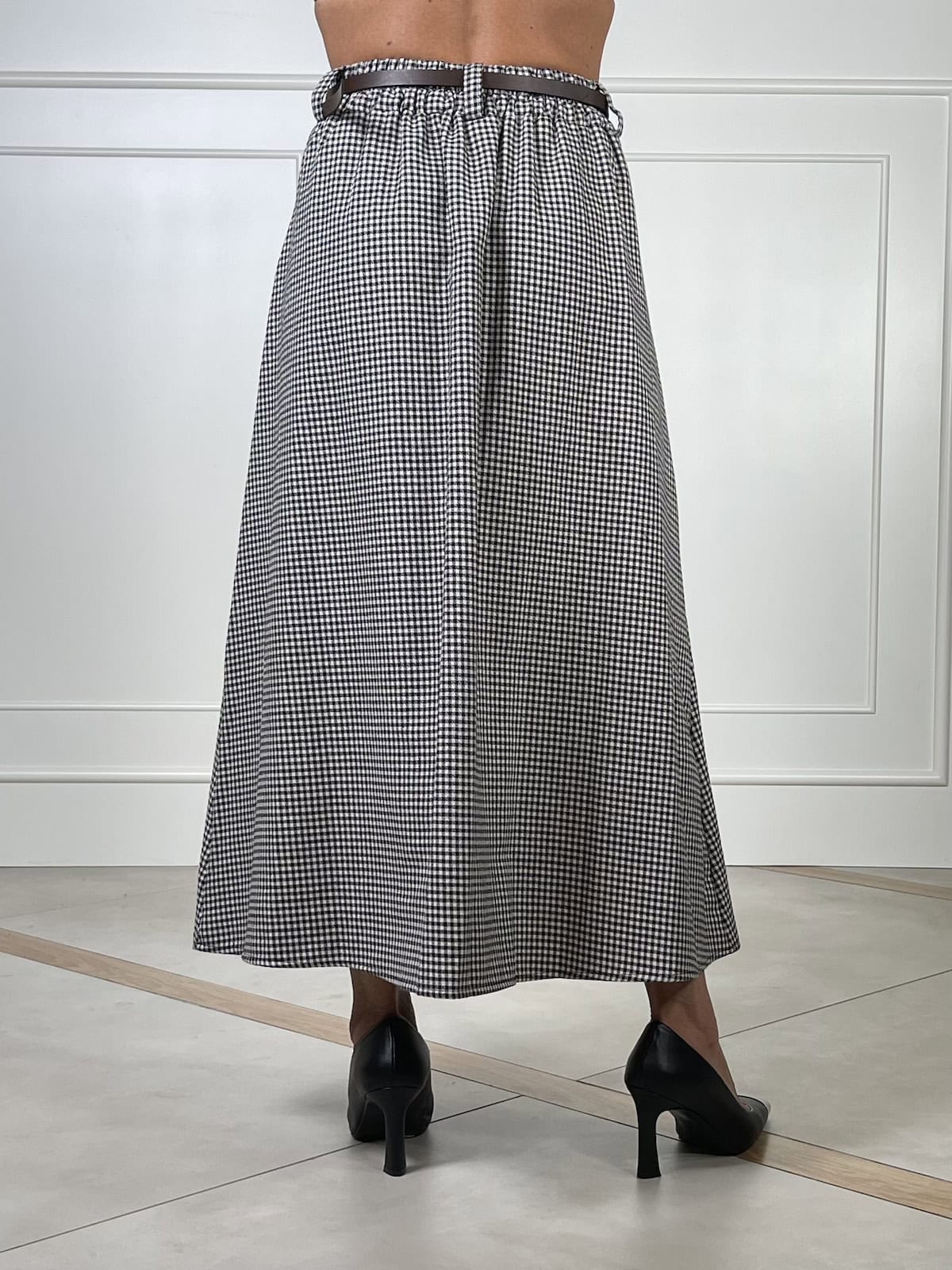 Tensione In gonna midi svasata in tessuto pied de poule con piega centrale frontale e vita elastica sul retro.