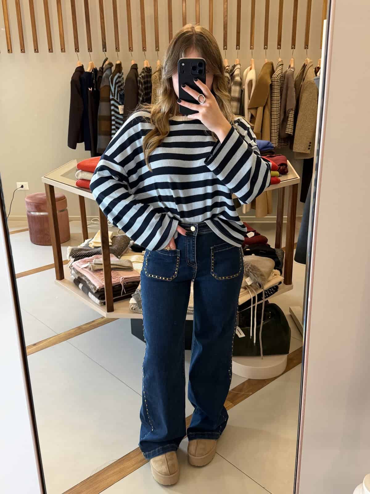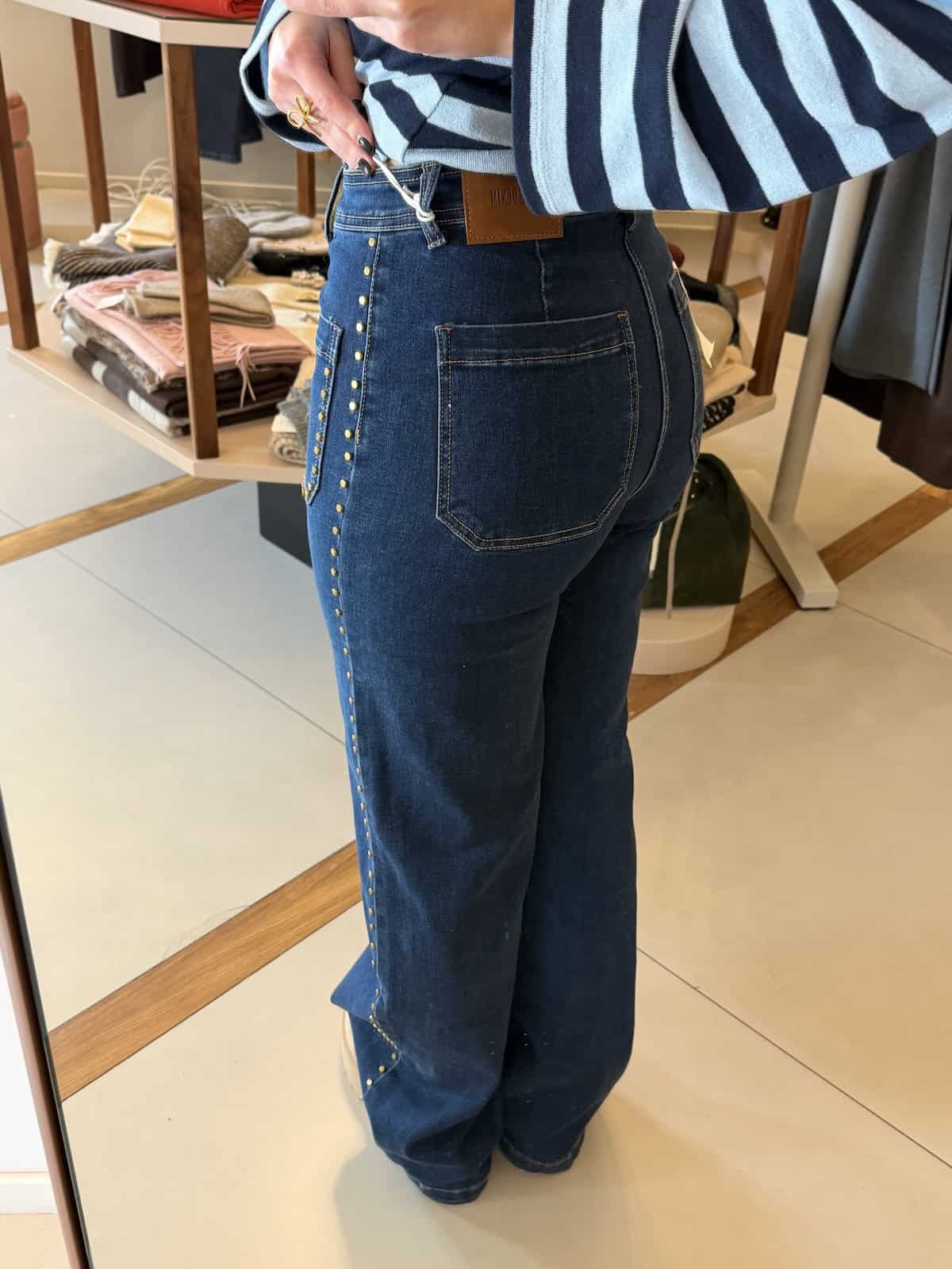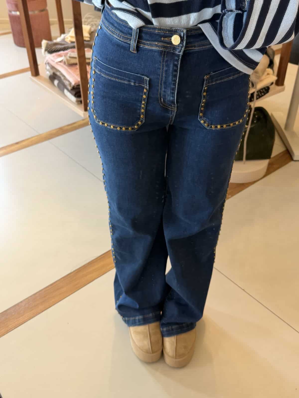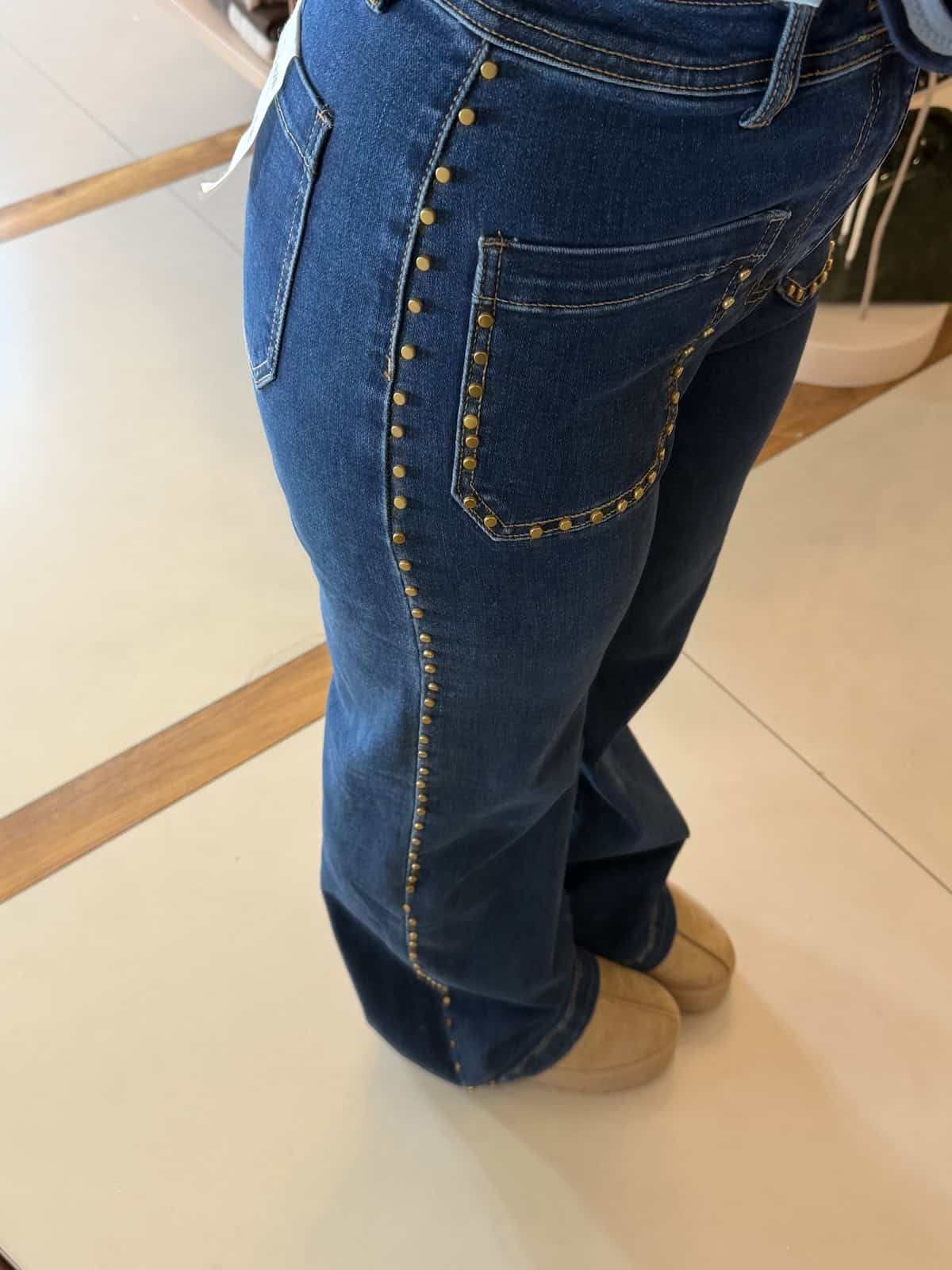 FitByDele pantaloni in denim a gamba dritta, impreziositi da borchie applicate lungo le tasche frontali e lungo le cuciture laterali. Presentano chiusura frontale con bottone e zip, passanti per cintura e tasche applicate sul davanti.
