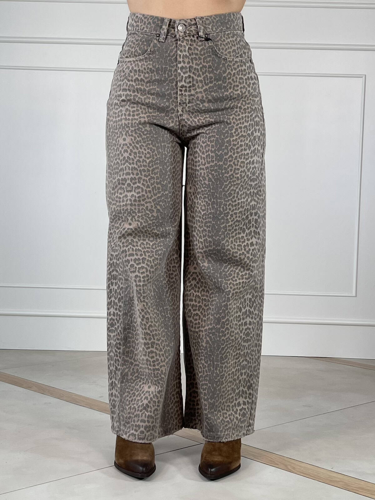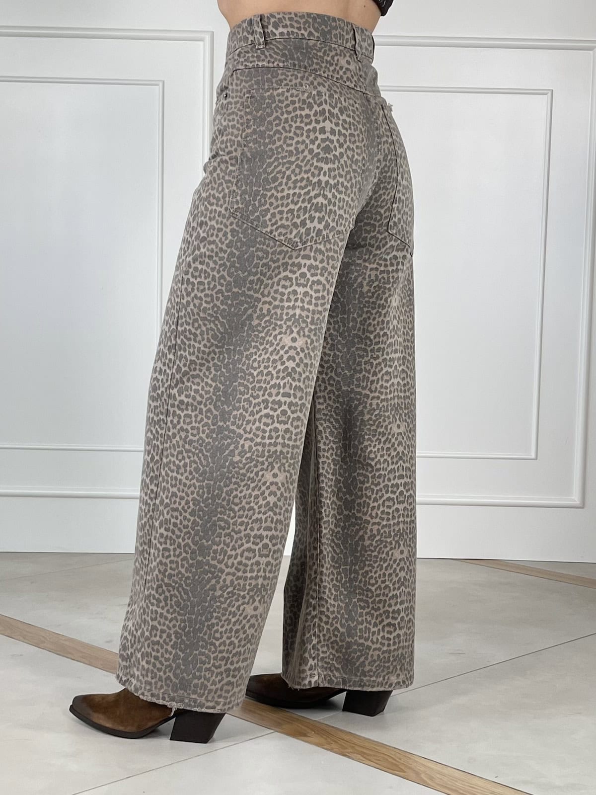 Tensione in jeans gamba larga Giusi in stampa macula. Modello a vita alta. Sfrangiato sul fondo. Vestibilità comoda