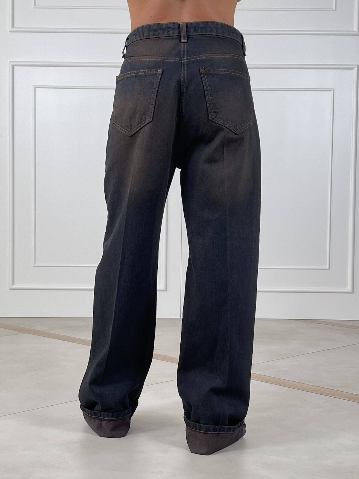 dal carattere unico, realizzato in denim di qualità e rifinito con tintura a mano che conferisce al capo sfumature esclusive e un effetto vissuto autentico. Un modello versatile e contemporaneo, perfetto per completare look casual o più sofisticati con un tocco artigianale.