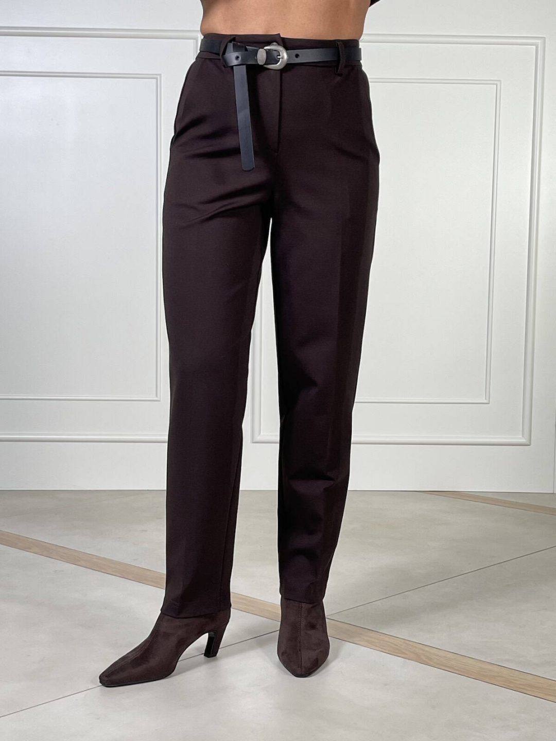 Pantalone a vita regolare con gamba leggermente affusolata verso il fondo. Chiusura frontale con bottone e zip, passanti per cintura e tasche laterali. Cintura coordinata con fibbia metallica inclusa.