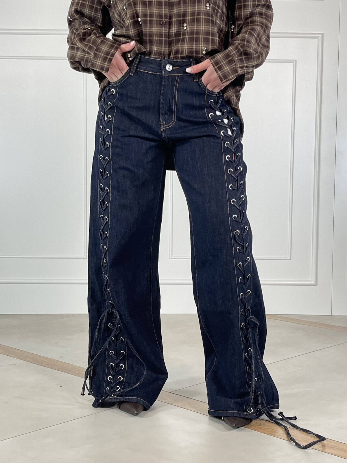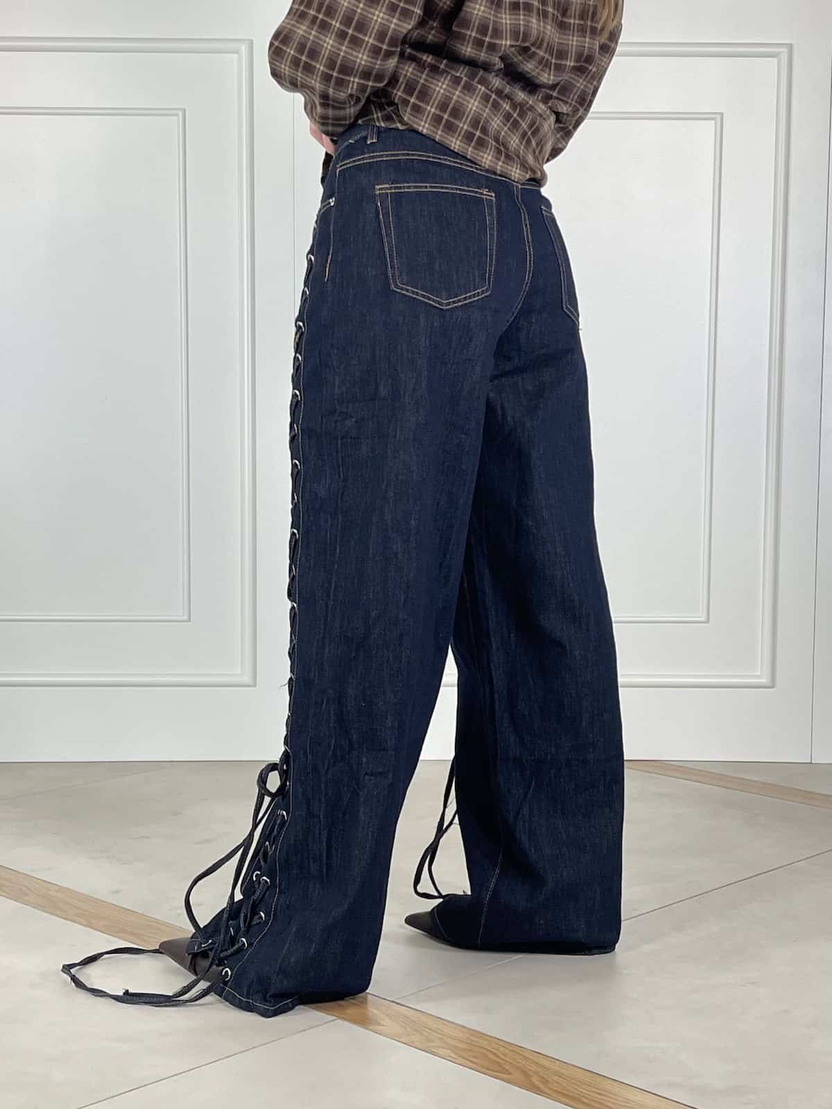 FitByDele pantalone jeans modello intreccio sul davanti con lacci sul fondo.