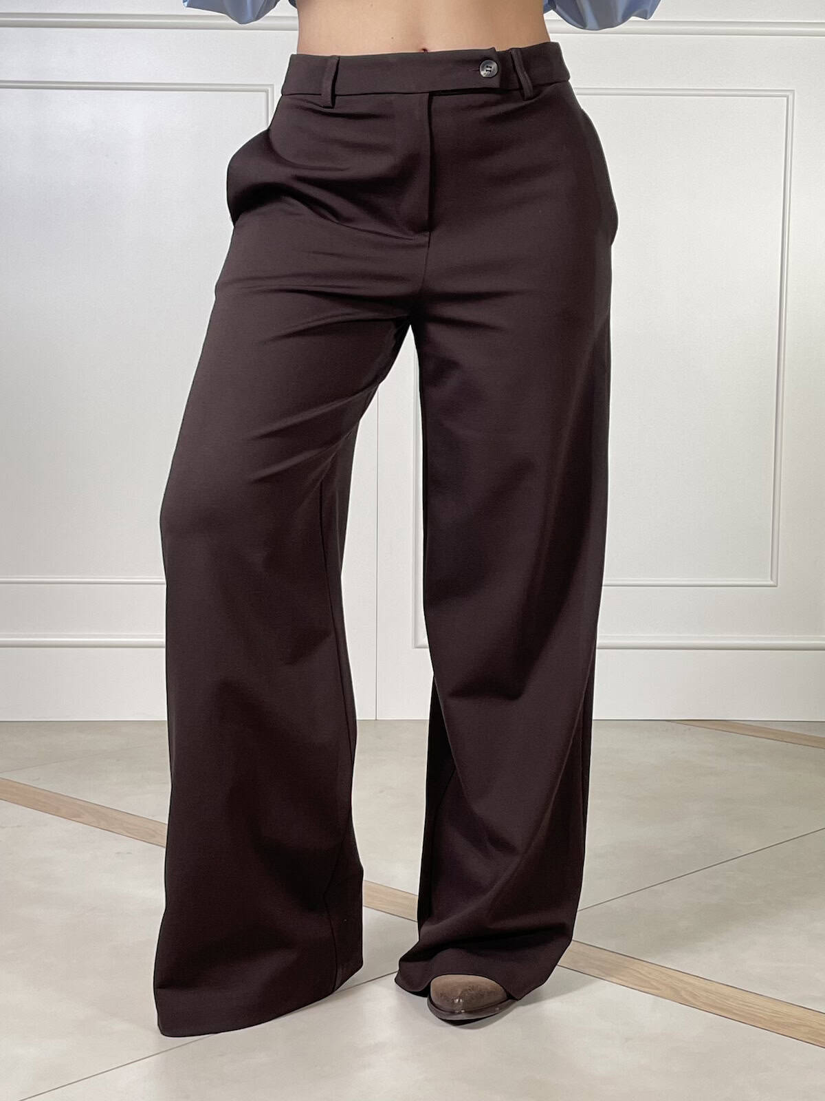 Linea palazzo a vita regolare con chiusura frontale a bottone e zip, passanti per cintura e tasche laterali. Gamba ampia e fluida che slancia la figura.