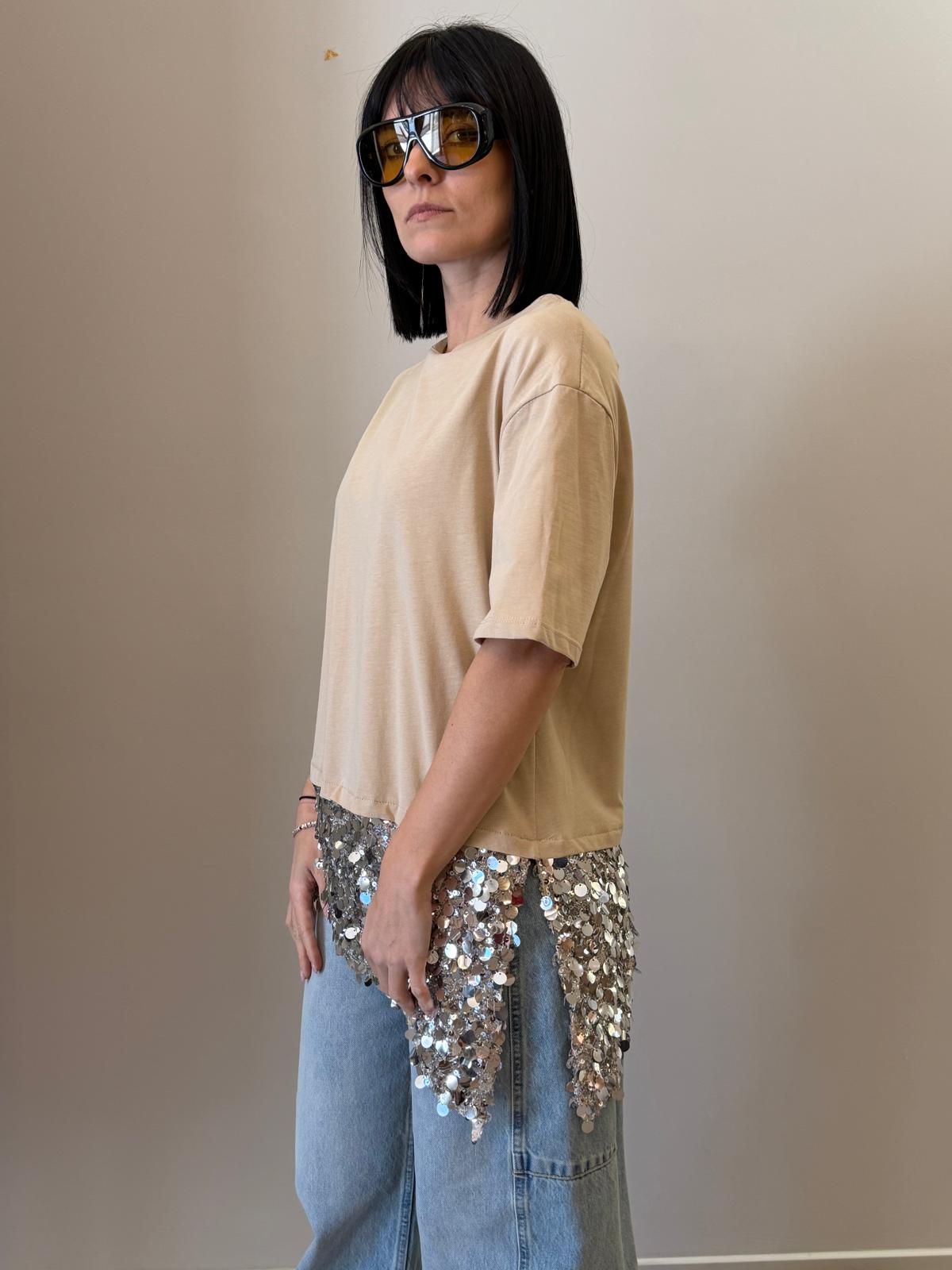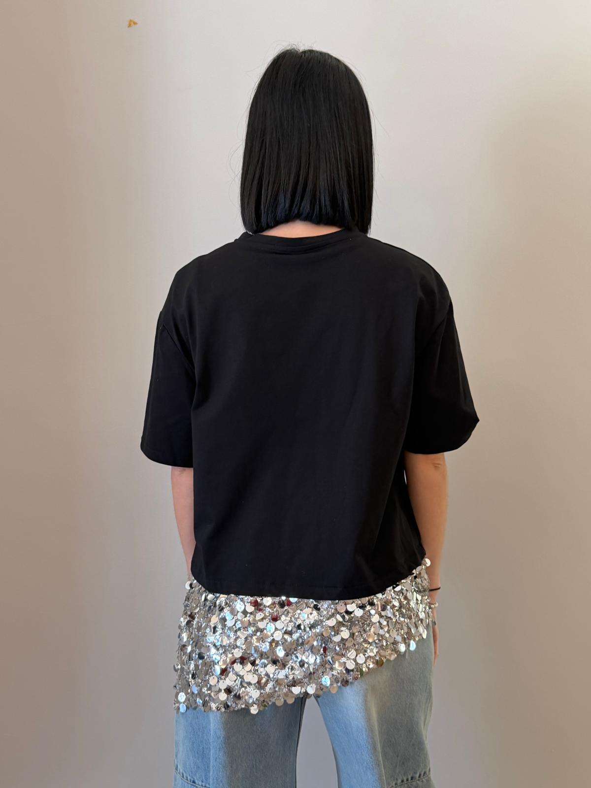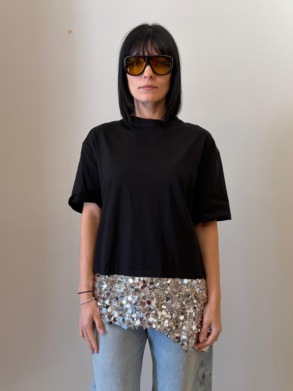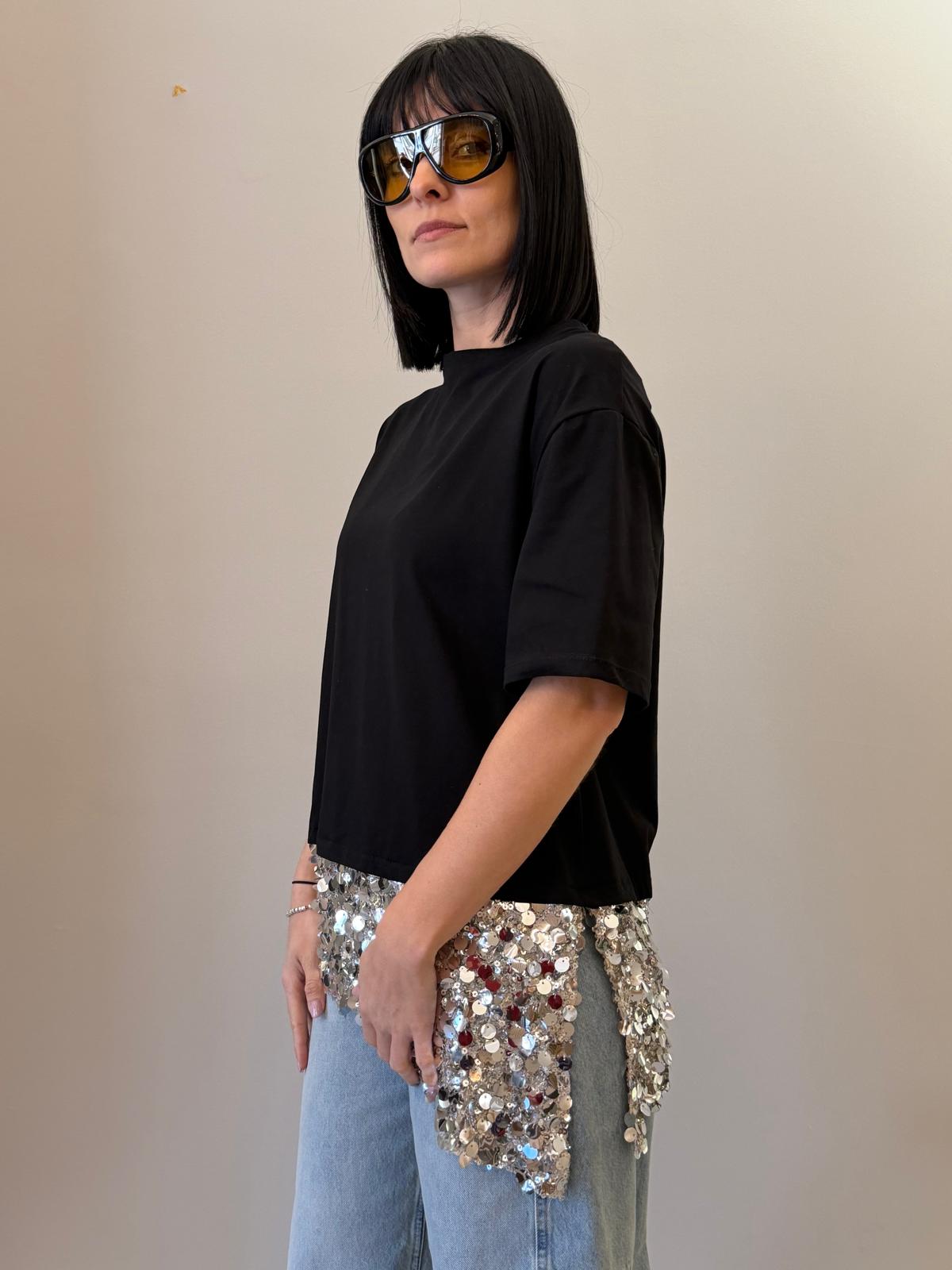 Un capo essenziale arricchito da un dettaglio luminoso che lo rende unico. Questa t-shirt presenta una linea pulita e minimal nella parte superiore, impreziosita da un inserto in paillettes sul fondo che dona luce e movimento.