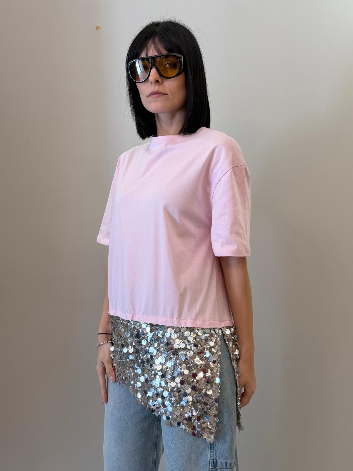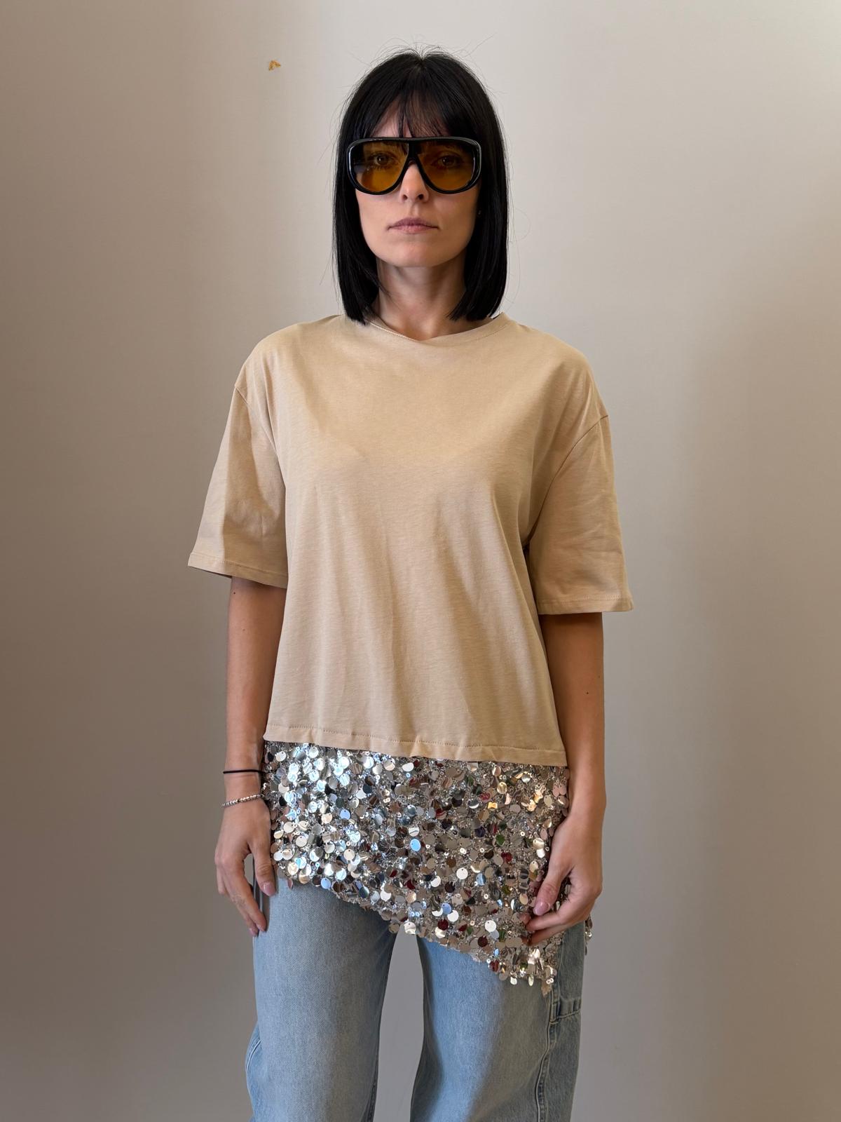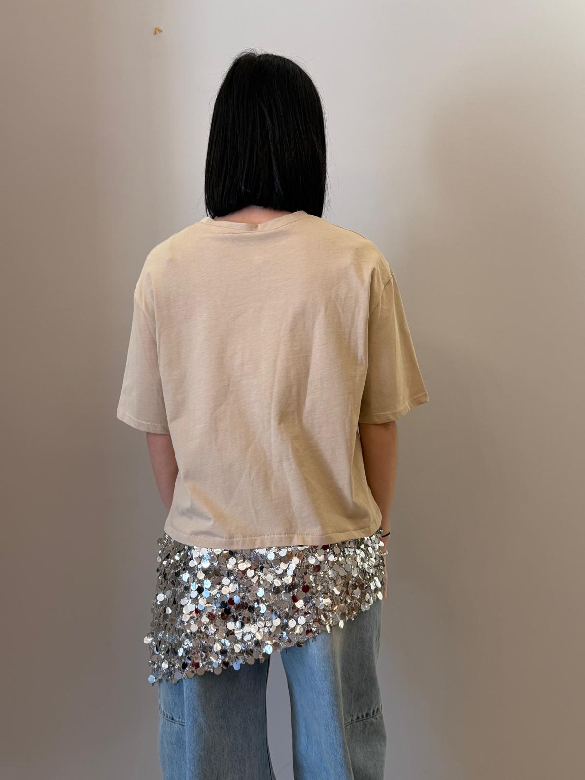 Un capo essenziale arricchito da un dettaglio luminoso che lo rende unico. Questa t-shirt presenta una linea pulita e minimal nella parte superiore, impreziosita da un inserto in paillettes sul fondo che dona luce e movimento.