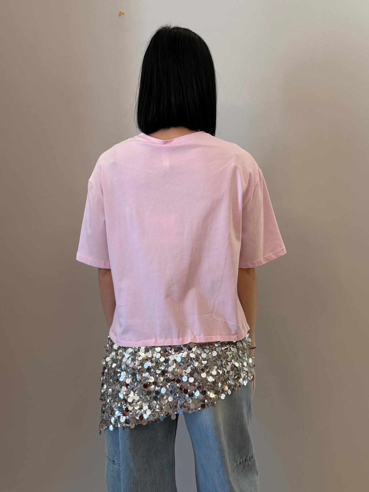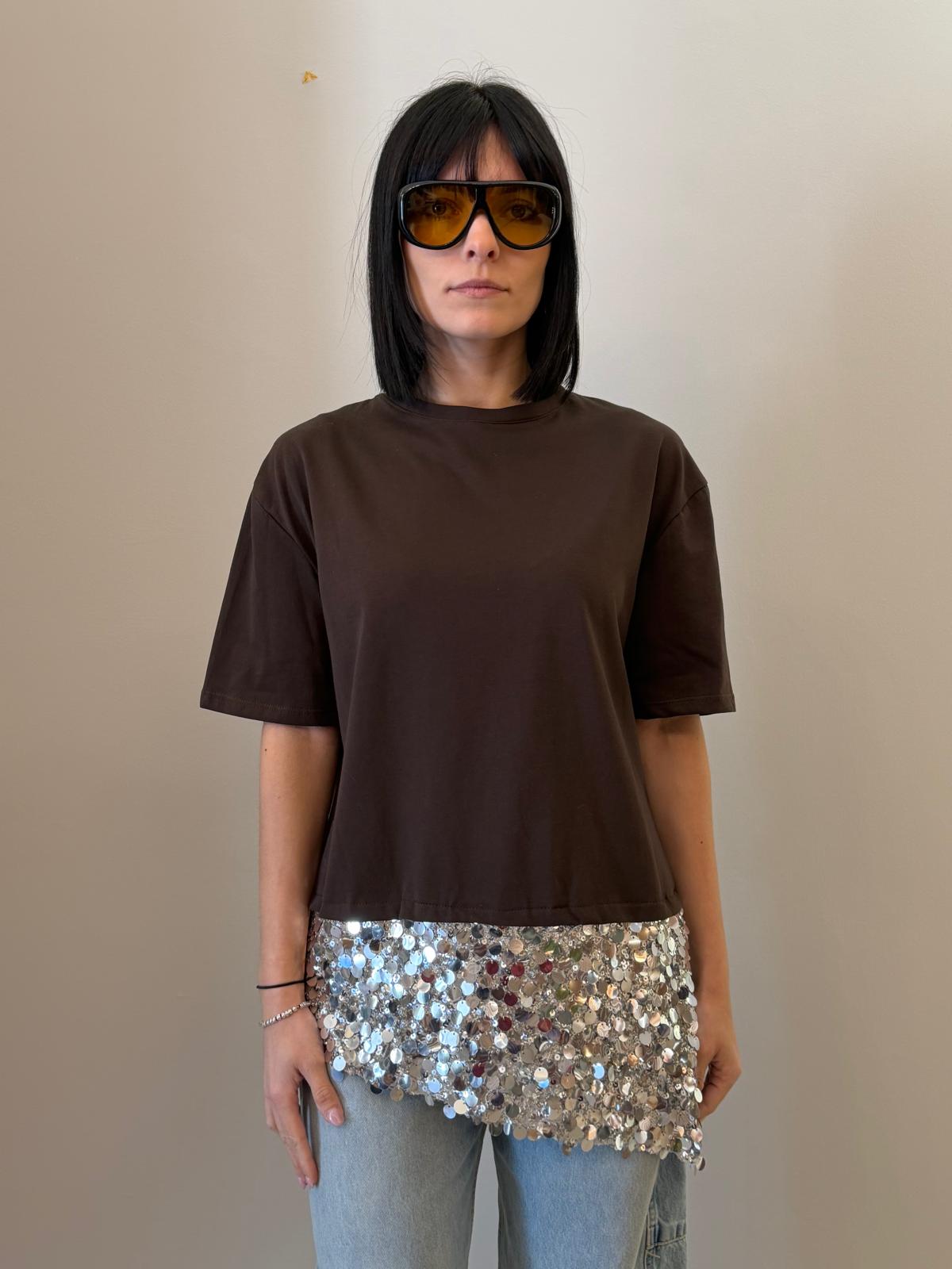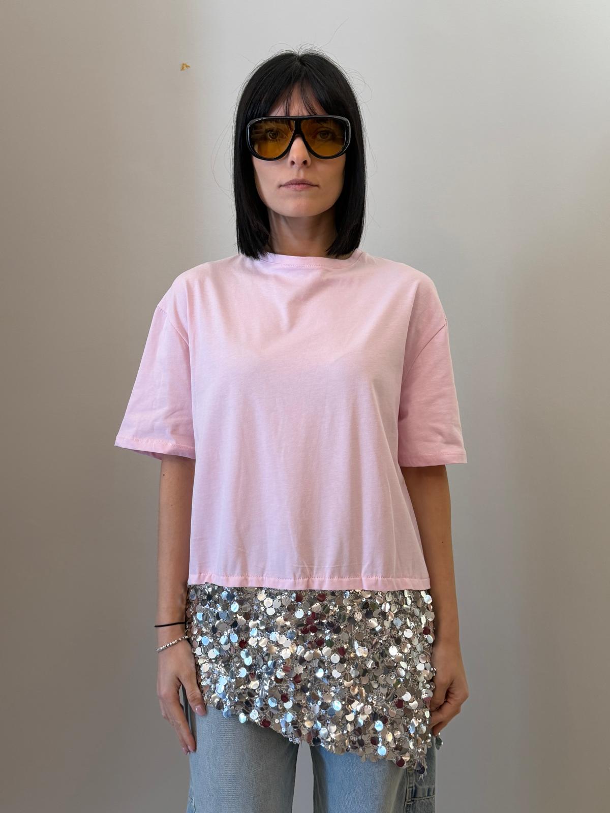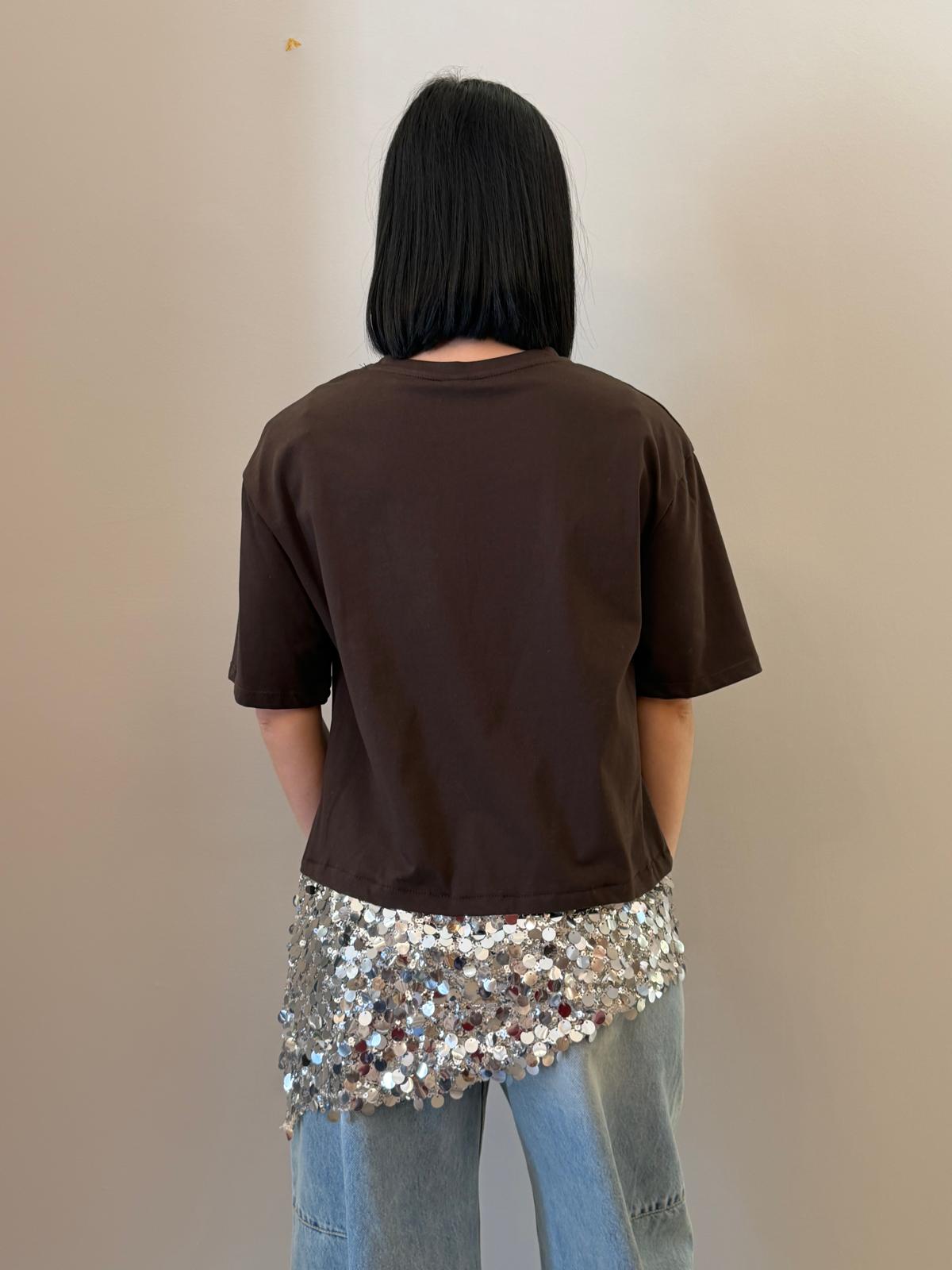 Un capo essenziale arricchito da un dettaglio luminoso che lo rende unico. Questa t-shirt presenta una linea pulita e minimal nella parte superiore, impreziosita da un inserto in paillettes sul fondo che dona luce e movimento.