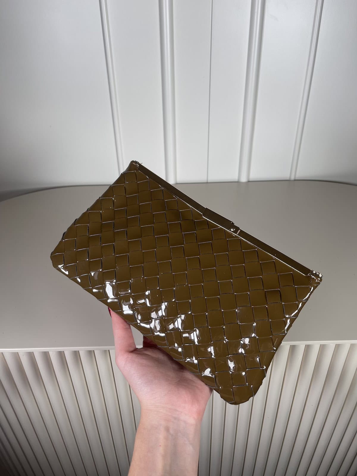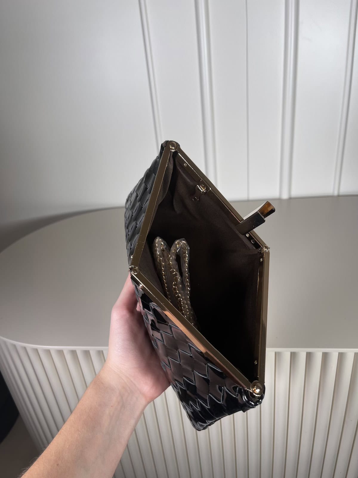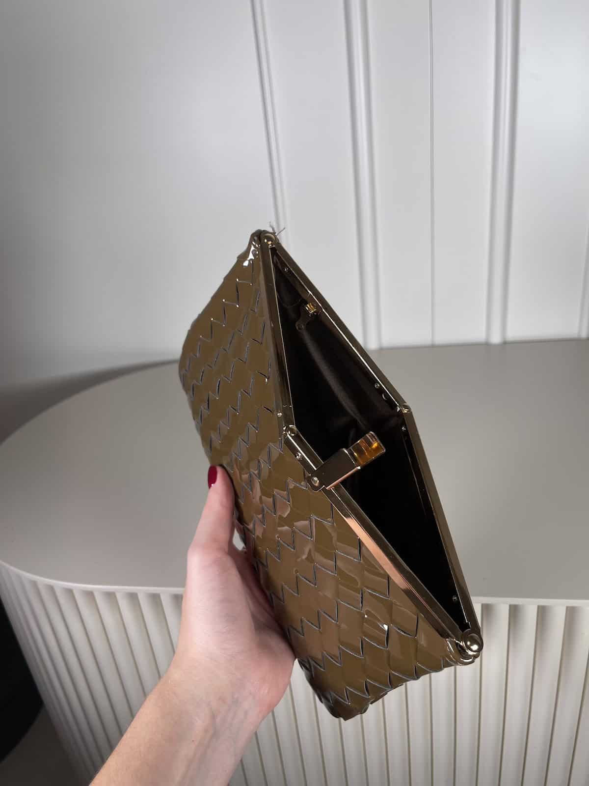 FitByDele pochette in ecopelle lucida intrecciata chiusura a scatto con tracolla in catena